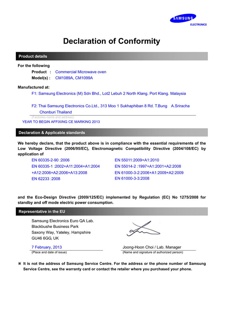 Declaration of Conformity Product details For the following Product : Commercial Microwave oven Model(s) : CM1089A, CM1099A Manufactured at: F1: Samsung Electronics (M) Sdn Bhd., Lot2 Lebuh 2 North Klang. Port Klang. Malaysia F2: Thai Samsung Electronics Co.Ltd., 313 Moo 1 Sukhaphiban 8 Rd. T.Bung A.Sriracha Chonburi Thailand (Factories name and address) YEAR TO BEGIN AFFIXING CE MARKING 2013 Declaration & Applicable standards We hereby declare, that the product above is in compliance with the essential requirements of the Low Voltage Directive (2006/95/EC), Electromagnetic Compatibility Directive (2004/108/EC) by application of EN 60335-2-90 :2006 EN 55011:2009+A1:2010 EN 60335-1 :2002+A11:2004+A1:2004 EN 55014-2 :1997+A1:2001+A2:2008 +A12:2006+A2:2006+A13:2008 EN 61000-3-2:2006+A1:2009+A2:2009 EN 61000-3-3:2008 EN 62233 :2008 and the Eco-Design Directive (2009/125/EC) implemented by Regulation (EC) No 1275/2008 for standby and off mode electric power consumption. Representative in the EU Samsung Electronics Euro QA Lab. Blackbushe Business Park Saxony Way, Yateley, Hampshire GU46 6GG, UK 7 February, 2013 Joong-Hoon Choi / Lab. Manager (Place and date of issue) (Name and signature of authorized person) ※ It is not the address of Samsung Service Centre. For the address or the phone number of Samsung Service Centre, see the warranty card or contact the retailer where you purchased your phone. TŁUMACZENIE DEKLARACJA ZGODNOŚCI Szczegóły produktu Dla następujących Produkt: Profesjonalna kuchenka mikrofalowa Model: CM1089A (775412), CM1099A (775313) Produkowane w: F1: Samsung Electronics (M) Sdn Bhd., Lot2 Lebuh 2 North Klang. Port Klang. Malaysia F2: Thai Samsung Electronics Co.Ltd., 313 Moo 1 Sukhaphiban 8 Rd. T.Bung A.Sriracha Chonburi Thailand Deklaracja i zastosowanie standardów Niniejszym oświadczamy, że produkty wymienione powyżej są zgodne z wymaganiami opisanymi w Dyrektywach: Niskonapięciowy sprzęt elektryczny (LVD) (2006/95/EC) Kompatybilność elektromagnetyczna (EMC) (2004/108/WE) zgodnie z normami: EN 60335-2-90 :2006EN 55011:2009+A1:2010 EN 60335-1 :2002+A11:2004+A1:2004 EN 55014-2 :1997+A1:2001+A2:2008 +A12:2006+A2 :2006+A13:2008 EN 61000-3-2:2006+ A1:2009+A2 :2009 EN 62233 :2008EN 61000-3-3:2008 Oraz Dyrektywy Ekoprojektu (2009/125/EC) wprowadzona rozporządzeniem (WE) nr 1275/2008 dla czuwania i wyłączenia trybu zużycia energii elektrycznej. Przedstawiciel w UE Samsung Electronics Euro QA Lab. Blackbushe Business Park Saxony Way, Yateley, Hampshire GU46 6GG, UK 07 Luty 2013 Joong-Hoon Choi / Lab. Manager Wpis do rejestru: XIII Wydział Gospodarczy Krajowego Rejestru Sadowego, KRS 0000010073, NIP 952-18-66-652, Kapitał zakładowy PLN 150.000,- Stalgast sp. z o.o. ul. Staniewicka 5 03-310 Warszawa tel.: 022 517 15 75 fax: 022 517 15 77 www.stalgast.com email: [email protected]