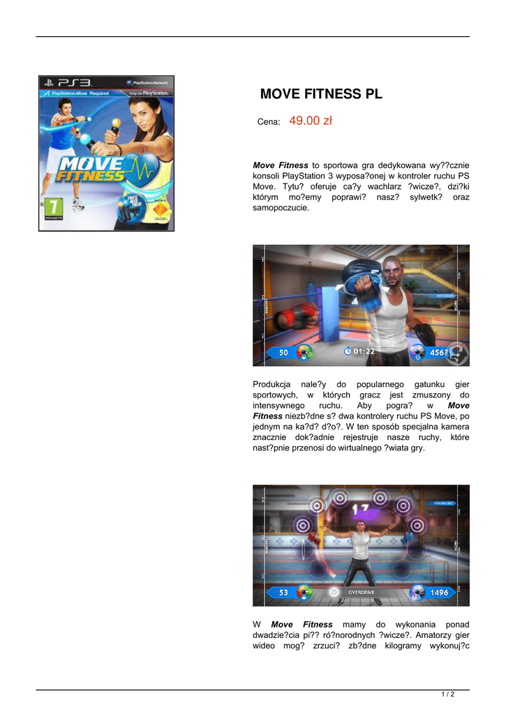 MOVE FITNESS PL Cena: 49.00 zł Move Fitness to sportowa gra dedykowana wy??cznie konsoli PlayStation 3 wyposa?onej w kontroler ruchu PS Move. Tytu? oferuje ca?y wachlarz ?wicze?, dzi?ki którym mo?emy poprawi? nasz? sylwetk? oraz samopoczucie. Produkcja nale?y do popularnego gatunku gier sportowych, w których gracz jest zmuszony do intensywnego ruchu. Aby pogra? w Move Fitness niezb?dne s? dwa kontrolery ruchu PS Move, po jednym na ka?d? d?o?. W ten sposób specjalna kamera znacznie dok?adnie rejestruje nasze ruchy, które nast?pnie przenosi do wirtualnego ?wiata gry. W Move Fitness mamy do wykonania ponad dwadzie?cia pi?? ró?norodnych ?wicze?. Amatorzy gier wideo mog? zrzuci? zb?dne kilogramy wykonuj?c 1/2 „pajacyki”, rzucaj?c pi?kami do kosza czy boksuj?c worek treningowy. Dzi?ki informacjom widocznym na ekranie ?atwo mo?emy dowiedzie? si? ile kalorii spalili?my. Wirtualny trener kontroluje nasze post?py w grze i poleca nam kolejne ?wiczenia, które powinny pomóc nam w osi?gni?ciu idealnej sylwetki. Co wi?cej, gra zawiera specjalne opcje pozwalaj?ce na stworzenie w?asnego programu ?wicze?. Zobacz wideo: 2/2 Powered by TCPDF (www.tcpdf.org)