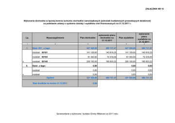 ZAŁĄCZNIK NR 10 Wykonanie dochodów w łącznej kwocie rachunku dochodów samorządowych jednostek budżetowych prowadzących działalność na podstawie ustawy o systemie oświaty i wydatków nimi finansowanych na 31.12.2011 r. Lp. Wyszczególnienie Plan dochodów 1 2 3 I. x II. x wykonanie planu dochodów na 31.12.2011 Plan wydatków wykonanie planu wydatków na 31.12.2011 4 5 Dział 801 , z tego: 427 529,00 408 737,47 427 529,00 408 737,47 rozdział: 80101 141 129,00 140 816,25 141 129,00 140 816,25 rozdział: 80104 81 300,00 72 418,00 81 300,00 72 418,00 rozdział: 80148 205 100,00 195 503,22 205 100,00 195 503,22 Dział , z tego: 0,00 0,00 0,00 rozdział 0,00 0,00 0,00 0,00 0,00 0,00 427 529,00 408 737,47 rozdział Ogółem 427 529,00 Stan środków na koniec 31.12.2011 408 737,47 0,00 Sprawozdanie z wykonania budżetu Gminy Miłakowo za 2011 roku