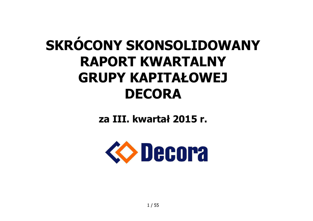 SKRÓCONY SKONSOLIDOWANY RAPORT KWARTALNY GRUPY KAPITAŁOWEJ DECORA za III. kwartał 2015 r. 1 / 55 SKRÓCONE SKONSOLIDOWANE SPRAWOZDANIE FINANSOWE GRUPY KAPITAŁOWEJ DECORA ZA OKRES 9 MIESIĘCY ZAKOŃCZONY 30. WRZEŚNIA 2015 ROKU WYBRANE DANE FINANSOWE GRUPY KAPITAŁOWEJ DECORA tys. PLN III kwartał 2015 od 2015-07-01 do 2015-09-30 Przychody netto ze sprzedaży produktów, towarów i materiałów Zysk (strata) brutto ze sprzedaży Zysk (strata) ze sprzedaży Zysk (strata) z działalności operacyjnej EBITDA Zysk (strata) brutto Zysk (strata) netto Przepływy pieniężne netto z działalności operacyjnej Przepływy pieniężne netto z działalności inwestycyjnej Przepływy pieniężne netto z działalności finansowej Przepływy pieniężne netto – razem Aktywa/Pasywa razem Aktywa trwałe Aktywa obrotowe Kapitał własny przypadający akcjonariuszom emitenta Zobowiązania i rezerwy na zobowiązania Zobowiązania długoterminowe Zobowiązania krótkoterminowe Liczba akcji Zysk (strata) na jedną akcję zwykłą (w zł / EUR ) Wartość księgowa na jedną akcję (w zł /EUR ) 54 18 3 1 3 134 356 842 114 225 87 -384 12 538 -468 -4 570 7 500 221 047 105 744 115 303 138 314 82 733 2 987 72 724 11 303 320 -0,03 12,24 III kwartał 2014 od 2014-07-01 do 2014-09-30 77 283 24 561 6 558 6 251 8 946 4 008 3 560 7 049 -2 645 -6 255 -1 851 252 282 116 351 135 931 148 114 104 168 9 303 94 865 11 303 320 0,31 13,10 2 / 55 tys. EUR IV kwartały 2014 od 2014-01-01 do 2014-12-31 272 624 92 411 12 604 10 148 20 658 -7 230 -7 721 20 426 -7 509 -8 837 4 080 231 838 111 627 120 211 137 125 93 713 8 532 86 181 11 303 320 -0,68 12,13 III kwartał 2015 od 2015-07-01 do 2015-09-30 13 018 4 414 924 268 776 21 -92 3 015 -113 -1 099 1 804 52 151 24 948 27 203 32 632 19 519 705 17 158 11 303 320 -0,01 2,94 III kwartał 2014 od 2014-07-01 do 2014-09-30 18 5 1 1 2 487 875 569 495 140 959 852 1 686 -633 -1 496 -443 60 420 27 865 32 554 35 472 24 947 2 228 22 719 11 303 320 0,08 3,14 IV kwartały 2014 od 2014-01-01 do 2014-12-31 65 22 3 2 4 -1 -1 4 -1 -2 075 058 009 422 931 726 843 876 792 109 975 54 393 26 189 28 203 32 172 21 986 2 002 20 219 11 303 320 -0,16 2,85 tys. PLN III kwartały 2015 od 2015-01-01 do 2015-09-30 Przychody netto ze sprzedaży produktów, towarów i materiałów Zysk (strata) brutto ze sprzedaży Zysk (strata) ze sprzedaży Zysk (strata) z działalności operacyjnej EBITDA Zysk (strata) brutto Zysk (strata) netto Przepływy pieniężne netto z działalności operacyjnej Przepływy pieniężne netto z działalności inwestycyjnej Przepływy pieniężne netto z działalności finansowej Przepływy pieniężne netto – razem Aktywa/Pasywa razem Aktywa trwałe Aktywa obrotowe Kapitał własny przypadający akcjonariuszom emitenta Zobowiązania i rezerwy na zobowiązania Zobowiązania długoterminowe Zobowiązania krótkoterminowe Liczba akcji Zysk (strata) na jedną akcję zwykłą (w zł / EUR ) Wartość księgowa na jedną akcję (w zł /EUR ) 151 163 54 539 10 758 6 653 13 258 3 759 2 172 22 934 -2 081 -12 422 8 431 221 047 105 744 115 303 138 314 82 733 2 987 72 724 11 303 320 0,19 12,24 III kwartały 2014 od 2014-01-01 do 2014-09-30 213 69 11 10 18 047 789 511 771 662 526 -552 13 652 -6 460 -8 375 -1 183 252 282 116 351 135 931 148 114 104 168 9 303 94 865 11 303 320 -0,05 13,1 3 / 55 tys. EUR IV kwartały 2014 od 2014-01-01 do 2014-12-31 272 624 92 411 12 604 10 148 20 658 -7 230 -7 721 20 426 -7 509 -8 837 4 080 231 838 111 627 120 211 137 125 93 713 8 532 86 181 11 303 320 -0,68 12,13 III kwartały 2015 od 2015-01-01 do 2015-09-30 36 13 2 1 3 350 115 587 600 188 904 522 5 515 -500 -2 987 2 027 52 151 24 948 27 203 32 632 19 519 705 17 158 11 303 320 0,05 2,89 III kwartały 2014 od 2014-01-01 do 2014-09-30 50 16 2 2 4 965 695 754 577 464 126 -132 3 266 -1 545 -2 003 -283 60 420 27 865 32 554 35 472 24 947 2 228 22 719 11 303 320 -0,01 3,14 IV kwartały 2014 od 2014-01-01 do 2014-12-31 65 22 3 2 4 -1 -1 4 -1 -2 075 058 009 422 931 726 843 876 792 109 974 54 393 26 189 28 203 32 172 21 986 2 002 20 219 11 303 320 -0,16 2,85 SKONSOLIDOWANE SPRAWOZDANIE Z SYTUACJI FINANSOWEJ GRUPY KAPITAŁOWEJ DECORA w tys. PLN Aktywa Stan na 2015-09-30 (koniec III kwartału 2015) Stan na 2015-06-30 (koniec II kwartału 2015) Stan na 2014-09-30 (koniec III kwartału 2014) Stan na 2014-12-31 (koniec poprzedniego roku 2014) 105 744 375 36 162 53 214 - 109 997 498 36 162 56 911 - 116 351 1 143 36 162 62 373 - 111 627 938 36 162 58 914 - 657 4 889 16 9 970 461 115 303 50 282 38 887 837 3 653 656 4 173 16 10 524 1 057 111 054 57 147 35 291 548 3 612 649 4 060 28 11 481 455 135 931 63 984 59 415 139 4 074 661 2 801 28 11 840 283 120 211 61 236 38 880 516 5 422 164 81 20 496 217 12 996 263 6 803 446 181 12 066 685 AKTYWA TRWAŁE Wartości niematerialne Wartość firmy Rzeczowe aktywa trwałe Nieruchomości inwestycyjne Inwestycje w jednostkach stowarzyszonych konsolidowane metodą praw własności Długoterminowe aktywa finansowe dostępne do sprzedaży Inwestycje długoterminowe w pozostałych jednostkach Należności długoterminowe Aktywa z tytułu odroczonego podatku dochodowego Inne rozliczenia okresowe AKTYWA OBROTOWE Zapasy Należności z tytułu dostaw i usług Należności z tytułu bieżącego podatku dochodowego Pozostałe należności krótkoterminowe Krótkoterminowe aktywa finansowe dostępne do sprzedaży-udziały Krótkoterminowe aktywa finansowe przeznaczone do obrotu-kontrakty forward Pozostałe krótkoterminowe aktywa finansowe-pożyczki Środki pieniężne i ich ekwiwalenty Aktywa trwałe zaklasyfikowane jako przeznaczone do sprzedaży Pozostałe aktywa krótkoterminowe – factoring Rozliczenia międzyokresowe AKTYWA RAZEM - 4 / 55 903 1 243 1 253 779 221 047 221 051 252 282 231 838 w tys. PLN Pasywa Stan na 2015-09-30 (koniec III kwartału 2015) Stan na 2015-06-30 (koniec II kwartału 2015) Stan na 2014-09-30 (koniec III kwartału 2014) Stan na 2014-12-31 (koniec poprzedniego roku 2014) 138 314