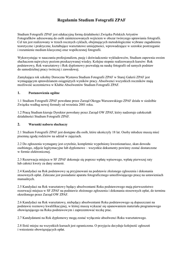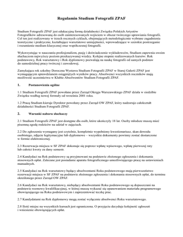 Regulamin Studium Fotografii ZPAF Studium Fotografii ZPAF jest edukacyjną formą działalności Związku Polskich Artystów Fotografików adresowaną do osób zainteresowanych wejściem w obszar twórczego uprawiania fotografii. Cel ten jest realizowany w trzech rocznych cyklach, obejmujących metodologicznie wybrane zagadnienia teoretyczne i praktyczne, kształtujące warsztatowe umiejętności, wprowadzające w szerokie postrzeganie i rozumienie medium klasycznej oraz współczesnej fotografii. Wykorzystując w nauczaniu profesjonalizm, pasję i doświadczenie wykładowców, Studium zapewnia swoim słuchaczom najwyższy poziom przekazywanej wiedzy. Kolejne stopnie realizowanych kursów: Rok podstawowy, Rok warsztatowy i Rok dyplomowy pozwalają na naukę fotografii od samych podstaw do samodzielnej pracy twórczej i zawodowej. Zamykająca rok szkolny Doroczna Wystawa Studium Fotografii ZPAF w Starej Galerii ZPAF jest wymagającym sprawdzianem osiągniętych wyników pracy. Absolwenci wszystkich roczników mają możliwość uczestnictwa w Klubie Absolwentów Studium Fotografii ZPAF. 1. Postanowienia ogólne 1.1 Studium Fotografii ZPAF powołane przez Zarząd Okręgu Warszawskiego ZPAF działa w siedzibie Związku według nowej formuły od września 2001 roku. 1.2 Pracą Studium kieruje Dyrektor powołany przez Zarząd OW ZPAF, który nadzoruje całokształt działalności Studium Fotografii ZPAF. 2. Warunki naboru słuchaczy 2.1 Studium Fotografii ZPAF jest dostępne dla osób, które ukończyły 18 lat. Osoby młodsze muszą mieć pisemną zgodę rodziców na udział w zajęciach. 2.2 Do zgłoszenia wymagany jest czytelnie, kompletnie wypełniony kwestionariusz, skan dowodu osobistego, zdjęcie legitymacyjne lub dyplomowe – wszystkie dokumenty powinny zostać dostarczone w formie elektronicznej. 2.3 Rezerwacja miejsca w SF ZPAF dokonuje się poprzez wpłatę wpisowego, wpłatę pierwszej raty lub całości kwoty za dany semestr. 2.4 Kandydaci na Rok podstawowy są przyjmowani na podstawie złożonego zgłoszenia i dokonania stosownych opłat. Zalecane jest posiadanie aparatu fotograficznego umożliwiającego pracę na ustawieniach manualnych. 2.5 Kandydaci na Rok warsztatowy będący absolwentami Roku podstawowego mają pierwszeństwo rezerwacji miejsca w SF ZPAF na podstawie złożonego zgłoszenia i dokonania stosownych opłat, do terminu określonego przez Zarząd OW ZPAF. 2.6 Kandydaci na Rok warsztatowy, niebędący absolwentami Roku podstawowego są dopuszczani na podstawie rozmowy kwalifikacyjnej, w której muszą wykazać się opanowaniem materiału programowego obowiązującego na Roku podstawowym i zaprezentować teczkę prac. 2.7 Kandydatami na Rok dyplomowy mogą zostać wyłącznie absolwenci Roku warsztatowego. 2.8 Ilość miejsc na wszystkich kursach jest ograniczona. O przyjęciu decyduje kolejność zgłoszeń i wniesienie obowiązujących opłat. 3. Opłaty za udział w zajęciach 3.1 Wysokość wpisowego oraz opłat semestralnych i ratalnych, a także terminy wpłat na najbliższy rok ustala Zarząd OW ZPAF. 3.2 Wpisowe nie podlega zwrotowi. Zaliczka odliczana est od pierwszej opłaty za pierwszy semestr. W roku akademickim 2016/17 wpisowe wynosi 250,- zł. Opłata semestralna w roku akademickim 2016/17 dla Roku podstawowego i warsztatowego wynosi 2.706,- zł brutto, zaś dla Roku dyplomowego 1.722,zł brutto. Opłata za cały rok nauki jest dwukrotnością tej kwoty. 3.3 Słuchacze mają do wyboru dwie formy płatności: a) wpłata z góry pełnej, ustalonej kwoty czesnego za semestr, którą należy uiścić najpóźniej do końca września w semestrze zimowym i do końca stycznia w semestrze letnim; b) wpłata w czterech ratach; - dla Roku podstawowego i warsztatowego 2.952,- zł z VAT - łącznie za semestr; - dla Roku dyplomowego 1.968,- zł z VAT - łącznie za semestr. 3.4 Wpłata w ratach musi być poparta złożeniem pisma do Dyrekcji Stdium o rozłożenie opłat za naukę w Studium Fotografii na raty oraz osobnego oświadczenia o wywiązywaniu się z kolejnych płatności. 3.5 Wpłata w ratach odbywa się według ustalonego harmonogramu: - semestr zimowy - pierwsza rata do końca września; semestr zimowy - druga rata do pierwszego grudnia; semestr letni - trzecia rata do końca lutego; semestr letni - czwarta rata do pierwszego maja; 3.6 Opłaty mają być dokonywane na konto bankowe: PKO BP S.A. XV O/W-wa Nr 09 1020 1156 0000 7002 0008 6090 lub bezpośrednio w kasie OW ZPAF. 3.7 Rezygnacja mogą być zgłoszane wyłącznie pisemnie. 3.8 Niedotrzymanie terminu opłaty obowiązującego zgodnie z wybraną formą płatności, upoważnia do podjęcia decyzji o zawieszeniu słuchacza, skreśleniu z listy słuchaczy SF ZPAF lub przekazania do windykacji zaległości z tytułu opłat za udział w zajęciach Studium. 4. Prawa słuchaczy Studium 4.1 Uczestniczenie w przewidzianych programem zajęciach dydaktycznych; 4.2 Uczestniczenie w przewidzianych programem plenerach. Aktualni Słuchacze Studium pokrywają koszty zakwaterowania, wyżywienia i organizacyjne. 4.3 Uczestniczenie w kwalifikacji teczek do Dorocznej Wystawy Studium Fotografii ZPAF. 4.4 Korzystanie ze zorganizowanych konsultacji oraz bieżącej pomocy wszystkich prowadzących zajęcia. 4.5 Otrzymywanie drogą elektroniczną niezbędnych informacji oraz udział we wszystkich wernisażach, pokazach, wieczorach autorskich i innych imprezach organizowanych przez Okręg Warszawski ZPAF. 4.6 Korzystanie na określonych odrębnym regulaminem warunkach z dodatkowych przywilejów: pracy w ciemni poza godzinami zajęć planowych. 4.7 Posiadanie legitymacji słuchacza Studium Fotografii ZPAF. 5. Obowiązki słuchaczy Studium 5.1 Systematyczna obecność, punktualność i aktywność na zajęciach. 5.2 Rzetelne wykonywanie zadań fotograficznych zlecanych przez prowadzących zajęcia i przedstawienie ich do zaliczenia w ustalonym terminie. 5.3 Informowanie na bieżąco o wszelkich zmianach adresu do korespond