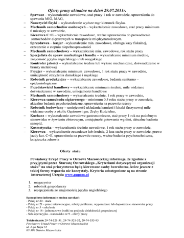 − − − − − − − − − − − − − − − − − Oferty pracy aktualne na dzień 29.07.2011r. Spawacz – wykształcenie zawodowe, staż pracy 1 rok w zawodzie, uprawnienia do spawania MIG, MAG, Nauczyciel fizyki – wykształcenie wyższe mgr kierunek fizyka. Mechanik samochodów osobowych – wykształcenie zawodowe, staż pracy minimum 6 miesięcy w zawodzie, Kierowca C+E – wykształcenie zawodowe, ważne uprawnienia do prowadzenia samochodów ciężarowych w transporcie międzynarodowym. Sprzedawca – kasjer –wykształcenie min. zawodowe, obsługa kasy fiskalnej, orzeczenie o stopniu niepełnosprawności Mechanik samochodowy – wykształcenie min. zawodowe, rok stażu pracy Specjalista do spraw marketingu i handlu – wykształcenie minimum średnie, znajomość języka angielskiego i/lub rosyjskiego Kontroler jakości – wykształcenie średnie lub wyższe mechaniczne, doświadczenie w branży metalowej Fryzjer – wykształcenie minimum zawodowe, 1 rok stażu pracy w zawodzie, umiejętność strzyżenia damskiego i męskiego Robotnik produkcyjny – wykształcenie zawodowe, badania sanitarno – epidemiologiczne Przedstawiciel handlowy – wykształcenie minimum średnie, mile widziane doświadczenie w zawodzie, umiejętności handlowe Mechanik samochodowy – wykształcenie średnie, 1 rok pracy w zawodzie, Kierowca samochodu ciężarowego – minimum 0,5 roku stażu pracy w zawodzie, aktualne badania psychotechniczne, uprawnienia na przewóz rzeczy Robotnik budowlany – umiejętność układania kamieni i kiszki faszynowej mile widziane osoby z okolic Gąsiorowi gm. Zręby Kościelne, Kucharz – wykształcenie zawodowe gastronomiczne, staż pracy 1 rok na podobnym stanowisku w żywieniu zbiorowym, umiejętność gotowania wg diet, aktualne badania sanepid, Kosmetyczka – wykształcenie średnie zawodowe, 1 rok stażu pracy w zawodzie, Kierowca – wykształcenie zawodowe lub średnie, 2 lata stażu pracy w zawodzie, prawo jazdy kat. C+E, uprawnienia na przewóz rzeczy, ważne badania psychotechniczne, książeczka zdrowia Oferty stażu Powiatowy Urząd Pracy w Ostrowi Mazowieckiej informuje, że zgodnie z przyjętymi przez Starostę Ostrowskiego „Kryteriami dotyczącymi organizacji stażu” na staż priorytetowo będą kierowane osoby bezrobotne, które jeszcze z takiej formy wsparcia nie korzystały. Kryteria udostępnione są na stronie internetowej Urzędu www.pupom.pl 1. magazynier 2. robotnik gospodarczy 3. recepcjonista ze znajomością języka angielskiego Szczegółowe informacje można uzyskać: - Pokój nr 20 - staże - Pokój nr 21 - prace interwencyjne, roboty publiczne, wyposażenie lub doposażenie stanowiska pracy - Pokój nr 5 - szkolenia - Pokój nr 18 - jednorazowe środki na podjęcie działalności gospodarczej - Sala operacyjna - stanowisko nr 9 - oferty pracy Telefonicznie 29-74-521-51, 29-74-521-52, 29-74-533-93 Powiatowy Urząd Pracy w Ostrowi Mazowieckiej ul. 3-go Maja 55 07-300 Ostrów Mazowiecka