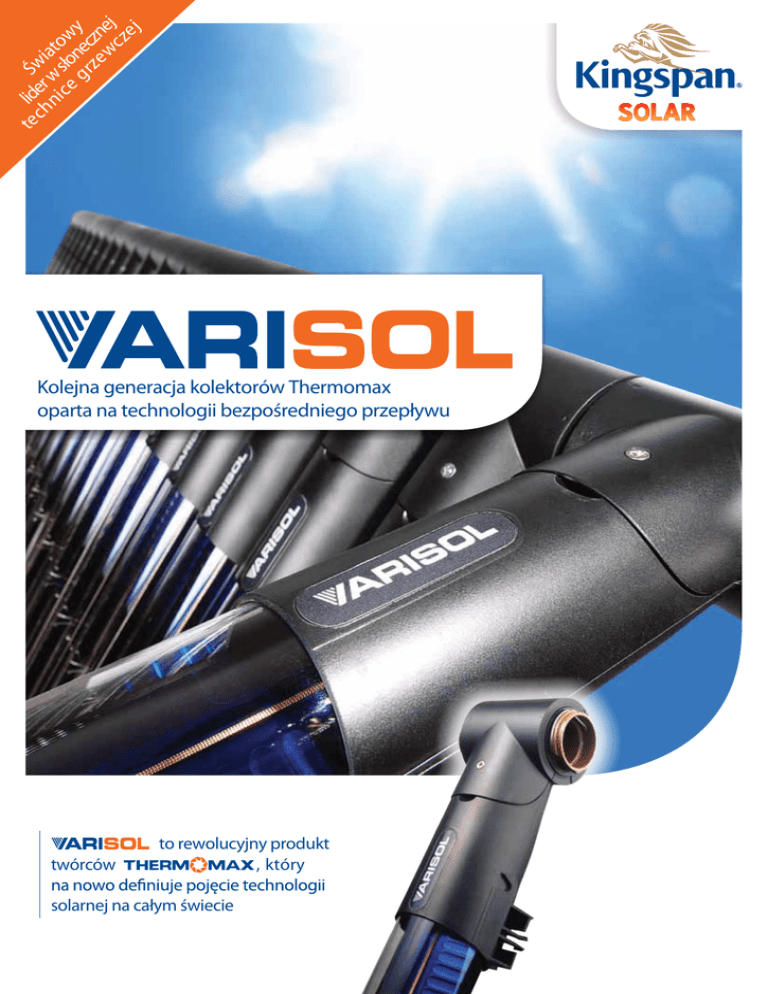 te lid Św ch er ia ni w s to ce ło w gr nec y ze zn w ej cz ej Kolejna generacja kolektorów Thermomax oparta na technologii bezpośredniego przepływu twórców to rewolucyjny produkt , który solarnej na całym świecie y y, w wy czn No to ne ika sło un tor k le ko Instalacja kolektora słonecznego nigdy nie była prostsza! 1 Włóż tubę Varisol 2 Przekręć ją w dół 3 Klik i gotowe! Wiodąca w świecie technologia tub próżniowych Thermomax oparta na bezpośrednim przepływie oraz unikatowa konstrukcja kolektora słonecznego zostały połączone, aby zaoferować wysokie parametry pracy i pełną elastyczność produktu. Rewolucyjna konstrukcja kolektora stanowi nowoczesną i elastyczną alternatywę wobec tradycyjnych, modułowych kolektorów słonecznych. Szybki i łatwy w montażu system pozwala w prosty sposób łączyć ze sobą pojedyncze tuby tworząc kolektor słoneczny dopasowany do indywidualnych potrzeb użytkownika. Z korzyścią dla wszystkich Pełna elastyczność i doskonałe parametry to nie jedyne korzyści systemu Varisol. Połączenie bardziej ekologiczny, który jest łatwiejszy do zamówienia, przechowywania oraz instalacji. Instalator Dystrybutor Odbiorca Środowisko • Szybka instalacja. • Brak cieżkiej głowicy. • Możliwość dopasowania rozmiaru kolektora do dostępnych powierzchni, np. między oknami. • rozmiar kolektora dostosowany dokładnie do Twoich potrzeb • Płacisz tylko za to, czego naprawdę potrzebujesz, np. za kolektor z 24 tubami. • System dostosowany do zmieniających się potrzeb - może rosnąć razem z Twoją rodziną. • Dopasowanie systemu do dostępnego budżetu • Sprawniejsza gospodarka magazynowa bez konieczności przechowywania głowic oraz obliczania ilości tub niezbędnych do ich wypełniania, kapitał nie jest zamrożony w towarze. • Mniejsze zużycie metali, których produkcja wymaga dużych nakładów energii. • Brak lutowania i spawania, co znacząco zmniejsza ilość energii zużywanej w procesie produkcji. • Materiały polimerowe są w 100% odzyskiwalne. • Lżejsze i mniejsze opakowania minimalizują ekologiczne skutki transportu. • Brak przerw między modułami w większych systemach - poprawa walorów estetycznych. Właściwości Informacje techniczne • Pełna elastyczność • 100% precyzji w doborze rozmiaru kolektora • Wysoka wydajność technologii bezpośredniego przepływu Thermomax • Wysoka jakość materiałów polimerowych • Fabryczne połączenie głowicy z tubą • Opakowania zbiorcze - 1, 5 i 10 sztuk • Możliwość rozbudowy systemu • Do zastosowań domowych i komercyjnych Wymiary (jedna tuba) 1950 x 97 x 97mm Ciężar (jedna tuba) 2.2kg Objętość (jedna tuba) 0.14 litra Przyłącze tub zaciskowe 22mm Maks. ciśnienie robocze 6 barów Min. nachylenie 0 stopni Maks. nachylenie 90 stopni • 20 lat gwarancji w przypadku montażu przez • Do 150 tub próżniowych w jednym rzędzie • 100% Europejski design i produkcja • 5 lat gwarancji na gradobicie Kolejna generacja kolektorów Produkt chroniony prawami patentowymi Twój dystrybutor En-Sol ul. Strzeszyńska 229, 60-479 Poznań, Poland Tel: (+48) 512 170 643 Tel: (+48) 509 091 076 e-mail: [email protected] www.en-sol.pl