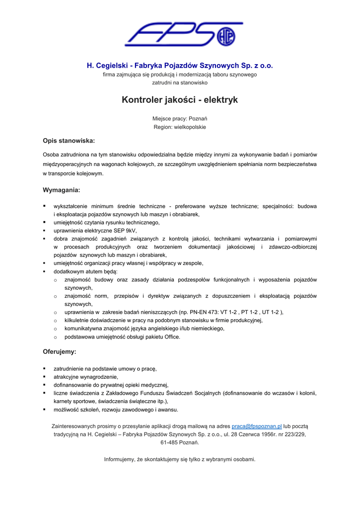 H. Cegielski - Fabryka Pojazdów Szynowych Sp. z o.o. firma zajmująca się produkcją i modernizacją taboru szynowego zatrudni na stanowisko Kontroler jakości - elektryk Miejsce pracy: Poznań Region: wielkopolskie Opis stanowiska: Osoba zatrudniona na tym stanowisku odpowiedzialna będzie między innymi za wykonywanie badań i pomiarów międzyoperacyjnych na wagonach kolejowych, ze szczególnym uwzględnieniem spełniania norm bezpieczeństwa w transporcie kolejowym. Wymagania: wykształcenie minimum średnie techniczne - preferowane wyższe techniczne; specjalności: budowa i eksploatacja pojazdów szynowych lub maszyn i obrabiarek, umiejętność czytania rysunku technicznego, uprawnienia elektryczne SEP 9kV, dobra znajomość zagadnień związanych z kontrolą jakości, technikami wytwarzania i pomiarowymi w procesach produkcyjnych oraz tworzeniem dokumentacji jakościowej i zdawczo-odbiorczej pojazdów szynowych lub maszyn i obrabiarek, umiejętność organizacji pracy własnej i współpracy w zespole, dodatkowym atutem będą: o znajomość budowy oraz zasady działania podzespołów funkcjonalnych i wyposażenia pojazdów o szynowych, znajomość norm, o szynowych, uprawnienia w zakresie badań nieniszczących (np. PN-EN 473: VT 1-2 , PT 1-2 , UT 1-2 ), o o kilkuletnie doświadczenie w pracy na podobnym stanowisku w firmie produkcyjnej, komunikatywna znajomość języka angielskiego i/lub niemieckiego, o podstawowa umiejętność obsługi pakietu Office. przepisów i dyrektyw związanych z dopuszczeniem i eksploatacją pojazdów Oferujemy: zatrudnienie na podstawie umowy o pracę, atrakcyjne wynagrodzenie, dofinansowanie do prywatnej opieki medycznej, możliwość szkoleń, rozwoju zawodowego i awansu. liczne świadczenia z Zakładowego Funduszu Świadczeń Socjalnych (dofinansowanie do wczasów i kolonii, karnety sportowe, świadczenia świąteczne itp.), Zainteresowanych prosimy o przesyłanie aplikacji drogą mailową na adres [email protected] lub pocztą tradycyjną na H. Cegielski – Fabryka Pojazdów Szynowych Sp. z o.o., ul. 28 Czerwca 1956r. nr 223/229, 61-485 Poznań. Informujemy, że skontaktujemy się tylko z wybranymi osobami. Prosimy o umieszczenie klauzuli „Wyrażam zgodę na przetwarzanie moich danych osobowych dla potrzeb procesu rekrutacji, zgodnie z ustawą z dnia 29.08.1997r., o ochronie danych osobowych (Dz.U. Nr 133, poz. 883, z późn.zm.)”.