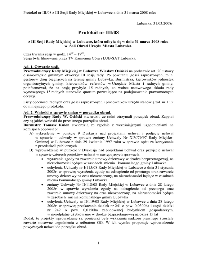 Protokół nr III/08 z III Sesji Rady Miejskiej w Lubawce z dnia 31 marca 2008 roku Lubawka, 31.03.2008r. Protokół nr III/08 z III Sesji Rady Miejskiej w Lubawce, która odbyła się w dniu 31 marca 2008 roku w Sali Obrad Urzędu Miasta Lubawka. Czas trwania sesji w godz. 1400 – 1725. Sesja była filmowana przez TV Kamienna Góra i LUB-SAT Lubawka. Ad. 1. Otwarcie sesji. Przewodniczący Rady Miejskiej w Lubawce Wiesław Osiński na podstawie art. 20 ustawy o samorządzie gminnym otworzył III sesję rady. Po powitaniu gości zaproszonych, m.in. gestorów dróg biegnących na terenie gminy Lubawka, Burmistrza, kierowników jednostek organizacyjnych gminy, kierowników referatów w Urzędzie Miasta i radnych gminy, poinformował, że na sesję przybyło 15 radnych, co wobec ustawowego składu rady wynoszącego 15 radnych stanowiło quorum pozwalające na podejmowanie prawomocnych decyzji. Listy obecności radnych oraz gości zaproszonych i pracowników urzędu stanowią zał. nr 1 i 2 do niniejszego protokołu. Ad. 2. Wnioski w sprawie zmian w porządku obrad. Przewodniczący Rady W. Osiński stwierdził, że radni otrzymali porządek obrad. Zapytał czy są jakieś wnioski do przesłanego porządku obrad. Burmistrz Tomasz Kulon stwierdził, że zgodnie z wcześniejszymi uzgodnieniami na komisjach poprosił o: A) wykreślenie w punkcie 9 Dyskusja nad projektami uchwał i podjęcie uchwał w sprawie – uchwały w sprawie zmiany Uchwały Nr XIV/79/97 Rady MiejskoGminnej w Lubawce z dnia 29 kwietnia 1997 roku w sprawie opłat za korzystanie z przedszkoli publicznych B) wprowadzenie w punkcie 9 Dyskusja nad projektami uchwał oraz przyjęcie uchwał w sprawie czterech projektów uchwał w następujących sprawach: • wyrażenia zgody na zawarcie umowy dzierżawy w drodze bezprzetargowej, na nieruchomości będące w zasobach mienia komunalnego gminy Lubawka • uchylenia Uchwały nr I/115/08 Rady Miejskiej w Lubawce z dnia 31 stycznia 2008r. w sprawie; wyrażenia zgody na odstąpienie od przetargu oraz zawarcie umowy dzierżawy na czas nieoznaczony, na nieruchomości będące w zasobach mienia komunalnego gminy Lubawka • zmiany Uchwały Nr II/118/08 Rady Miejskiej w Lubawce z dnia 28 lutego 2008r. w sprawie wyrażenia zgody na odstąpienie od przetargu oraz zawarcie umowy dzierżawy na czas nieoznaczony, na nieruchomości będące w zasobach mienia komunalnego gminy Lubawka • uchylenia Uchwały nr II/119/08 Rady Miejskiej w Lubawce z dnia 28 lutego 2008r. w sprawie; przekazania działek nr 241 o pow. 0,0300ha i część działki nr 242 o pow. 0,0150ha zabudowanej budynkiem gospodarczym, w nieodpłatne użytkowanie w drodze bezprzetargowej na okres 15 lat Dodał, że projekty wprowadzane są, ponieważ były wskazania nadzoru prawnego i zostały zawarte stosowne uzgodnienia z referatem GG. W ich wyniku proponuje wprowadzenie powyższych uchwał do porządku obrad. 1 Protokół nr III/08 z III Sesji Rady Miejskiej w Lubawce z dnia 31 marca 2008 roku Przewodniczący Rady W. Osiński pytał się czy są jakieś uwagi i wnioski. Uwag i wniosków nie zgłoszono. Poinformował, że jeśli nie usłyszy sprzeciwu to proponowane zmiany zostaną wprowadzone blokiem. (Nie zgłoszono sprzeciwu.). Dodał, że aby wprowadzić proponowane zmiany musi być co najmniej 8 głosów „za”. Zarządził głosowanie nad proponowanymi zmianami czyli, wykreśleniem w punkcie 9 Dyskusja nad projektami uchwał oraz podjęcie uchwał w sprawie jednego projektu uchwały i wprowadzeniem do tego punktu 4 projektów uchwał. Na wniosek Przewodniczącego Rady W. Osińskiego Rada Miejska w obecności 15 radnych – 15 głosami „za”, przy 0 głosach „przeciwnych i 0 głosach „wstrzymujących” głosująca jawnie przez podniesienie ręki jednogłośnie zaaprobowała proponowane zmiany. Proponowany porządek obrad sesji: 1. Otwarcie sesji. 2. Wnioski w sprawie zmian w porządku obrad. 3. Przyjęcie protokołu z II sesji. 4. Interpelacje i zapytania radnych. 5. Sieć drogowa w gminie Lubawka - informacja gestorów: a) drogi krajowe b) drogi wojewódzkie c) drogi powiatowe 6. Informacja Burmistrza Miasta z realizacji programu współpracy Gminy Lubawka z organizacjami pozarządowymi w 2007r. 7. Informacja Burmistrza o pracy między sesjami. 8. Informacja Komisji Rewizyjnej o pracy między sesjami. 9. Dyskusja nad projektami uchwał oraz przyjęcie uchwał w sprawie: • wyrażenia zgody na przeznaczenie do sprzedaży nieruchomości zabudowanej w drodze bezprzetargowej • wyrażenia zgody na przeznaczenie do przekazania działki gruntu w użytkowanie wieczyste w drodze bezprzetargowej • wyrażenia zgody na przeznaczenie do sprzedaży nieruchomości gruntowej • wyrażenia zgody na wydzierżawienie nieruchomości będącej w zasobach mienia komunalnego gminy Lubawka na czas nieoznaczony • wyrażenia zgody na zawarcie umowy dzierżawy w drodze bezprzetargowej, na nieruchomości będące w zasobach mienia komunalnego gminy Lubawka • uchylenia Uchwały nr I/115/08 Rady Miejskiej w Lubawce z dnia 31 stycznia 2008r. w sprawie; wyrażenia zgody na odstąpienie od przetargu oraz zawarcie umowy dzierżawy na czas nieoznaczony, na nieruchomości będące w zasobach mienia komunalnego gminy Lubawka • zmiany Uchwały Nr II/118/08 Rady Miejskiej w Lubawce z dnia 28 lutego 2008r. w sprawie wyrażenia zgody na odstąpienie od przetargu oraz zawarcie umowy dzierżawy na czas nieoznaczony, na nieruchomości będące w zasobach mienia komunalnego gminy Lubawka • uchylenia Uchwały nr II/119/08 Rady Miejskiej w Lubawce z dnia 28 lutego 2008r. w sprawie; przekazania działek nr 241 o pow. 0,0300ha i część działki nr 242 o pow. 0,0150ha zabudowanej budynkiem gospodarczym, w nieodpłatne użytkowanie w drodze bezprzetargowej na okres 15 lat • wprowadzenia zmian w budżecie Gminy Lubawka na rok 2008 10. Odpowiedzi na interpelacje i zapytania radnych. 11. Sprawy różne, wolne wnioski i informacje. 12. Zamknięcie obr