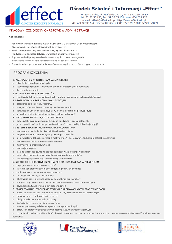 PRACOWNICZE OCENY OKRESOWE W ADMINISTRACJI C e l szko le nia : - Pogłębienie wiedzy w zakresie tworzenia Systemów Okresowych Ocen Pracowniczych - Zintegrowanie rozmów kwalifikacyjnych i oceniających - Zwiększenie praktycznej wiedzy dotyczącej wprowadzania SOOP - Praktyczne umiejętności dotyczące tworzenia arkuszy oceniających - Poprawa techniki przeprowadzania prawidłowych rozmów oceniających - Zwiększenie świadomości dotyczących błędów ocen okresowych - Poznanie technik przeprowadzania rozmów okresowych osób o różnych typach osobowości PROGRAM SZKOLENIA: 1 . P LAN O WAN IE Z ATRUDN IEN IA W ADMIN IS TRAC JI o określenie potrzeb personalnych o specyfikacja wymagań budowanie profilu kompetencyjnego kandydata o ile kosztuje rekrutacja 2. WS TĘ P N A S ELEK C JA K AN DYDATÓ W o weryfikacja dokumentów aplikacyjnych analiza i ocena zawartych w nich informacji 3. P RO FES JO N ALN A RO Z MO WA K WALIFIK AC YJN A o określenie celu i kierunku rozmowy o umiejętność prowadzenia rozmowy i zadawania pytań o sprawdzanie umiejętności kandydatów, techniki badania ich predyspozycji o jak radzić sobie z trudnymi sytuacjami podczas rekrutacji? 4 . P O DEJMO WAN IE DEC YZ JI O Z ATRUDN IEN IU o proces dokonywania wyboru najlepszego kandydata ocena potencjału o jakie czynniki brać pod uwagę i zminimalizować ryzyko podjęcia błędnej decyzji? 5. S YS TEMY I TEC HN IK I MO TYWO WAN IA P RAC O WN IK Ó W o motywacja a manipulacja korzyści i niebezpieczeństwa o diagnozowanie poziomu motywacji swoich pracowników o jak prawidłowo dobierać narzędzia motywacyjne? dostosowanie technik do potrzeb pracownika o motywowanie osoby a motywowanie zespołu o motywacyjne porozumiewanie się o motywująca krytyka o jak adekwatnie reagować na spadek zaangażowania i energii w zespole? o materialne i pozamaterialne sposoby motywowania pracowników o najczęściej popełniane błędy w motywacji pracowników 6 . S YS TEM O C EN P RAC O WN IC Z YC H W P RO C ES IE Z ARZ Ą DZ AN IA P ERS O N ELEM o czym jest system ocen pracowniczych? o system ocen pracowniczych jako narzędzie polityki personalnej o cechy dobrego systemu ocen pracowniczych o rola ocen miesięcznych i okresowych o planowanie karier oraz podnoszenie kompetencji pracowników o korzyści i zagrożenia związane ze stosowaniem systemu ocen pracowniczych o czynniki kształtujące system ocen pracowniczych 7 . P RO JEK TO WAN IE I TWO RZ EN IE S YS TEMU O K RES O WYC H O C EN P RAC O WN IC Z YC H o tworzenie arkuszy służących do okresowej oceny pracownika cechy konstrukcyjne o prezentacja przykładowych arkuszy ocen o błędy popełniane w konstrukcji arkuszy o dostrajanie systemu ocen do potrzeb firmy o warunki poprawnego działania systemu ocen pracowniczych o omówienie kryteriów obowiązkowych oceny pracowników samorządowych o kryteria do wyboru - jakie wybrać oceniania? kryteria do oceny na danym stanowisku pracy, aby zagwarantować obiektywność podczas procesu 8 . WDRAŻ AN IE S YS TEMU O C EN O K RES O WYC H o etapy wdrażania o zaangażowanie kadry kierowniczej i pracowników o szkolenia o cykl oceny pracownika kryteria oceny, zbieranie informacji o badanie reakcji pracowników na system ocen 9 . S P EC YFIK A RO Z MO WY O C EN IAJĄ C EJ o przygotowanie do rozmowy z pracownikiem o cele i funkcje rozmowy oceniającej o funkcja informacyjna i rozwojowa rozmowy oceniającej o struktura i scenariusze rozmowy oceniającej o narzędzia perswazji przydatne podczas rozmowy oceniającej o konstruktywne chwalenie i krytykowanie pracownika o jak radzić sobie z sytuacjami konfliktowymi podczas rozmowy? o omówienie zasad przeprowadzenia z ocenianym przez oceniającego rozmowy, dotyczącej wykonywania przez ocenianego jego obowiązków w okresie, w którym podlegał ocenie, trudności napotykane przez niego podczas realizacji zadań i spełnienie przez ocenianego ustalonych kryteriów oceny o dokumentacja związana z procesem oceny o omówienie zasad wypełniania arkusza okresowej oceny kwalifikacyjnej pracownika - praktyka w organizacjach samorządowych o nauka samodzielnego wypełniania arkusza okresowej oceny kwalifikacyjnej pracownika - praktyka w organizacjach samorządowych o skutki dokonania negatywnej oceny pracownika o procedura odwoławcza 1 0 . BŁĘ DY W O C EN IAN IU JAK S IĘ IC H US TRZ EC ? o mechanizm powstawania błędów pojawiających się podczas oceny o rola pytań stosowanych w rozmowie o najczęstsze błędy w procesie oceniania 1 1 . Z AS TO S O WAN IE WYN IK Ó W O K RES O WYC H O C EN P RAC O WN IK Ó W o zakres wykorzystywania wyników ocen okresowych o efekty przeprowadzania audytu personalnego o program zmian organizacyjnych, wdrażanie zmian w organizacji o konstruowanie planu rozwoju i planu naprawczego 1 2. O S O BO WO Ś Ć W TRAK C IE RO Z MÓ W O C EN IAJĄ C YC H I K WALIFIK AC YJN YC H o rozpoznawanie typów osobowościowych wg modelu DISC dr W. Marstona o analiza własnego typu osobowości o jak prowadzić rozmowę oceniającą w pracownikiem o określonym typie osobowości o motywowanie i dobór reakcji czterostrefowy model zachowań o samopostrzeganie i ocena innych w zależności od typu osobowości o SWOT, czyli silne i słabe strony w negocjacjach poszczególnych modeli zachowań Możliwość przeprowadzenia analizy osobowości uczestników w oparciu o test osobowości TTI Ltd. INSIGHTS Analysen by SCHEELEN Institut fur Managementberatug und Bildungsmarketing METODY PROWADZENIA WARSZTATÓW: - Wykład interaktywny - Praca indywidualna - Praca na arkuszach ocen okresowych - Dyskusja moderowana - Odgrywanie ról - Testy autodiagnostyczne - Testy osobowości SZKOLENIE ADRESOWANE JEST DO: Szkolenie jest skierowane do przedstawicieli administracji publicznej i samorządowej WYKŁADOWCĄ NA SZKOLENIU BĘDZIE: P io tr T. Ruta Trener, konsultant, negocjator, mówca motywacyjny Wykładowca na Studiach Podyplomowych w Wyższej Szkole Bankowej w Poznaniu. Studiował na Wydziale Dz