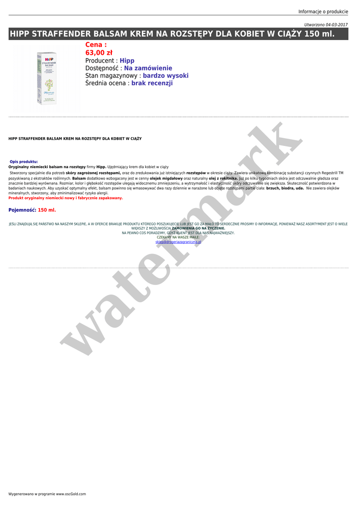 Informacje o produkcie Utworzono 04-03-2017 HIPP STRAFFENDER BALSAM KREM NA ROZSTĘPY DLA KOBIET W CIĄŻY 150 ml. Cena : 63,00 zł Producent : Hipp Dostępność : Na zamówienie Stan magazynowy : bardzo wysoki Średnia ocena : brak recenzji er m ar k HIPP STRAFFENDER BALSAM KREM NA ROZSTĘPY DLA KOBIET W CIĄŻY Opis produktu: Oryginalny niemiecki balsam na rozstępy firmy Hipp. Ujędrniający krem dla kobiet w ciąży Stworzony specjalnie dla potrzeb skóry zagrożonej rozstępami, oraz do zredukowania już istniejących rozstępów w okresie ciąży. Zawiera unikatową kombinację substancji czynnych Regestrill TM pozyskiwaną z ekstraktów roślinnych. Balsam dodatkowo wzbogacony jest w cenny olejek migdałowy oraz naturalny olej z rokitnika. Już po kilku tygodniach skóra jest odczuwalnie gładsza oraz znacznie bardziej wyrównana. Rozmiar, kolor i głębokość rozstępów ulegają widocznemu zmniejszeniu, a wytrzymałość i elastyczność skóry odczuwalnie się zwiększa. Skuteczność potwierdzona w badaniach naukowych. Aby uzyskać optymalny efekt, balsam powinno się wmasowywać dwa razy dziennie w narażone lub objęte rozstępami partie ciała: brzuch, biodra, uda. Nie zawiera olejków mineralnych, stworzony, aby zminimalizować ryzyko alergii. Produkt oryginalny niemiecki nowy i fabrycznie zapakowany. Pojemność: 150 ml. w at JEŚLI ZNAJDUJĄ SIĘ PAŃSTWO NA NASZYM SKLEPIE, A W OFERCIE BRAKUJE PRODUKTU KTÓREGO POSZUKUJECIE LUB JEST GO ZA MAŁO TO SERDECZNIE PROSIMY O INFORMACJE, PONIEWAŻ NASZ ASORTYMENT JEST O WIELE WIĘKSZY Z MOŻLIWOŚCIĄ ZAMÓWIENIA GO NA ŻYCZENIE. NA PEWNO COŚ PORADZIMY, GDYŻ KLIENT JEST DLA NAS NAJWAŻNIEJSZY. CZEKAMY NA WASZE MAILE: [email protected] Wygenerowano w programie www.oscGold.com