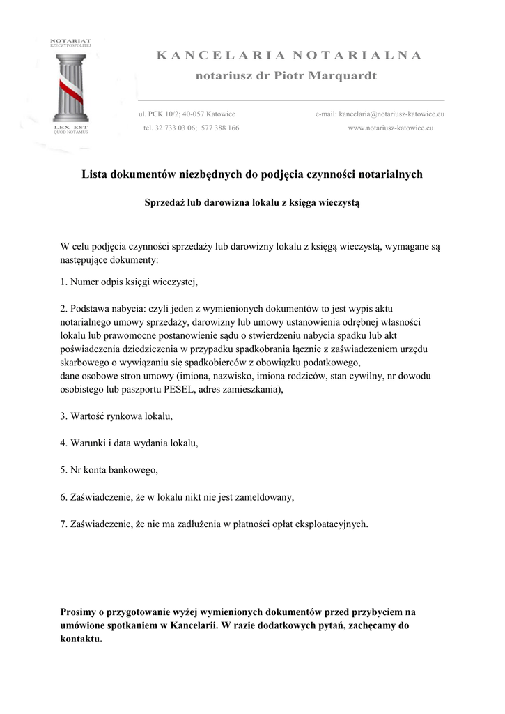 RZECZYPOSPOLITEJ KANCELARIA NOTARIALNA notariusz dr Piotr Marquardt ul. PCK 10/2; 40-057 Katowice QUOD NOTAMUS tel. 32 733 03 06; 577 388 166 e-mail: [email protected] www.notariusz-katowice.eu Lista dokumentów niezbędnych do podjęcia czynności notarialnych Sprzedaż lub darowizna lokalu z księga wieczystą W celu podjęcia czynności sprzedaży lub darowizny lokalu z księgą wieczystą, wymagane są następujące dokumenty: 1. Numer odpis księgi wieczystej, 2. Podstawa nabycia: czyli jeden z wymienionych dokumentów to jest wypis aktu notarialnego umowy sprzedaży, darowizny lub umowy ustanowienia odrębnej własności lokalu lub prawomocne postanowienie sądu o stwierdzeniu nabycia spadku lub akt poświadczenia dziedziczenia w przypadku spadkobrania łącznie z zaświadczeniem urzędu skarbowego o wywiązaniu się spadkobierców z obowiązku podatkowego, dane osobowe stron umowy (imiona, nazwisko, imiona rodziców, stan cywilny, nr dowodu osobistego lub paszportu PESEL, adres zamieszkania), 3. Wartość rynkowa lokalu, 4. Warunki i data wydania lokalu, 5. Nr konta bankowego, 6. Zaświadczenie, że w lokalu nikt nie jest zameldowany, 7. Zaświadczenie, że nie ma zadłużenia w płatności opłat eksploatacyjnych. Prosimy o przygotowanie wyżej wymienionych dokumentów przed przybyciem na umówione spotkaniem w Kancelarii. W razie dodatkowych pytań, zachęcamy do kontaktu.