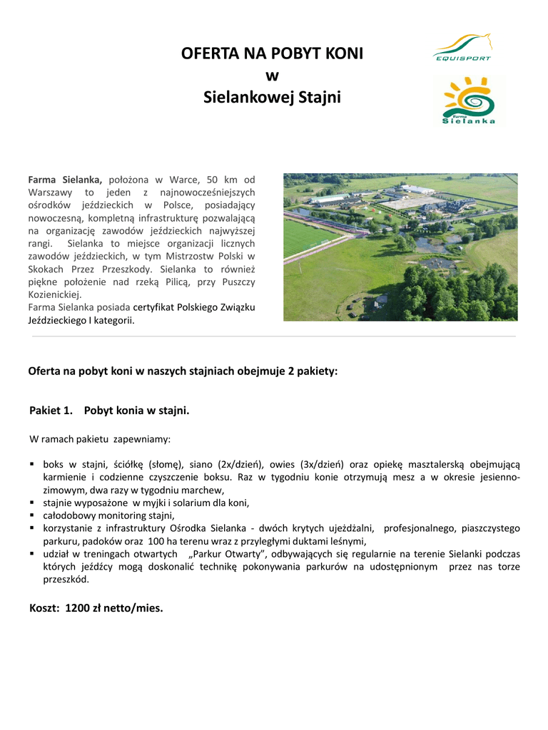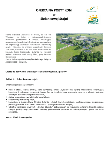 OFERTA NA POBYT KONI w Sielankowej Stajni Farma Sielanka, położona w Warce, 50 km od Warszawy to jeden z najnowocześniejszych ośrodków jeździeckich w Polsce, posiadający nowoczesną, kompletną infrastrukturę pozwalającą na organizację zawodów jeździeckich najwyższej rangi. Sielanka to miejsce organizacji licznych zawodów jeździeckich, w tym Mistrzostw Polski w Skokach Przez Przeszkody. Sielanka to również piękne położenie nad rzeką Pilicą, przy Puszczy Kozienickiej. Farma Sielanka posiada certyfikat Polskiego Związku Jeździeckiego I kategorii. Oferta na pobyt koni w naszych stajniach obejmuje 2 pakiety: Pakiet 1. Pobyt konia w stajni. W ramach pakietu zapewniamy: boks w stajni, ściółkę (słomę), siano (2x/dzień), owies (3x/dzień) oraz opiekę masztalerską obejmującą karmienie i codzienne czyszczenie boksu. Raz w tygodniu konie otrzymują mesz a w okresie jesiennozimowym, dwa razy w tygodniu marchew, stajnie wyposażone w myjki i solarium dla koni, całodobowy monitoring stajni, korzystanie z infrastruktury Ośrodka Sielanka - dwóch krytych ujeżdżalni, profesjonalnego, piaszczystego parkuru, padoków oraz 100 ha terenu wraz z przyległymi duktami leśnymi, udział w treningach otwartych „Parkur Otwarty”, odbywających się regularnie na terenie Sielanki podczas których jeźdźcy mogą doskonalić technikę pokonywania parkurów na udostępnionym przez nas torze przeszkód. Koszt: 1200 zł netto/mies. Pakiet2. Pobyt konia w stajni wraz z zapewnieniem ruch i indywidualną opieką W ramach pakietu zapewniamy: boks w stajni, ściółkę (słomę), siano (2x/dzień), owies (3x/dzień) oraz opiekę masztalerską obejmującą karmienie i codzienne czyszczenie boksu. Raz w tygodniu konie otrzymują mesz a w okresie jesiennozimowym, dwa razy w tygodniu marchew, stajnie wyposażone w myjki i solarium dla koni, całodobowy monitoring stajni, korzystanie z infrastruktury jeździeckiej ośrodka Farma Sielanka - dwóch krytych ujeżdżalni, profesjonalnego, piaszczystego parkuru, padoków oraz 100 ha terenu wraz z przyległymi duktami leśnymi, indywidualną opiekę nad koniem pracowników Stowarzyszenia EquiSport. na życzenie właściciela - wyprowadzanie koni na padok lub do karuzeli, raz dziennie na czas do 1 godziny. jazda pod siodłem - zgodnie z planem uzgodnionym z właścicielem - pod nadzorem naszego zespołu instruktorskiego (3 osoby) dostosowanie indywidualnych dawek pokarmowych dla koni – zgodnie ze wskazówkami właściciela w trakcie obowiązywania umowy - możliwość bezpłatnego udziału w zawodach regionalnych, organizowanych na terenie ośrodka jeździeckiego Farma Sielanka udział w treningach otwartych „Parkur Otwarty”, odbywających się regularnie na terenie Sielanki podczas których jeźdźcy mogą doskonalić technikę pokonywania parkurów na udostępnionym przez nas torze przeszkód. Koszt 2000 zł/netto miesięcznie dla koni cierpiących na schorzenie COPD udostępniamy stajnię angielską istnieje możliwość dodatkowych upustów przy większej ilości koni Dla właścicieli trzymających konie w naszej stajni, Hotel Sielanka nad Pilicą **** oferuje noclegi w specjalnych cenach. pokój 2-osobowy ze śniadaniem: 250 PLN/dobę pokój 1-osobowy ze śniadaniem: 230 PLN/dobę pokój 2-osobowy przy stajni: 100 PLN/dobę Kontakt: Justyna Michałkiewicz tel. 502 73 87 96, email: [email protected]