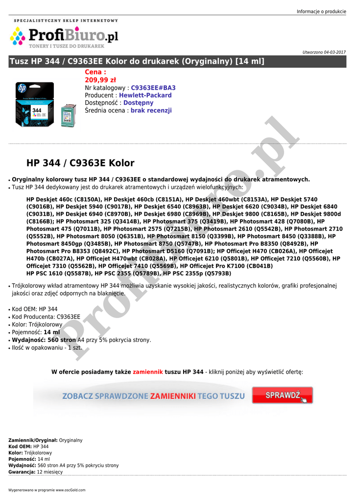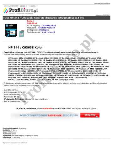 Informacje o produkcie Utworzono 04-03-2017 Tusz HP 344 / C9363EE Kolor do drukarek (Oryginalny) [14 ml] Cena : 209,99 zł o. pl Nr katalogowy : C9363EE#BA3 Producent : Hewlett-Packard Dostępność : Dostępny Średnia ocena : brak recenzji HP 344 / C9363E Kolor ● ● Oryginalny kolorowy tusz HP 344 / C9363EE o standardowej wydajności do drukarek atramentowych. Tusz HP 344 dedykowany jest do drukarek atramentowych i urządzeń wielofunkcyjnych: ● ● ● ● ● of ● Trójkolorowy wkład atramentowy HP 344 możliwia uzyskanie wysokiej jakości, realistycznych kolorów, grafiki profesjonalnej jakości oraz zdjęć odpornych na blaknięcie. Kod OEM: HP 344 Kod Producenta: C9363EE Kolor: Trójkolorowy Pojemność: 14 ml Wydajność: 560 stron A4 przy 5% pokrycia strony. Ilość w opakowaniu - 1 szt. Pr ● iB iu r HP Deskjet 460c (C8150A), HP Deskjet 460cb (C8151A), HP Deskjet 460wbt (C8153A), HP Deskjet 5740 (C9016B), HP Deskjet 5940 (C9017B), HP Deskjet 6540 (C8963B), HP Deskjet 6620 (C9034B), HP Deskjet 6840 (C9031B), HP Deskjet 6940 (C8970B), HP Deskjet 6980 (C8969B), HP Deskjet 9800 (C8165B), HP Deskjet 9800d (C8166B); HP Photosmart 325 (Q3414B), HP Photosmart 375 (Q3419B), HP Photosmart 428 (Q7080B), HP Photosmart 475 (Q7011B), HP Photosmart 2575 (Q7215B), HP Photosmart 2610 (Q5542B), HP Photosmart 2710 (Q5552B), HP Photosmart 8050 (Q6351B), HP Photosmart 8150 (Q3399B), HP Photosmart 8450 (Q3388B), HP Photosmart 8450gp (Q3485B), HP Photosmart 8750 (Q5747B), HP Photosmart Pro B8350 (Q8492B), HP Photosmart Pro B8353 (Q8492C), HP Photosmart D5160 (Q7091B); HP Officejet H470 (CB026A), HP Officejet H470b (CB027A), HP Officejet H470wbt (CB028A), HP Officejet 6210 (Q5801B), HP Officejet 7210 (Q5560B), HP Officejet 7310 (Q5562B), HP Officejet 7410 (Q5569B), HP Officejet Pro K7100 (CB041B) HP PSC 1610 (Q5587B), HP PSC 2355 (Q5789B), HP PSC 2355p (Q5793B) W ofercie posiadamy także zamiennik tuszu HP 344 - kliknij poniżej aby wyświetlić ofertę: Zamiennik/Oryginał: Oryginalny Kod OEM: HP 344 Kolor: Trójkolorowy Pojemność: 14 ml Wydajność: 560 stron A4 przy 5% pokryciu strony Gwarancja: 12 miesięcy Wygenerowano w programie www.oscGold.com
