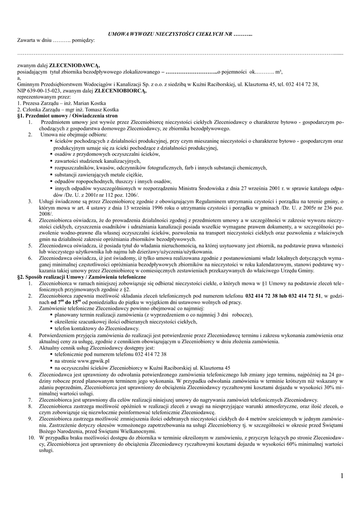 UMOWA WYWOZU NIECZYSTOŚCI CIEKŁYCH NR ……….. Zawarta w dniu ………. pomiędzy: …………………………………………………………………………………………………………………………………………………………....... zwanym dalej ZLECENIODAWCĄ, posiadającym tytuł zbiornika bezodpływowego zlokalizowanego – ………………………..o pojemności ok.………. m³, a, Gminnym Przedsiębiorstwem Wodociągów i Kanalizacji Sp. z o.o. z siedzibą w Kuźni Raciborskiej, ul. Klasztorna 45, tel. 032 414 72 38, NIP 639-00-15-023, zwanym dalej ZLECENIOBIORCĄ, reprezentowanym przez: 1. Prezesa Zarządu – inż. Marian Kostka 2. Członka Zarządu – mgr inż. Tomasz Kostka §1. Przedmiot umowy / Oświadczenia stron 1. Przedmiotem umowy jest wywóz przez Zleceniobiorcę nieczystości ciekłych Zleceniodawcy o charakterze bytowo - gospodarczym pochodzących z gospodarstwa domowego Zleceniodawcy, ze zbiornika bezodpływowego. 2. Umowa nie obejmuje odbioru: ścieków pochodzących z działalności produkcyjnej, przy czym mieszaninę nieczystości o charakterze bytowo - gospodarczym oraz produkcyjnym uznaje się za ścieki pochodzące z działalności produkcyjnej, osadów z przydomowych oczyszczalni ścieków, zawartości studzienek kanalizacyjnych, rozpuszczalników, kwasów, odczynników fotograficznych, farb i innych substancji chemicznych, substancji zawierających metale ciężkie, odpadów ropopochodnych, tłuszczy i innych osadów, innych odpadów wyszczególnionych w rozporządzeniu Ministra Środowiska z dnia 27 września 2001 r. w sprawie katalogu odpa dów /Dz. U. z 2001r nr 112 poz. 1206/. 3. Usługi świadczone są przez Zleceniobiorcę zgodnie z obowiązującym Regulaminem utrzymania czystości i porządku na terenie gminy, o którym mowa w art. 4 ustawy z dnia 13 września 1996 roku o utrzymaniu czystości i porządku w gminach /Dz. U. z 2005r nr 236 poz. 2008/. 4. Zleceniobiorca oświadcza, że do prowadzenia działalności zgodnej z przedmiotem umowy a w szczególności w zakresie wywozu nieczystości ciekłych, czyszczenia osadników i udrażniania kanalizacji posiada wszelkie wymagane prawem dokumenty, a w szczególności po zwolenie wodno-prawne dla własnej oczyszczalni ścieków, pozwolenia na transport nieczystości ciekłych oraz pozwolenia z właściwych gmin na działalność zakresie opróżniania zbiorników bezodpływowych. 5. Zleceniodawca oświadcza, iż posiada tytuł do władania nieruchomością, na której usytuowany jest zbiornik, na podstawie prawa własności lub wieczystego użytkownika lub najmu lub dzierżawy/użyczenia/użytkowania. 6. Zleceniodawca oświadcza, iż jest świadomy, iż tylko umowa realizowana zgodnie z postanowieniami władz lokalnych dotyczących wyma ganej minimalnej częstotliwości opróżniania bezodpływowych zbiorników na nieczystości w roku kalendarzowym, stanowi podstawę wy kazania takiej umowy przez Zleceniobiorcę w comiesięcznych zestawieniach przekazywanych do właściwego Urzędu Gminy. §2. Sposób realizacji Umowy / Zamówienia telefoniczne 1. Zleceniobiorca w ramach niniejszej zobowiązuje się odbierać nieczystości ciekłe, o których mowa w §1 Umowy na podstawie zleceń tele fonicznych przyjmowanych zgodnie z §2. 2. Zleceniobiorca zapewnia możliwość składania zleceń telefonicznych pod numerem telefonu 032 414 72 38 lub 032 414 72 51, w godzinach od 700 do 1500 od poniedziałku do piątku w wyjątkiem dni ustawowo wolnych od pracy. 3. Zamówienie telefoniczne Zleceniodawcy powinno obejmować co najmniej: planowany termin realizacji zamówienia (z wyprzedzeniem o co najmniej 3 dni robocze), określenie szacunkowej ilości odbieranych nieczystości ciekłych, telefon kontaktowy do Zleceniodawcy. 4. Potwierdzeniem przyjęcia zamówienia do realizacji jest potwierdzenie przez Zleceniodawcę terminu i zakresu wykonania zamówienia oraz aktualnej ceny za usługę, zgodnie z cennikiem obowiązującym u Zleceniobiorcy w dniu złożenia zamówienia. 5. Aktualny cennik usług Zleceniodawcy dostępny jest: telefonicznie pod numerem telefonu 032 414 72 38 na stronie www.gpwik.pl na oczyszczalni ścieków Zleceniobiorcy w Kuźni Raciborskiej ul. Klasztorna 45 6. Zleceniodawca jest uprawniony do odwołania potwierdzonego zamówienia telefonicznego lub zmiany jego terminu, najpóźniej na 24 go dziny robocze przed planowanym terminem jego wykonania. W przypadku odwołania zamówienia w terminie krótszym niż wskazany w zdaniu poprzednim, Zleceniobiorca jest uprawniony do obciążenia Zleceniodawcy ryczałtowymi kosztami dojazdu w wysokości 30% mi nimalnej wartości usługi. 7. Zleceniobiorca jest uprawniony dla celów realizacji niniejszej umowy do nagrywania zamówień telefonicznych Zleceniodawcy. 8. Zleceniobiorca zastrzega możliwość opóźnień w realizacji zleceń z uwagi na niesprzyjające warunki atmosferyczne, oraz ilość zleceń, o czym zobowiązuje się niezwłocznie poinformować telefonicznie Zleceniodawcę. 9. Zleceniobiorca zastrzega możliwość zmniejszenia ilości odebranych nieczystości ciekłych do 4 metrów sześciennych w jednym zamówie niu. Zastrzeżenie dotyczy okresów wzmożonego zapotrzebowania na usługi Zleceniobiorcy tj. w szczególności w okresie przed Świętami Bożego Narodzenia, przed Świętami Wielkanocnymi. 10. W przypadku braku możliwości dostępu do zbiornika w terminie określonym w zamówieniu, z przyczyn leżących po stronie Zleceniodawcy, Zleceniobiorca jest uprawniony do obciążenia Zleceniodawcy ryczałtowymi kosztami dojazdu w wysokości 60% minimalnej wartości usługi. 1 11. Potwierdzeniem wykonania zamówienia jest: podpisany przez Zleceniodawcę lub pełnoletniego domownika druk wykonania usługi, albo w przypadku nieobecności Zleceniodawcy lub pełnoletniego domownika druk wykonania usługi wypełniony przez pracownika Zle ceniobiorcy, zgodnie z warunkami zamówienia telefonicznego, którego kopię otr