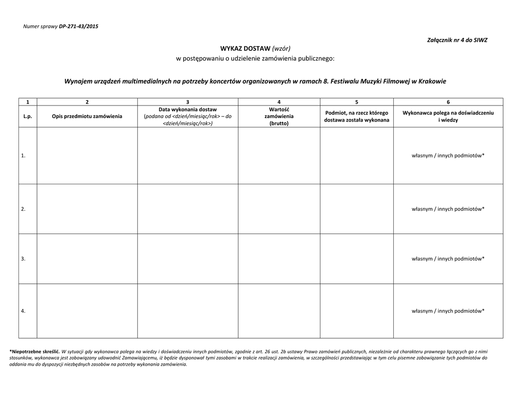 Numer sprawy DP-271-43/2015 Załącznik nr 4 do SIWZ WYKAZ DOSTAW (wzór) w postępowaniu o udzielenie zamówienia publicznego: Wynajem urządzeń multimedialnych na potrzeby koncertów organizowanych w ramach 8. Festiwalu Muzyki Filmowej w Krakowie 1 2 L.p. Opis przedmiotu zamówienia 3 Data wykonania dostaw (podana od <dzień/miesiąc/rok> – do <dzień/miesiąc/rok>) 4 Wartość zamówienia (brutto) 5 6 Podmiot, na rzecz którego dostawa została wykonana Wykonawca polega na doświadczeniu i wiedzy 1. własnym / innych podmiotów* 2. własnym / innych podmiotów* 3. własnym / innych podmiotów* 4. własnym / innych podmiotów* *Niepotrzebne skreślić. W sytuacji gdy wykonawca polega na wiedzy i doświadczeniu innych podmiotów, zgodnie z art. 26 ust. 2b ustawy Prawo zamówień publicznych, niezależnie od charakteru prawnego łączących go z nimi stosunków, wykonawca jest zobowiązany udowodnić Zamawiającemu, iż będzie dysponował tymi zasobami w trakcie realizacji zamówienia, w szczególności przedstawiając w tym celu pisemne zobowiązanie tych podmiotów do oddania mu do dyspozycji niezbędnych zasobów na potrzeby wykonania zamówienia. Numer sprawy DP-271-43/2015 1 2 L.p. Opis przedmiotu zamówienia 3 Data wykonania dostaw (podana od <dzień/miesiąc/rok> – do <dzień/miesiąc/rok>) 4 Wartość zamówienia (brutto) 5. 5 6 Podmiot, na rzecz którego dostawa została wykonana Wykonawca polega na doświadczeniu i wiedzy własnym / innych podmiotów* Składając niniejszy wykaz usług oświadczam, że świadomy jestem odpowiedzialności karnej wynikającej z art. 297 § 1 kodeksu karnego, który stanowi, że kto, w celu uzyskania dla siebie lub kogo innego, od banku lub jednostki organizacyjnej prowadzącej podobną działalność gospodarczą na podstawie ustawy albo od organu lub instytucji dysponujących środkami publicznymi - kredytu, pożyczki pieniężnej, poręczenia, gwarancji, akredytywy, dotacji, subwencji, potwierdzenia przez bank zobowiązania wynikającego z poręczenia lub z gwarancji lub podobnego świadczenia pieniężnego na określony cel gospodarczy, elektronicznego instrumentu płatniczego lub zamówienia publicznego, przedkłada podrobiony, przerobiony, poświadczający nieprawdę albo nierzetelny dokument albo nierzetelne, pisemne oświadczenie dotyczące okoliczności o istotnym znaczeniu dla uzyskania wymienionego wsparcia finansowego, instrumentu płatniczego lub zamówienia, podlega karze pozbawienia wolności od 3 miesięcy do lat 5. ___________________________________ Data i czytelny podpis(y)/ podpis(y) i pieczątka osób/y upoważnionej(ych) do reprezentowania Wykonawcy lub Pełnomocnika Wykonawców wspólnie ubiegających się o udzielenie zamówienia *Niepotrzebne skreślić. W sytuacji gdy wykonawca polega na wiedzy i doświadczeniu innych podmiotów, zgodnie z art. 26 ust. 2b ustawy Prawo zamówień publicznych, niezależnie od charakteru prawnego łączących go z nimi stosunków, wykonawca jest zobowiązany udowodnić Zamawiającemu, iż będzie dysponował tymi zasobami w trakcie realizacji zamówienia, w szczególności przedstawiając w tym celu pisemne zobowiązanie tych podmiotów do oddania mu do dyspozycji niezbędnych zasobów na potrzeby wykonania zamówienia.