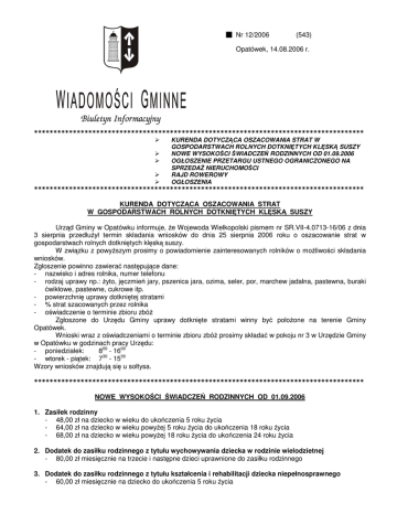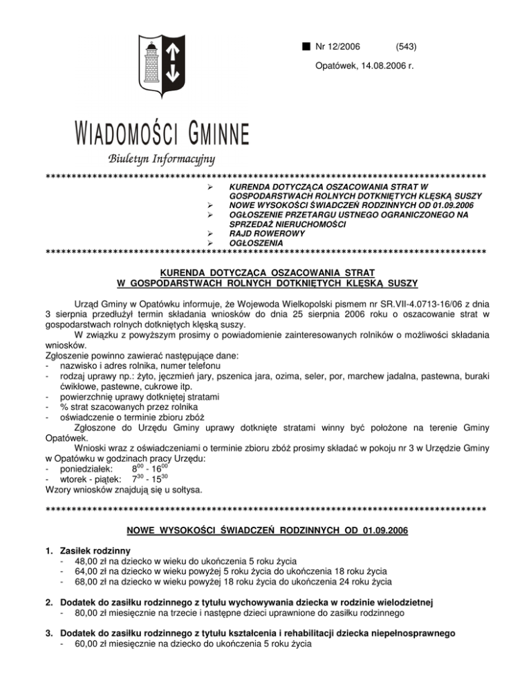 Nr 12/2006 (543) Opatówek, 14.08.2006 r. KURENDA DOTYCZ CA OSZACOWANIA STRAT W GOSPODARSTWACH ROLNYCH DOTKNI TYCH KL SK SUSZY NOWE WYSOKO CI WIADCZE RODZINNYCH OD 01.09.2006 OGŁOSZENIE PRZETARGU USTNEGO OGRANICZONEGO NA SPRZEDA NIERUCHOMO CI RAJD ROWEROWY OGŁOSZENIA KURENDA DOTYCZ CA OSZACOWANIA STRAT W GOSPODARSTWACH ROLNYCH DOTKNI TYCH KL SK SUSZY Urz d Gminy w Opatówku informuje, e Wojewoda Wielkopolski pismem nr SR.VII-4.0713-16/06 z dnia 3 sierpnia przedłu ył termin składania wniosków do dnia 25 sierpnia 2006 roku o oszacowanie strat w gospodarstwach rolnych dotkni tych kl sk suszy. W zwi zku z powy szym prosimy o powiadomienie zainteresowanych rolników o mo liwo ci składania wniosków. Zgłoszenie powinno zawiera nast puj ce dane: - nazwisko i adres rolnika, numer telefonu - rodzaj uprawy np.: yto, j czmie jary, pszenica jara, ozima, seler, por, marchew jadalna, pastewna, buraki wikłowe, pastewne, cukrowe itp. - powierzchni uprawy dotkni tej stratami - % strat szacowanych przez rolnika - o wiadczenie o terminie zbioru zbó Zgłoszone do Urz du Gminy uprawy dotkni te stratami winny by poło one na terenie Gminy Opatówek. Wnioski wraz z o wiadczeniami o terminie zbioru zbó prosimy składa w pokoju nr 3 w Urz dzie Gminy w Opatówku w godzinach pracy Urz du: - poniedziałek: 800 - 1600 - wtorek - pi tek: 730 - 1530 Wzory wniosków znajduj si u sołtysa. NOWE WYSOKO CI WIADCZE RODZINNYCH OD 01.09.2006 1. Zasiłek rodzinny - 48,00 zł na dziecko w wieku do uko czenia 5 roku ycia - 64,00 zł na dziecko w wieku powy ej 5 roku ycia do uko czenia 18 roku ycia - 68,00 zł na dziecko w wieku powy ej 18 roku ycia do uko czenia 24 roku ycia 2. Dodatek do zasiłku rodzinnego z tytułu wychowywania dziecka w rodzinie wielodzietnej - 80,00 zł miesi cznie na trzecie i nast pne dzieci uprawnione do zasiłku rodzinnego 3. Dodatek do zasiłku rodzinnego z tytułu kształcenia i rehabilitacji dziecka niepełnosprawnego - 60,00 zł miesi cznie na dziecko do uko czenia 5 roku ycia - 80,00 zł miesi cznie na dziecko w wieku powy ej 5 roku ycia do uko czenia 24 roku ycia 4. Dodatek do zasiłku rodzinnego z tytułu rozpocz cia roku szkolnego - -100,00 zł na dziecko 5. Dodatek do zasiłku rodzinnego z tytułu podj cia przez dziecko nauki w szkole poza miejscem zamieszkania - 90,00 zł miesi cznie na dziecko, w zwi zku z zamieszkiwaniem w miejscowo ci, w której znajduje si siedziba szkoły ponadgimnazjalnej lub szkoły artystycznej w której realizowany jest obowi zek szkolny i obowi zek nauki - 50,00 zł miesi cznie na dziecko w zwi zku z dojazdem z miejsca zamieszkania do miejscowo ci w której znajduje si siedziba szkoły(szkoły ponadgimnazjalnej i artystycznej) 6. Zasiłek piel gnacyjny - 153,00 zł miesi cznie 7. Dodatek do zasiłku z tytułu urodzenia dziecka - 1.000,00 zł 8. Dodatek do zasiłku rodzinnego z tytułu opieki nad dzieckiem w okresie korzystania z urlopu wychowawczego - 400,00 zł miesi cznie 9. Dodatek z tytułu samotnego wychowywania dziecka - 170,00 zł miesi cznie na dziecko , nie wi cej ni 340,00 zł na wszystkie dzieci - 250,00 zł miesi cznie na dziecko legitymuj ce si orzeczeniem o niepełnosprawno ci lub orzeczeniem o znacznym stopniu niepełnosprawno ci, nie wi cej jednak ni 500,00 zł na wszystkie dzieci 10. wiadczenie piel gnacyjne - 420,00 zł miesi cznie 11. Jednorazowa zapomoga z tytułu urodzenia si ywego dziecka (becikowe) - 1.000,00 zł Wysoko kwoty dochodu na osob w rodzinie uprawniaj cej do otrzymania wiadcze rodzinnych - 504,00 zł Wysoko kwoty dochodu na osob w rodzinie, gdy członkiem rodziny jest dziecko legitymuj ce si orzeczeniem o niepełnosprawno ci lub orzeczeniem o umiarkowanym lub znacznym stopniu niepełnosprawno ci uprawniaj cej do otrzymywania wiadcze rodzinnych - 583,00 zł WÓJT GMINY OPATÓWEK OGŁASZA PRZETARG USTNY OGRANICZONY NA SPRZEDA NIERUCHOMO CI POŁO ONEJ W CIENI PIERWSZEJ OZNACZONEJ JAKO DZIAŁKA NR 125/4 O POW. 1,0018 HA. KSI GA WIECZYSTA NR 39300. Nieruchomo przeznaczona była w planie ogólnym zagospodarowania przestrzennego Gminy Opatówek, obowi zuj cym do 31.12.2003 roku pod tereny projektowanego wysypiska mieci - symbol w planie 19.2 NU. 1. Poło enie działki nr 124/4 oraz wzgl dy społeczno- gospodarcze uzasadniaj przeznaczenie nieruchomo ci pod realizacj inwestycji zwi zanych z wytwarzaniem energii odnawialnych. 2. Do przetargu mog przyst pi osoby: fizyczne lub przedsi biorcy, którzy: 1) maj miejsce zamieszkania lub siedzib na terenie Gminy Opatówek 2) zapewni realizacj inwestycji zwi zanych z wytwarzaniem energii odnawialnych 3. Osoby zamierzaj ce przyst pi do przetargu powinny w terminie do dnia 19 wrze nia 2006 roku do godz. 1500 pisemnie zgłosi swój udział w przetargu zał czaj c do zgłoszenia: 1) dokumenty potwierdzaj ce zamieszkanie lub siedzib przedsi biorcy na terenie Gminy Opatówek, 2) pisemne o wiadczenie, w którym zobowi si zrealizowa inwestycj o której mowa w pkt. 2.2, podaj c rodzaj inwestycji, jej charakterystyk oraz termin jej zrealizowania. Do o wiadczenia zgłaszaj cy powinien zał czy zmierzaj cych do zrealizowania inwestycji. dokumenty, wiadcz ce o podj ciu wst pnych działa 4. Warunkiem dopuszczenia do przetargu jest: 1) spełnienie warunków, o których mowa w pkt. 2 i 3 Ogłoszenia 2) wpłacenie wadium w wysoko ci 1300,00 zł gotówk w kasie Urz du Gminy w godz. 800-1300 najpó niej do dnia 15 wrze nia 2006 roku Cena wywoławcza nieruchomo ci wynosi 25 742,00 zł (słownie: dwadzie cia pi tysi cy siedemset czterdzie ci dwa złote). Przetarg odb dzie si w dniu 21 wrze nia 2006r o godz.10°° w sali posiedze tutejszego Urz du. 5. Wadium osoby wygrywaj cej przetarg zalicza si na poczet ceny nabycia nieruchomo ci. Wadium pozostałych uczestników przetargu zostanie wypłacone zgodnie z regulaminem przetargu. W przypadku uchylenia si osoby wygrywaj cej przetarg od zawarcia aktu notarialnego wadium ulega przepadkowi. 6. Cena osi gni ta w przetargu płatna jest w cało ci przed podpisaniem aktu