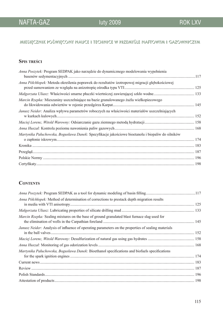 SpiS treści Anna Poszytek: Program SEDPAK jako narzędzie do dynamicznego modelowania wypełnienia basenów sedymentacyjnych....................................................................................................................................117 Anna Półchłopek: Metoda określenia poprawek do rezultatów izotropowej migracji głębokościowej przed sumowaniem ze względu na anizotropię ośrodka typu VTI......................................................................... 125 Małgorzata Uliasz: Właściwości smarne płuczki wiertniczej zawierającej szkło wodne........................................... 133 Marcin Rzepka: Mieszaniny uszczelniające na bazie granulowanego żużla wielkopiecowego do likwidowania odwiertów w rejonie przedgórza Karpat..................................................................................... 145 Janusz Neider: Analiza wpływu parametrów roboczych na właściwości materiałów uszczelniających w kurkach kulowych............................................................................................................................................... 152 Maciej Lorenc, Witold Warowny: Odsiarczanie gazu ziemnego metodą hydratacji.................................................... 158 Anna Huszał: Kontrola poziomu nawonienia paliw gazowych................................................................................... 168 Martynika Pałuchowska, Bogusława Danek: Specyfikacje jakościowe bioetanolu i biopaliw do silników o zapłonie iskrowym............................................................................................................................................... 174 Kronika........................................................................................................................................................................ 183 Przegląd........................................................................................................................................................................ 187 Polskie Normy............................................................................................................................................................. 196 Certyfikaty.................................................................................................................................................................... 198 contentS Anna Poszytek: Program sedPak as a tool for dynamic modeling of basin filling....................................................117 Anna Półchłopek: Method of determination of corrections to prestack depth migration results in media with VTI anisotropy................................................................................................................................. 125 Małgorzata Uliasz: Lubricating properties of silicate drilling mud............................................................................ 133 Marcin Rzepka: Sealing mixtures on the base of ground granulated blast furnace slag used for the elimination of wells in the Carpathian foreland............................................................................................... 145 Janusz Neider: Analysis of influence of operating parameters on the properties of sealing materials in the ball valves..................................................................................................................................................... 152 Maciej Lorenc, Witold Warowny: Desulfurization of natural gas using gas hydrates................................................. 158 Anna Huszał: Monitoring of gas odorization levels.................................................................................................... 168 Martynika Pałuchowska, Bogusława Danek: Bioethanol specifications and biofuels specifications for the spark ignition engines................................................................................................................................. 174 Current news................................................................................................................................................................ 183 Review......................................................................................................................................................................... 187 Polish Standards........................................................................................................................................................... 196 Attestation of products................................................................................................................................................. 198 115