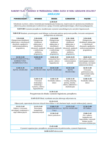 RAMOWY PLAN TYGODNIA W PRZEDSZKOLU ZEBRA ZUZIA W ROKU SZKOLNYM 2016/2017 PONIEDZIAŁEK KRÓLICZKI WTOREK ŚRODA 6:30-8:45 CZWARTEK PIĄTEK Schodzenie się dzieci, zabawy konstrukcyjne/manipulacyjne/tematyczne, inspirowanie do spontanicznej działalności zabawowej, praca stymulacyjno-wychowawcza z grupą, ćwiczenia ogólnousprawniające, obserwacja pedagogiczna. 8:45-9:00 Czynności porządkowe, kształtowanie czynności samoobsługowych, nawyków higienicznych. 9:00-9:30 Śniadanie, przestrzeganie zasad dobrego wychowania podczas spożywania posiłku, ćwiczenie umiejętności 9.30-10.00 Zintegrowana działalność edukacyjna w określonych obszarach, zgodnych z realizowaną podstawą programową 10:30-11:00 KARATE/GIMNASTYKA KOREKCYJNOKOMPENSACYJNA 11:00-11.30 JĘZYK ANGIELSKI posługiwania się sztućcami. 9:30-10:00 Zintegrowana działalność edukacyjna w określonych obszarach, zgodnych z realizowaną podstawą programową 10.00-10:30 TANIEC 9:30-10:00 Zintegrowana działalność edukacyjna w określonych obszarach, zgodnych z realizowaną podstawą programową 10.00-10.30 Gimnastyka buzi i języka- zabawy logopedyczne 10:30-11:00 10:30-11:00 JĘZYK FRANCUSKI JĘZYK ANGIELSKI 11:00-11:30 Ćwiczenia doskonalące artykulację i wymowę, zabawy logorytmiczne 11.00-11.30 Swobodne zabawy dzieci 9.30- 10.00 Zintegrowana działalność edukacyjna w określonych obszarach, zgodnych z realizowaną podstawą programową 10:00-10:30 Zabawy grupowe z wykorzystaniem piosenek 10.30-11:00 JĘZYK FRANCUSKI 11:00-11:30 Cmokaj, dmuchaj, parskaj, chuchaj – zabawy oddechowe i artykulacyjne 9:30-10:00 Zintegrowana działalność edukacyjna w określonych obszarach, zgodnych z realizowaną podstawą programową 10.00-10.30 Gry i zabawy planszowe wspomagające pamięć i koncentracje, rozwijanie zainteresowań dzieci 10:30-11:00 Ćwiczenia grafomotoryczne, usprawnianie małej motoryki 11:00-11:30 Swobodne zabawy dzieci 11:30-11:45 Przygotowane do obiadu: czynności higieniczne, porządkowe. 11:45-12:15 Obiad, wyrabianie nawyku zdrowego odżywiania się 12:15-13:15 Odpoczynek, zapewnienie dzieciom różnych form relaksu w sali (słuchanie bajek, muzyki relaksacyjnej), spacery 13:15-13:45 Zabawy i ćwiczenia utrwalające wiadomości z zajęć edukacyjnych. 13:15-13:45 Rozwijanie kompetencji matematycznych 13:00-13:30 13:15-13:45 DOGOTERAPIA (co JĘZYK ANGIELSKI 2 tyg.) 13.30-13.45 Zabawy paluszkowe 12:30-13:00 RYTMIKA 13.00-13.45 Gry i zabawy logopedyczne, logorytmika, wierszyki łamiące języki, ćwiczenia artykulacyjne 13.45-14.00 Czynności organizacyjno- porządkowe, przygotowanie do podwieczorku, czynności higieniczne. 14:00-14:30 Podwieczorek 14:30-15:15 Zabawy stymulujące aktywność dziecka: integracyjne/tematyczne/ruchowe, obserwacja pedagogiczna, praca indywidualna z dzieckiem, praca indywidualna z książką 15:15-18:30 Zabawy swobodne w sali, tworzenie sytuacji rozwijających indywidualne zdolności i zainteresowania dzieci. Rozchodzenie się dzieci WYCHOWAWCY Dominika Ciesielska, Ilona Stachera