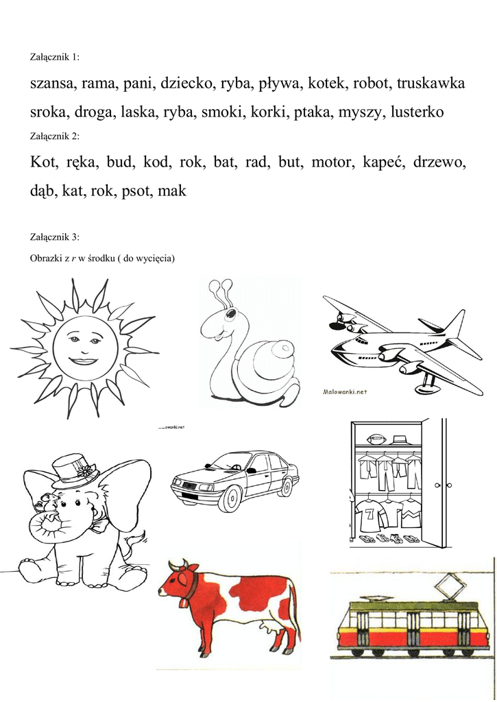 Załącznik 1: szansa, rama, pani, dziecko, ryba, pływa, kotek, robot, truskawka sroka, droga, laska, ryba, smoki, korki, ptaka, myszy, lusterko Załącznik 2: Kot, ręka, bud, kod, rok, bat, rad, but, motor, kapeć, drzewo, dąb, kat, rok, psot, mak Załącznik 3: Obrazki z r w środku ( do wycięcia) Załącznik 4 Załącznik 5 – do wycięcia b . t, k . s, d . m, r . k, r . k, b . t, l . t, l . s, d . m, b . k, b . l, l . s, c . l, ł . k, ż . k