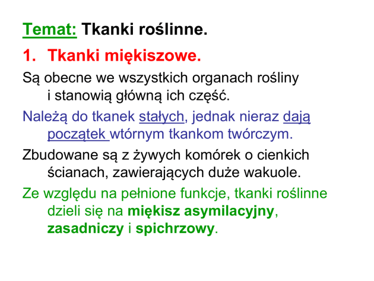 Temat: Tkanki roślinne. 1. Tkanki miękiszowe. Są obecne we wszystkich organach rośliny i stanowią główną ich część. Należą do tkanek stałych, jednak nieraz dają początek wtórnym tkankom twórczym. Zbudowane są z żywych komórek o cienkich ścianach, zawierających duże wakuole. Ze względu na pełnione funkcje, tkanki roślinne dzieli się na miękisz asymilacyjny, zasadniczy i spichrzowy. a) Miękisz asymilacyjny – występuje we wszystkich zielonych częściach roślin: liściach, a także w położonych blisko skórki, częściach łodyg roślin zielnych. Cechy komórek: Zawierają liczne chloroplasty – proces fotosyntezy. Zazwyczaj komórki tego miękiszu leżą tuż pod skórką. Miękisz palisadowy • Komórki są wydłużone. • Położone prostopadle do powierzchni liści – łatwo przenika do nich światło. • Chloroplasty mogą przemieszczać się w komórkach w zależności od natężenia światła. Miękisz gąbczasty Komórki mają kształt nieregularny. Zawierają mniej chloroplastów. Pomiędzy komórkami znajdują się przestwory komórkowe, ułatwiające przemieszczanie się w liściu tlenu, pary wody i dwutlenku węgla. b) Miękisz zasadniczy – wypełnia wolne miejsce pomiędzy innymi tkankami rośliny. Cechy komórek: Występuje głównie w młodych liściach i korzeniach. Komórki mają zróżnicowany kształt. Komórki nie przylegają ściśle do siebie – liczne przestwory międzykomórkowe. c) Miękisz spichrzowy – jego funkcją jest magazynowanie substancji: cukrów, tłuszczów, białek. Cechy komórek: Mają cienkie ściany. Występują w organach spichrzowych roślin – korzeniach marchwi, bulwach ziemniaka, nasionach fasoli. Mogą gromadzić także wodę – miękisz wodonośny u roślin sucholubnych np. kaktusów, liściach agawy. 2. Tkanki przewodzące. Dostarczają do wszystkich tkanek i organów rośliny, pobieraną z podłoża wodę z solami mineralnymi oraz wytworzone w organach asymilacyjnych (głównie liściach) produkty fotosyntezy (glukozę). Wyróżnia się dwa rodzaje tkanek przewodzących: drewno i łyko. a) Drewno (ksylem) – transportuje wodę i sole mineralne od korzenia do pozostałych części rośliny. Na wiosnę transportuje także substancje odżywcze z korzeni do rozwijających się pędów i liści. Pełni także funkcję podporową. Cechy budowy: Zbudowane z wydłużonych walcowatych komórek, ułożonych jedne nad drugimi. Tworzą naczynia. Komórki są martwe i puste w środku. Pomiędzy komórkami nie ma ścian poprzecznych. Elementy drewna Cewki Wydłużone komórki o ślepo zakończonych i zaostrzonych końcach. Cewki silnie do siebie przylegają bocznymi ścianami, a ruch wody odbywa się z cewki do cewki przez jamki lejkowate. Cewki występują jako element drewna u paprotników i roślin nagozalążkowych. Naczynia Ewolucyjnie są młodsze od cewek. Charakterystyczne dla roślin okrytozalążkowych. W ścianach podłużnych znajdują się jamki lejkowate, dzięki którym woda przedostaje się także pomiędzy komórkami. Ściana wtórna naczyń daje nieregularne zgrubienia w postaci spiralnej, siatkowatej, pierścieniowej, jamkowatej. b) Łyko (floem) – przewodzi na odległość substancje organiczne głównie cukry od liści do korzeni. Składa się z kilku elementów: rurek sitowych, komórek sitowych i komórek przyrurkowych. Rurki sitowe: Zbudowane z żywych komórek. Mają wydłużony kształt – tworzą tzw. człony połączone w szeregi. Ściany zbudowane są z celulozy. W komórce znajduje się duża wakuola. Na poprzecznych płaszczyznach znajdują się perforowane ściany – sita. Przez otwory przenikają pasma cytoplazmy , które łączą ze sobą poszczególne człony rurki. Komórki sitowe Są zbudowane z żywych komórek. Mają wrzecionowaty kształt. W ścianach znajdują się skupienia otworów – pola sitowe. Przez otwory sit przechodzą pasma cytoplazmy i łączą ze sobą poszczególne komórki, umożliwiając transport substancji odżywczych. Są charakterystyczne dla paprotników i roślin nagozalążkowych. 3. Tkanki wzmacniające. Tkanki te zapewniają roślinom zachowanie określonego kształtu oraz odporności na działanie czynników mechanicznych np. wiatru. Wyróżniamy dwa rodzaje tkanek wzmacniających: twardzicę i zwarcicę. a) Twardzica – występuje w starszych, wyrośniętych nadziemnych częściach roślin. Cechy komórek: Dojrzałe komórki są martwe. Mają zgrubiałe i silnie zdrewniałe ściany komórkowe wysycone ligniną. Ma dużą odporność na rozciąganie, ściskanie, zginanie czy skręcanie. b) Zwarcica – występuje w nadziemnych organach roślin, zwykle w ogonkach liściowych i młodych częściach łodyg. Cechy komórek: Są żywe. Silnie do siebie przylegają. Mają nieregularny kształt. Ściany są silnie zgrubiałe, ale elastyczne. Chronią delikatne części roślin przed złamaniem lub rozerwaniem.