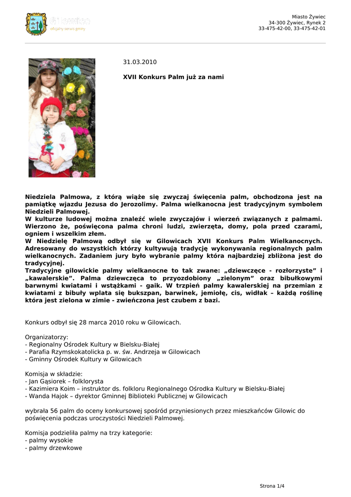 Miasto Żywiec 34-300 Żywiec, Rynek 2 33-475-42-00, 33-475-42-01 31.03.2010 XVII Konkurs Palm już za nami Niedziela Palmowa, z którą wiąże się zwyczaj święcenia palm, obchodzona jest na pamiątkę wjazdu Jezusa do Jerozolimy. Palma wielkanocna jest tradycyjnym symbolem Niedzieli Palmowej. W kulturze ludowej można znaleźć wiele zwyczajów i wierzeń związanych z palmami. Wierzono że, poświęcona palma chroni ludzi, zwierzęta, domy, pola przed czarami, ogniem i wszelkim złem. W Niedzielę Palmową odbył się w Gilowicach XVII Konkurs Palm Wielkanocnych. Adresowany do wszystkich którzy kultywują tradycję wykonywania regionalnych palm wielkanocnych. Zadaniem jury było wybranie palmy która najbardziej zbliżona jest do tradycyjnej. Tradycyjne gilowickie palmy wielkanocne to tak zwane: „dziewczęce - rozłorzyste” i „kawalerskie”. Palma dziewczęca to przyozdobiony „zielonym” oraz bibułkowymi barwnymi kwiatami i wstążkami - gaik. W trzpień palmy kawalerskiej na przemian z kwiatami z bibuły wplata się bukszpan, barwinek, jemiołę, cis, widłak – każdą roślinę która jest zielona w zimie - zwieńczona jest czubem z bazi. Konkurs odbył się 28 marca 2010 roku w Gilowicach. Organizatorzy: - Regionalny Ośrodek Kultury w Bielsku-Białej - Parafia Rzymskokatolicka p. w. św. Andrzeja w Gilowicach - Gminny Ośrodek Kultury w Gilowicach Komisja w składzie: - Jan Gąsiorek – folklorysta - Kazimiera Koim – instruktor ds. folkloru Regionalnego Ośrodka Kultury w Bielsku-Białej - Wanda Hajok – dyrektor Gminnej Biblioteki Publicznej w Gilowicach wybrała 56 palm do oceny konkursowej spośród przyniesionych przez mieszkańców Gilowic do poświęcenia podczas uroczystości Niedzieli Palmowej. Komisja podzieliła palmy na trzy kategorie: - palmy wysokie - palmy drzewkowe Strona 1/4 Miasto Żywiec 34-300 Żywiec, Rynek 2 33-475-42-00, 33-475-42-01 - palmy bukietowe W kategorii palm wysokich przyznano: - szesnaście równorzędnych pierwszych nagród, które otrzymali: • • • • • • • • • • • • • • • • Barbara Dudzik – Świnna, ul. Zachodnia 26 Aleksandra Dudzik – Świnna, ul. Zachodnia 26 Jolanta Marszałek (Warsztaty Terapii Zajęciowej) – Gilowice, ul. Rozcięta Lucyna i Przemysław Gibas – Gilowice, ul. Za Wodą 4 Regionalny Zespół Dolanie, Gilowice Marcin Pożoga – Gilowice, ul. Na Grapie 32 Gabriela Kieruzel – Gilowice, ul. Krakowska 181 Andrzej Walaszek – Gilowice, ul. Krakowska 229 Maksymilian Pyclik – Gilowice, ul. Krakowska 58 Arleta Walaszek, Gilowice, ul. Kamienna 14 Dominika Tomaszek – Gilowice, ul. Tekielich 2 Milena Kamecka – Gilowice, ul. Krakowska 76 Tymoteusz Kamecki - Gilowice, ul. Krakowska 76 Grzegorz i Krzysztof Janiczak – Gilowice, ul. Krakowska 57 Aleksandra Kastelik – Gilowice, ul. Wiśniowa 12 Brygida i Martyna Janeczko – Gilowice, ul. Wiśniowa 8 - cztery równorzędne drugie nagrody, które otrzymali: • Katarzyna Górna – Gilowice, ul. Siedlakówka 12 • Natalia Firlej – Gilowice, ul. Wesoła 8 • Marta Przeworczyk – Gilowice, ul. Krakowska 31 • Weronika Ormaniec – Gilowice, ul. Kwiatowa 8 - osiem równorzędnych trzecich nagród, które otrzymali: • • • • • • • • Jacek Wąsek – Gilowice, ul. Krakowska 122 Marcin Kastelik – Gilowice, ul. Wierzbowa 10 Julia Wójcik – Gilowice, ul. Wąska 2, Filip Mordarski – Żywiec ul. Okrężna 23 Weronika Pilarczyk – Gilowice, ul. Poręby 2 Daria Tułodziecka – Gilowice, ul. Wąska 26 Aneta Płużek – Gilowice, ul. Wąska 26 Adrian i Szymon Biernat – Gilowice, ul. Kasztanowa 22 Michał Biernat – Gilowice, ul. Kasztanowa 22 W kategorii palm drzewkowych przyznano: - pięć równorzędnych pierwszych nagród, które otrzymali: • Katarzyna Sura – Gilowice, ul. Kantykówka 1 • Maria Łoboda – Gilowice, ul. Pokusy 14 • Krystian Szymczak – Gilowice, ul. Podgórze 1 • Dominika Pajor – Ślemień, ul. Wspólna 30 • Wioletta Bodzek – Gilowice, ul. Krakowska 58 i Klaudia Wnętrzak – Gilowice, ul. Gieleciaki 4 - osiem równorzędnych drugich nagród, które otrzymali: Strona 2/4 Miasto Żywiec 34-300 Żywiec, Rynek 2 33-475-42-00, 33-475-42-01 • • • • • • • • Ewa Marek – Gilowice, ul. Marszałki 42b Patrycja Kastelik – Gilowice, ul. Wesoła10 Anna i Maria Pożoga – Gilowice, ul. Na Grapie 32 Alicja Pajor – Ślemień, ul. Wspólna 30 Katarzyna Pożoga, Gilowice, ul. Na Grapie 32 Paulina Wnętrzak – Gilowice, ul. Gieleciaki 4 Kinga Midor – Gilowice, ul. Sportowa 7 Wojciech Woźniak – Rychwałd, ul. Młyńska 38 - siedem równorzędnych trzecich nagród, które otrzymali: • • • • • • • Weronika Łoboda – Gilowice, ul. Krakowska 185 Małgorzata Pajor – Ślemień, ul. Wspólna 30 Monika Zając – Gilowice, ul. Kantykówka 10 Julia i Dominik Micor – Gilowice, ul. Michałki 1 Michał Micor – Gilowice, ul. Michałki 1 Justyna i Krzysztof Pochopień – Gilowice, ul. Sroki 2 Anna i Angelika Majerczyk – Gilowice, ul. Rolna 6 - wyróżnienie otrzymała: • Sonia Ostrowska – Gilowice, ul. Beriniego 38 W kategorii palm bukietowych przyznano: - pierwsze miejsce dla: • Artura Pilarczyka – Gilowice, ul. Poręby 2 - sześć wyróżnień, które otrzymali: • • • • • • Wioletta Wnętrzak – Gilowice, ul. Gieleciaki 4 Dominik Pochopień – Gilowice, ul. Marszałki 36 Izabela Pyclik – Gilowice, ul. Krakowska 58 Dorota Szymczak – Gilowice, ul. Podgórze 1 Halina Kantyka – Gilowice, ul. Krakowska 73 Żaneta i Patryk Rus – Gilowice, ul. Cicha 4 Fundatorami nagród są: Gminny Ośrodek Kultury w Gilowicach oraz Regionalny Ośrodek Kultury w Bielsku-Białej. Komisja serdecznie dziękuje mieszkańcom Gilowic za udział w Konkursie. Szczególne podziękowania kierujemy pod adresem autorów palm wysokich. W tym roku na I nagrodę zasługiwało aż 16 palm w tej kategorii. Wszystkie odznaczały się starannością wykonania 