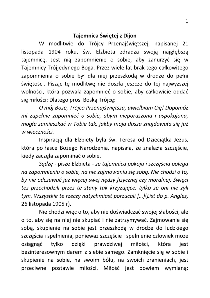 1 Tajemnica Świętej z Dijon W modlitwie do Trójcy Przenajświętszej, napisanej 21 listopada 1904 roku, św. Elżbieta zdradza swoją najgłębszą tajemnicę. Jest nią zapomnienie o sobie, aby zanurzyć się w Tajemnicy Trójjedynego Boga. Przez wiele lat brak tego całkowitego zapomnienia o sobie był dla niej przeszkodą w drodze do pełni świętości. Pisząc tę modlitwę nie doszła jeszcze do tej najwyższej wolności, która pozwala zapomnieć o sobie, aby całkowicie oddać się miłości: Dlatego prosi Boską Trójcę: O mój Boże, Trójco Przenajświętsza, uwielbiam Cię! Dopomóż mi zupełnie zapomnieć o sobie, abym nieporuszona i uspokojona, mogła zamieszkać w Tobie tak, jakby moja dusza znajdowała się już w wieczności. Inspiracją dla Elżbiety była św. Teresa od Dzieciątka Jezus, która po łasce Bożego Narodzenia, napisała, że znalazła szczęście, kiedy zaczęła zapominać o sobie. Sądzę - pisze Elżbieta - że tajemnica pokoju i szczęścia polega na zapomnieniu o sobie, na nie zajmowaniu się sobą. Nie chodzi o to, by nie odczuwać już więcej swej nędzy fizycznej czy moralnej. Święci też przechodzili przez te stany tak krzyżujące, tylko że oni nie żyli tym. Wszystkie te rzeczy natychmiast porzucali […](List do p. Angles, 26 listopada 1905 r). Nie chodzi więc o to, aby nie doświadczać swojej słabości, ale o to, aby się na niej nie skupiać i nie zatrzymywać. Zajmowanie się sobą, skupienie na sobie jest przeszkodą w drodze do ludzkiego szczęścia i spełnienia, ponieważ szczęście i spełnienie człowiek może osiągnąć tylko dzięki prawdziwej miłości, która jest bezinteresownym darem z siebie samego. Zamknięcie się w sobie i skupienie na sobie, na swoim bólu, na swoich zranieniach, jest przeciwne postawie miłości. Miłość jest bowiem wymianą: 2 dawaniem i przyjmowaniem. Zakłada otwartość. Dlatego kiedy zauważymy pokusę zamknięcia się w sobie, należy wyjść ku Bogu, zanurzyć się w Jego miłującej obecności. To właśnie, że dusza zapomina o sobie i rzuca się w objęcia Boga, przynosi Mu więcej chwały i radości niż wszelkie zastanawianie się nad sobą i wszelkie rachunki sumienia, w jakich dusza widzi tylko własne ułomności, a zapomina o Zbawicielu, który żyje we wnętrzu jej duszy i tylko czeka, by ją oczyścić. (List do pani Angles, 26 listopada 1905 r). Bardzo ważne, aby w czasie rachunku sumienia czy podczas wysiłków poznania siebie, pracy nad sobą nie skupiać się tylko na własnych słabościach, ale aby to wszystko dokonywać w świetle Bożego spojrzenia. Doświadczenie pokazuje, że samo poznanie siebie nie wystarczy, by zostać uzdrowionym. Z pomocą psychoanalizy można z czasem lepiej zrozumieć, dlaczego i jak powstały w nas pewne powikłania i zranienia, ale nie mamy gwarancji, że zostaniemy uleczeni. Nasze zranienia topnieją tylko wtedy, kiedy wejdą w kontakt z ciepłem miłości. Nie oczyścimy się rozważając nędzę naszą, lecz wpatrując się w Tego, który jest samą czystością i świętością – pisze Elżbieta. Aby zobaczyć siebie od innej strony, od strony Boga, należy odchodzić od siebie i spoglądać na Boga. Jego spojrzenie jest zarówno światłem, jak i ciepłem miłości. Odsłania nie tylko naszą nagość i słabość, ale także dobro i piękno. Przypomina nam, że jesteśmy Jego umiłowanymi dziećmi, stworzonymi na Jego obraz i podobieństwo. Bóg zaprasza nas, byśmy spojrzeli na siebie Jego oczyma. W Bożym świetle można lepiej poznać siebie. Kiedy spojrzysz głęboko w siebie, zobaczysz Kogoś, kto patrzy na ciebie pisze św. Augustyn. Spotkasz ciepłe, pełne miłości spojrzenie. 3 Tajemnicą modlitwy karmelitańskiej, jest właśnie pełne miłości zapatrzenie się w Pana. Św. Teresa od Jezusa pragnie nieustannie wpatrywać się w Tego, którego miłuje. Dlatego pisze do swych córek w Karmelu: Nie żądam od was o Nim rozmyślań ani natężonej pracy rozumu, ani zdobywania się na piękne, wysokie myśli i uczucia - żądam tylko, byście na Niego patrzyły (Droga doskonałości26,3) Natomiast święty Jan od Krzyża mówi o „aktach anagogicznych”, jako o najlepszym środku na nasze słabości. Polegają one na odwróceniu uwagi od siebie i sytuacji, w jakiej się znajdujemy, aby zamiast tego skierować swój wzrok na Boga. Św. Elżbieta mówiąc o zapomnieniu o sobie, aby zanurzyć się miłującej obecności Boga, znajduje się w samym sercu tradycji Karmelu. Pisze do pani Angles: On chce, byś wyszła z siebie samej, byś porzuciła wszelką troskę i zamknęła się w samotności, jaką wybrał sobie w głębi twego serca. On tam zawsze przebywa, choćbyś nie odczuwała Jego obecności. Oczekuje Ciebie i chce nawiązać z Tobą „prawdziwą zażyłość” – „admirabile commercium” – jak śpiewamy w naszej pięknej liturgii – zjednoczenie Oblubieńca z oblubienicą. On to przez ciągłą łączność z tobą chce uwolnić cię od ułomności i błędów, od wszystkiego, co cię niepokoi (List do p. Angles, 26 listopada 1905 r.) Św. Elżbieta wskazuje drogę szczęścia jako wyjście z siebie, z pustej, jałowej samotności skupionej na sobie, na swojej nędzy i zranieniach, aby zanurzyć się w wewnętrznej przestrzeni zamieszkanej przez Trójcę Świętą. Tę tajemnicę wyśpiewuje dzisiaj harfa moja. Jak do Zacheusza, tak i do mnie wyrzekł Mistrz: „Zejdź prędko, albowiem dziś muszę zatrzymać się w twoim domu” (Łk 19,5). „Zejdź prędko”. Ale dokąd? W najgłębszą głębię mojego jestestwa, opuściwszy 4 wpierw siebie, rozłączywszy się ze sobą, wyrzekłszy się siebie, jednym słowem bez siebie samej. „Muszę zatrzymać się w twoim domu”. Mistrz mój wyraża wobec mnie to pragnienie, chcąc zamieszkać we mnie z Ojcem i Duchem miłości, abym „miała z Nimi uczestnictwo” (por. 1 J 1,3) (Ostatnie rekolekcje, dzień 16). Skutkiem, owocem całkowitego zapomnienia o