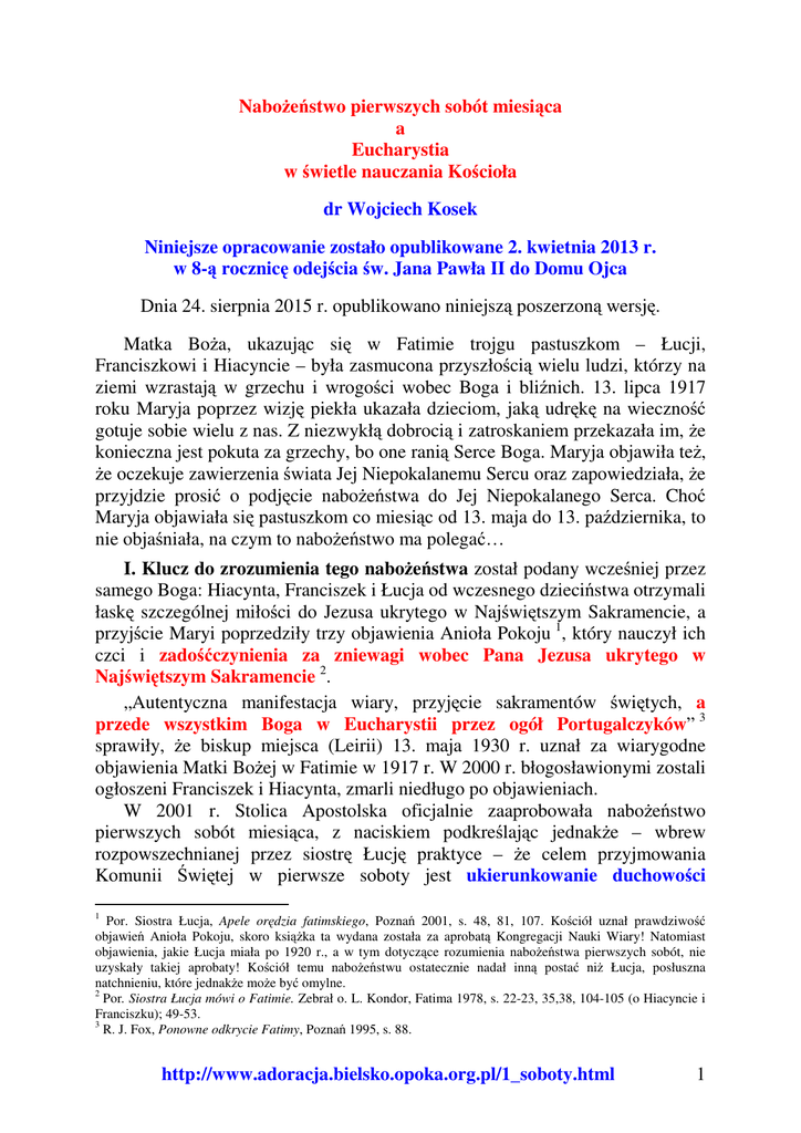 Nabożeństwo pierwszych sobót miesiąca a Eucharystia w świetle nauczania Kościoła dr Wojciech Kosek Niniejsze opracowanie zostało opublikowane 2. kwietnia 2013 r. w 8-ą rocznicę odejścia św. Jana Pawła II do Domu Ojca Dnia 24. sierpnia 2015 r. opublikowano niniejszą poszerzoną wersję. Matka Boża, ukazując się w Fatimie trojgu pastuszkom – Łucji, Franciszkowi i Hiacyncie – była zasmucona przyszłością wielu ludzi, którzy na ziemi wzrastają w grzechu i wrogości wobec Boga i bliźnich. 13. lipca 1917 roku Maryja poprzez wizję piekła ukazała dzieciom, jaką udrękę na wieczność gotuje sobie wielu z nas. Z niezwykłą dobrocią i zatroskaniem przekazała im, że konieczna jest pokuta za grzechy, bo one ranią Serce Boga. Maryja objawiła też, że oczekuje zawierzenia świata Jej Niepokalanemu Sercu oraz zapowiedziała, że przyjdzie prosić o podjęcie nabożeństwa do Jej Niepokalanego Serca. Choć Maryja objawiała się pastuszkom co miesiąc od 13. maja do 13. października, to nie objaśniała, na czym to nabożeństwo ma polegać… I. Klucz do zrozumienia tego nabożeństwa został podany wcześniej przez samego Boga: Hiacynta, Franciszek i Łucja od wczesnego dzieciństwa otrzymali łaskę szczególnej miłości do Jezusa ukrytego w Najświętszym Sakramencie, a przyjście Maryi poprzedziły trzy objawienia Anioła Pokoju 1, który nauczył ich czci i zadośćczynienia za zniewagi wobec Pana Jezusa ukrytego w Najświętszym Sakramencie 2. „Autentyczna manifestacja wiary, przyjęcie sakramentów świętych, a przede wszystkim Boga w Eucharystii przez ogół Portugalczyków” 3 sprawiły, że biskup miejsca (Leirii) 13. maja 1930 r. uznał za wiarygodne objawienia Matki Bożej w Fatimie w 1917 r. W 2000 r. błogosławionymi zostali ogłoszeni Franciszek i Hiacynta, zmarli niedługo po objawieniach. W 2001 r. Stolica Apostolska oficjalnie zaaprobowała nabożeństwo pierwszych sobót miesiąca, z naciskiem podkreślając jednakże – wbrew rozpowszechnianej przez siostrę Łucję praktyce – że celem przyjmowania Komunii Świętej w pierwsze soboty jest ukierunkowanie duchowości 1 Por. Siostra Łucja, Apele orędzia fatimskiego, Poznań 2001, s. 48, 81, 107. Kościół uznał prawdziwość objawień Anioła Pokoju, skoro książka ta wydana została za aprobatą Kongregacji Nauki Wiary! Natomiast objawienia, jakie Łucja miała po 1920 r., a w tym dotyczące rozumienia nabożeństwa pierwszych sobót, nie uzyskały takiej aprobaty! Kościół temu nabożeństwu ostatecznie nadał inną postać niż Łucja, posłuszna natchnieniu, które jednakże może być omylne. 2 Por. Siostra Łucja mówi o Fatimie. Zebrał o. L. Kondor, Fatima 1978, s. 22-23, 35,38, 104-105 (o Hiacyncie i Franciszku); 49-53. 3 R. J. Fox, Ponowne odkrycie Fatimy, Poznań 1995, s. 88. http://www.adoracja.bielsko.opoka.org.pl/1_soboty.html 1 maryjnej na Chrystusa, na Jego paschalne zwycięstwo, na Eucharystię: „tę pobożną praktykę powinno się rozumieć jako okazję sprzyjającą głębokiemu, na wzór postawy Maryi, przeżywaniu tajemnicy paschalnej Chrystusa, celebrowanej w Eucharystii” 4. Bóg przez Kościół przekazuje nam zatem, iż chce, aby w tym nabożeństwie, ściśle związanym z «wydarzeniem Fatimy», akcent był położony na zjednoczeniu z Chrystusem w bólu Jego zbawczej Ofiary, poniesionej za wszystkie grzechy ludzi (a w tym i za grzechy popełnione wobec Jego Najświętszej Matki Maryi). Bóg za pośrednictwem Kościoła ogłasza, że Osobą, ku której prowadzi nas Maryja poprzez nabożeństwo pierwszych sobót, jest nie Ona sama, lecz Jezus Chrystus, wobec którego uczniowie Maryi nauczyć się mają tak głębokiej czci, jaką ma Niepokalane Jej Serce, bez ograniczeń poświęcone współpracy z Synem w Jego misji zwyciężania zła, aż po złożenie Ofiary na Golgocie. Potwierdzeniem konieczności ukierunkowania pobożności maryjnej ku zjednoczeniu nas z Chrystusem, z Jego Ofiarą paschalną, która jako jedyna moc duchowa zdolna jest przezwyciężyć zło świata, są liczne wypowiedzi Stolicy Apostolskiej, które wprawdzie znamy, ale w których tego ukierunkowania dotychczas nie dostrzegaliśmy. Oto niektóre z nich. Kongregacja Nauki Wiary, Orędzie fatimskie, 13. maja 2000 r. W ramy tego dokumentu zostały włączone: a). Jan Paweł II, Akt zawierzenia Niepokalanemu Sercu Maryi (25 marca 1984 r. na placu św. Piotra). „… Stając oto przed Tobą, Matko Chrystusa, przed Twoim Niepokalanym Sercem, pragniemy wraz z całym Kościołem zjednoczyć się z ofiarą, którą z miłości do nas Syn Twój złożył z samego siebie Ojcu: «Za nich Ja poświęcam w ofierze samego siebie – powiedział – aby i oni byli uświęceni w prawdzie» (J 17,19). Pragniemy zjednoczyć się z naszym Odkupicielem w tym poświęceniu się za świat i za ludzi, które w Jego Boskim Sercu ma moc wyjednać przebaczenie i stać się zadośćuczynieniem. Moc tego poświęcenia trwa po wszystkie czasy i ogarnia wszystkich ludzi, ludy i narody, przezwycięża wszelkie zło, jakie duch ciemności potrafi wzbudzić w sercu człowieka i w jego historii i jakie istotnie wzbudził w naszych czasach. O, jak głęboko odczuwamy potrzebę ofiarowania się za ludzkość i za świat, za świat naszych czasów, w zjednoczeniu z samym Chrystusem! Świat bowiem musi mieć udział w odkupieńczej ofierze Chrystusa za pośrednictwem Kościoła. Znakiem tego jest obecny Rok Odkupienia: nadzwyczajny Jubileusz całego Kościoła. Bądź błogosławiona w tym Roku Świętym ponad wszelkie stworzenie, Służebnico Pańska, która okazałaś najpełniejsze posłuszeństwo Bożemu powołaniu! Bądź pozdrowiona Ty, która jesteś całkowicie zjednoczona z odkupieńczą ofiarą Twojego Syna! Matko Kościoła! Oświecaj Lud Boży, 4 Kongregacja Kultu Bożego i Dyscypliny Sakramentów, Dyrektorium o pobożności ludowej i liturgii. Zasady i wskazania, tł. J. Sroka, Poznań 2003, s. 124-125.