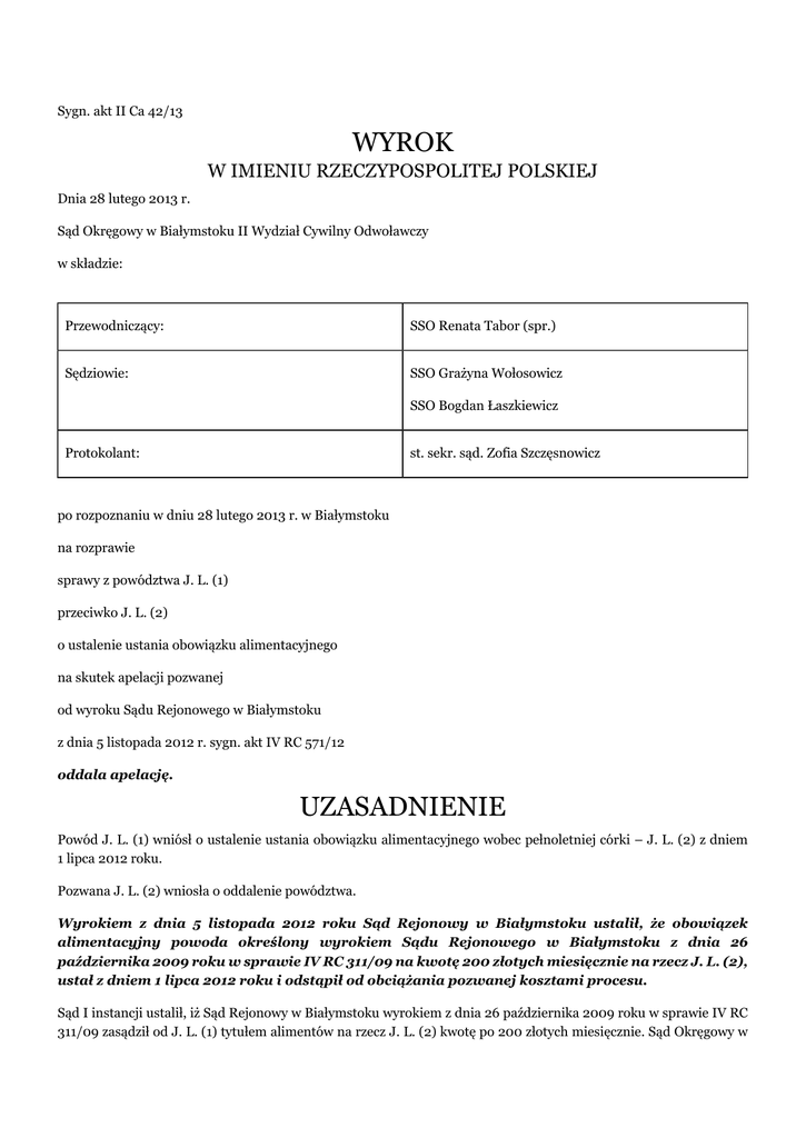 Sygn. akt II Ca 42/13 WYROK W IMIENIU RZECZYPOSPOLITEJ POLSKIEJ Dnia 28 lutego 2013 r. Sąd Okręgowy w Białymstoku II Wydział Cywilny Odwoławczy w składzie: Przewodniczący: SSO Renata Tabor (spr.) Sędziowie: SSO Grażyna Wołosowicz SSO Bogdan Łaszkiewicz Protokolant: st. sekr. sąd. Zofia Szczęsnowicz po rozpoznaniu w dniu 28 lutego 2013 r. w Białymstoku na rozprawie sprawy z powództwa J. L. (1) przeciwko J. L. (2) o ustalenie ustania obowiązku alimentacyjnego na skutek apelacji pozwanej od wyroku Sądu Rejonowego w Białymstoku z dnia 5 listopada 2012 r. sygn. akt IV RC 571/12 oddala apelację. UZASADNIENIE Powód J. L. (1) wniósł o ustalenie ustania obowiązku alimentacyjnego wobec pełnoletniej córki – J. L. (2) z dniem 1 lipca 2012 roku. Pozwana J. L. (2) wniosła o oddalenie powództwa. Wyrokiem z dnia 5 listopada 2012 roku Sąd Rejonowy w Białymstoku ustalił, że obowiązek alimentacyjny powoda określony wyrokiem Sądu Rejonowego w Białymstoku z dnia 26 października 2009 roku w sprawie IV RC 311/09 na kwotę 200 złotych miesięcznie na rzecz J. L. (2), ustał z dniem 1 lipca 2012 roku i odstąpił od obciążania pozwanej kosztami procesu. Sąd I instancji ustalił, iż Sąd Rejonowy w Białymstoku wyrokiem z dnia 26 października 2009 roku w sprawie IV RC 311/09 zasądził od J. L. (1) tytułem alimentów na rzecz J. L. (2) kwotę po 200 złotych miesięcznie. Sąd Okręgowy w Białymstoku wyrokiem z dnia 29 stycznia 2010 roku w sprawie II Ca 916/09 oddalając apelację powódki utrzymał to rozstrzygnięcie w mocy. Powód J. L. (1) ma 52 lata. Pracuje i osiąga z tego tytułu wynagrodzenie w kwocie 1240 złotych miesięcznie. Jest właścicielem działki zabudowanej o powierzchni 739 m2. Z osiąganego dochodu pokrywa koszty opału, mediów, wywozu śmieci, biletów komunikacji miejskiej, leków i wyżywienia. Podnosił, że jego córka J. skończyła naukę w Zespole Szkół (...) i ma wyuczony zawód. Wskazał też, że pozwana mieszka wraz z nim i korzysta z wyżywienia i mediów. Nadto twierdził, że córka może kontynuować naukę w szkole zaocznej pracując, gdyż zajęcia w tej szkole odbywają się co dwa tygodnie, a cały tydzień jego córka ma wolny. Sugerował też, że pozwana pracuje, chociaż w tym względzie nie podał bliższych informacji. Pozwana J. L. (2) ma 20 lat. W maju 2012 roku ukończyła naukę w technikum turystycznym. Ma wyuczony zawód technika obsługi ruchu turystycznego. Nie zdała matury, jak twierdziła, z powodu złej sytuacji w domu. Wskazała, że do szkoły zaocznej zapisała się po to, aby nie tracić roku. Jest to Zaoczna Policealna Szkoła (...) w B. – kierunek technik administracji. Podnosiła też, że nie widzi powodów, dlaczego nie miałaby kontynuować nauki. Wskazała, że zajęcia w nowej szkole odbywają się raz na dwa tygodnie w soboty i w niedziele. Z jednej strony tłumaczyła też, że pracodawcy poszukują pracowników ze zdanym egzaminem dojrzałości, z drugiej zaś, iż ma świadomość tego, że nowa szkoła nie da jej matury, ale da nowy zawód. Zadeklarowała też, że podejmie pracę jak ją znajdzie, ale na razie nie ma na to szans. Przyznała, że korzysta z domu ojca, bo w nim mieszka. Uznała, że powód winien dalej alimentować ją, bo do tej pory nic od niego nie dostała. Sąd Rejonowy po przeprowadzeniu postępowania dowodowego doszedł do wniosku, iż pozwana jest już na tyle przygotowana do wykonywania zawodu i pracy zarobkowej, że jest w stanie utrzymać się samodzielnie. Wprawdzie pozwana uczy się w zaocznej szkole policealnej nowego zawodu – technika administracji, lecz wybrana szkoła nie zapewni jej egzaminu dojrzałości, ponadto ukończenie nowej szkoły będzie skutkować uzyskaniem innego zawodu. Nauka w nowej szkole odbywa się w systemie zaocznym. Zjazdy mają miejsce raz na dwa tygodnie w soboty i w niedziele. Zatem biorąc pod uwagę fakt kontynuowania nauki tylko w weekendy oraz to, że pozwana dysponuje już wyuczonym zawodem technika obsługi ruchu turystycznego, Sąd I instancji uznał, że pozwana ma predyspozycje i możliwość podjęcia pracy. Ponadto mieszka z ojcem i korzysta z domu, mediów, a nawet i wyżywienia. Powód zaś nie osiąga wysokich dochodów i w większości przeznacza je na utrzymanie domu, z czego korzysta też pozwana. Sąd Rejonowy ustalił, iż obowiązek alimentacyjny ustał z dniem 1 lipca 2012 roku, gdyż powód twierdził, że w czerwcu 2012 roku pozwana zakończyła naukę w technikum turystycznym. Z tą datą skończył się czas zdobywania przygotowania zawodowego, a rozpoczął okres, w którym pozwana winna zdobytą wiedzę wykorzystać. Jako podstawę rozstrzygnięcia Sąd Rejonowy powołał art. 133 § 1 kro, zaś o kosztach procesu orzekł na mocy art.102 kpc. Powyższy wyrok zaskarżyła w całości apelacją pozwana zarzucając mu: I. naruszenie prawa materialnego, a w szczególności: 1) art. 138 k.r.o. poprzez jego niezastosowanie, polegające na zaniechaniu przez Sąd I instancji zbadania materialnej podstawy żądania pozwu, mianowicie, czy po stronie powoda, bądź powódki nastąpiła taka zmiana stosunków, która daje podstawę zmiany orzeczenia dotyczącego obowiązku alimentacyjnego, co w konsekwencji uniemożliwia merytoryczną, instancyjną kontrolę zaskarżonego wyroku, 2) art. 133 k.r.o. poprzez jego błędną wykładnię, polegającą na przyjęciu, iż J. L. (2) ma możliwość samodzielnego utrzymania się, w sytuacji, gdy kontynuuje ona naukę, planuje przystąpienie do matury w przyszłym roku, nie posiada wystarczającego wykształcenia oraz doświadczenia, aby podjąć pracę w dotychczas uzyskanym zawodzie, II. naruszenie przepisów postępowania, a w szczególności: 1) art. 233 k.p.c. poprzez błędną ocenę zgromadzonego w sprawie materiału dowodowego, w szczególności wyjaśnień stron (protokół rozprawy z dnia 5 listopada 2012 r.) - niewłaściwa ocena wymienionego dowodu przez Sąd p