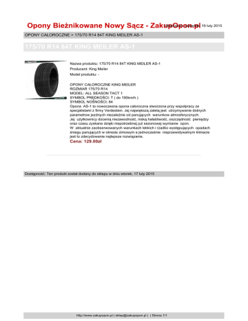 Utworzono: czwartek, 19 luty 2015 Opony Bieżnikowane Nowy Sącz - ZakupOpon.pl OPONY CAŁOROCZNE > 175/70 R14 84T KING MEILER AS-1 175/70 R14 84T KING MEILER AS-1 Nazwa produktu: 175/70 R14 84T KING MEILER AS-1 Producent: King Meiler Model produktu: OPONY CAŁOROCZNE KING MEILER ROZMIAR 175/70 R14 MODEL: ALL SEASON TACT 1 SYMBOL PRĘDKOŚCI: T ( do 190km/h ) SYMBOL NOŚNOŚCI: 84 Opona AS-1 to nowoczesna opona całoroczna stworzona przy wspołpracy ze specjalistami z firmy Verdestein. Jej największą zaletą jest utrzymywanie dobrych parametrow jezdnych niezależnie od panujących warunkow atmosferycznych. Jej użytkownicy docenią niezawodność, niską hałaśliwość, oszczędność pieniędzy oraz czasu zyskane dzięki niepotrzebnej już sezonowej wymianie opon. W aktualnie zaobserwowanych warunkach lekkich i rzadko występujących opadach śniegu panujących w okresie zimowym a jednocześnie nieprzewidywalnym klimacie jest to zdecydowanie najlepsze rozwiązanie. Cena: 129.00zł Dostępność: Ten produkt został dodany do sklepu w dniu wtorek, 17 luty 2015 http://www.zakupopon.pl | [email protected] | | Strona 1/1