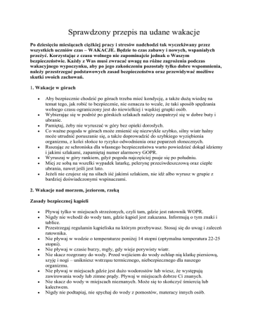 Sprawdzony przepis na udane wakacje Po dziesięciu miesiącach ciężkiej pracy i stresów nadchodzi tak wyczekiwany przez wszystkich uczniów czas – WAKACJE. Będzie to czas zabawy i nowych, wspaniałych przeżyć. Korzystając z czasu wolnego nie zapominajcie jednak o Waszym bezpieczeństwie. Każdy z Was musi zwracać uwagę na różne zagrożenia podczas wakacyjnego wypoczynku, aby po jego zakończeniu pozostały tylko dobre wspomnienia, należy przestrzegać podstawowych zasad bezpieczeństwa oraz przewidywać możliwe skutki swoich zachowań. 1. Wakacje w górach Aby bezpiecznie chodzić po górach trzeba mieć kondycję, a także dużą wiedzę na temat tego, jak robić to bezpiecznie, nie oznacza to wcale, że taki sposób spędzania wolnego czasu ograniczony jest do niewielkiej i wąskiej grupki osób. Wybierając się w podróż po górskich szlakach należy zaopatrzyć się w dobre buty i ubranie. Pamiętaj, żeby nie wyruszać w góry bez opieki dorosłych. Co ważne pogoda w górach może zmienić się niezwykle szybko, silny wiatr halny może utrudnić poruszanie się, a także doprowadzić do szybkiego wyziębienia organizmu, z kolei słońce to ryzyko odwodnienia oraz poparzeń słonecznych. Ruszając ze schroniska dla własnego bezpieczeństwa warto powiedzieć dokąd idziemy i jakimi szlakami, zapamiętaj numer alarmowy GOPR. Wyruszaj w góry rankiem, gdyż pogoda najczęściej psuje się po południu. Miej ze sobą na wszelki wypadek latarkę, pelerynę przeciwdeszczową oraz ciepłe ubrania, nawet jeśli jest lato. Jeżeli nie czujesz się na siłach iść jakimś szlakiem, nie idź albo wyrusz w grupie z bardziej doświadczonymi wspinaczami. 2. Wakacje nad morzem, jeziorem, rzeką Zasady bezpiecznej kąpieli Pływaj tylko w miejscach strzeżonych, czyli tam, gdzie jest ratownik WOPR. Nigdy nie wchodź do wody tam, gdzie kąpiel jest zakazana. Informują o tym znaki i tablice. Przestrzegaj regulamin kąpieliska na którym przebywasz. Stosuj się do uwag i zaleceń ratownika. Nie pływaj w wodzie o temperaturze poniżej 14 stopni (optymalna temperatura 22-25 stopni). Nie pływaj w czasie burzy, mgły, gdy wieje porywisty wiatr. Nie skacz rozgrzany do wody. Przed wejściem do wody ochlap nią klatkę piersiową, szyję i nogi – unikniesz wstrząsu termicznego, niebezpiecznego dla naszego organizmu. Nie pływaj w miejscach gdzie jest dużo wodorostów lub wiesz, że występują zawirowania wody lub zimne prądy. Pływaj w miejscach dobrze Ci znanych. Nie skacz do wody w miejscach nieznanych. Może się to skończyć śmiercią lub kalectwem. Nigdy nie podtapiaj, nie spychaj do wody z pomostów, materacy innych osób. Kąpiąc się na kąpieliskach zwracaj uwagę na osoby wokół. Ktoś może potrzebować Twojej pomocy. Jeżeli będziesz w stanie mu pomóc to uczyń to, ale w granicach swoich możliwości. Jeżeli nie będziesz się czuł na siłach to zawiadom inne osoby. Nie pływaj bezpośrednio po posiłku – zimna woda może doprowadzić do bolesnego skurczu żołądka, co może ponieść za sobą bardzo poważne konsekwencje. Po kąpieli nie jest wskazany duży wysiłek fizyczny. Nie przebywaj w wodzie zbyt długo ani też nie wchodź do niej po zbyt krótkiej przerwie. Intensywny wysiłek wzmaga łaknienie i dlatego po ukończeniu pływania należy zjeść posiłek. Dzieci powinny coś zjeść obowiązkowo. Nie wypływaj po zapadnięciu zmroku. Pływanie po zachodzie słońca jest niebezpieczne. Zasady bezpiecznego przebywania na słońcu Zachowaj umiar w przebywaniu na słońcu. Noś nakrycia głowy i okulary słoneczne (UWAGA! Noszenie ciemnych okularów bez filtra jest szkodliwe. Źrenica, do której dochodzi mniej światła, rozszerza się, dzięki czemu do wnętrza oka wnika więcej promieni UV). Unikaj wysiłku w pełnym słońcu. Chroń się w cieniu w godzinach południowych. Jeśli musisz przebywać na słońcu, stosuj filtry ochronne Pamiętaj o nawadnianiu organizmu – miej przy sobie coś do picia najlepiej wodę. .3. Aktywne wakacje Zasady bezpiecznej jazdy na rowerze Używaj sprawnego i w pełni wyposażonego roweru. Dokładnie rozejrzyj się zanim ruszysz. W miarę możliwości korzystaj z drogi dla rowerów. Przestrzegaj przepisów drogowych, obowiązują one także rowerzystów. Przed skrzyżowaniami, wyjazdami z podwórek i bocznych ulic trzymaj zawsze dłoń na hamulcu. Nie wymuszaj pierwszeństwa przejazdu. Sygnalizuj odpowiednio wcześnie wszystkie skręty. Nigdy nie ścinaj zakrętów. Na podwórku Podwórko to znakomite miejsce na zorganizowanie zabawy, ale powinno być położone z daleka od jezdni, ruin, wykopów. Bawiąc się na podwórku nie rozmawiaj z obcymi i nie pozwól, aby wypytywali się o mieszkanie i Twoich rodziców. Zwracaj uwagę na nieznajomych kręcących się w pobliżu mieszkania. Może to być włamywacz. Spróbuj zapamiętać wygląd obcego. W razie potrzeby zaalarmuj dorosłych. WAŻNE TELEFONY 112 – telefon alarmowy służb ratowniczych 997 – telefon alarmowy Policji 998 – telefon alarmowy Straży Pożarnej 999 – telefon alarmowy Pogotowia Ratunkowego 601 100 100 – telefon alarmowy WOPR Pamiętaj, że żadna zasada nie daje gwarancji na uniknięcie zagrożeń, ale z pewnością znacząco zmniejsza ryzyko.