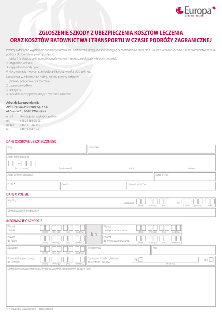 ZGŁOSZENIE SZKODY Z UBEZPIECZENIA KOSZTÓW LECZENIA ORAZ KOSZTÓW RATOWNICTWA I TRANSPORTU W CZASIE PODRÓŻY ZAGRANICZNEJ Prosimy o dokładne wypełnienie poniższego formularza i dostarczenie drogą korespondencyjną bezpośrednio na adres APRIL Polska Assistance Sp. z o.o. lub za pośrednictwem biura podróży. Do formularza prosimy dołączyć: 1. polisę (nie dotyczy osób ubezpieczonych w ramach imprez zakupionych w biurach podróży), 2. oryginalne rachunki, 3. oryginalne dowody opłat, 4. dokumentację medyczną zawierającą diagnozę lekarską i/lub epikryzę. Dodatkowo, w zależności od rodzaju szkody, prosimy dołączyć: 1. protokół policji z miejsca zdarzenia, 2. zeznania świadków, 3. akt zgonu, 4. inne dokumenty potwierdzające zgłaszane roszczenia. Adres do korespondencji: APRIL Polska Assistance Sp. z o.o. ul. Sienna 73, 00-833 Warszawa email: tel: mobile: fax: [email protected] +48 22 568-98-28 +48 519-116-345 +48 22 864-55-23 DANE OSOBOWE UBEZPIECZONEGO Imię: Nazwisko: Adres zameldowania: (kod pocztowy) (miejscowość) (ulica) (telefon) Adres do korespondencji: Adres e-mail PESEL:* Zawód: Imiona rodziców: DANE O POLISIE Nr polisy: ważna od do (dzień) (miesiąc) (rok) (dzień) (miesiąc) (rok) (godzina) (dzień) (miesiąc) (rok) (godzina) (dzień) (miesiąc) (rok) Ubezpieczający/Biuro podróży: INFORMACJE O SZKODZIE Wyjazd z Polski: Powrót do Polski: (dzień) (dzień) (miesiąc) (miesiąc) (rok) (rok) (godzina) (godzina) Zdarzenie: Powrót do miejsca zamieszkania: Miejscowość: (dzień) Przyjęcie Ubezpieczonego do leczenia: lub Wyjazd z miejsca zamieszkania: (dzień) (miesiąc) (miesiąc) (rok) (rok) (godzina) (godzina) Czy sprawa została zgłoszona do Centrum Pomocy? Szczegółowy opis zachorowania/wypadku, włącznie z charakterem obrażeń ciała: *) w przypadku cudzoziemców – data urodzenia Kraj: TAK NIE nr sprawy Nazwy i adresy placówek medycznych, w których Ubezpieczony leczył się przed zachorowaniem / wypadkiem: Nazwy i adresy placówek medycznych, w których Ubezpieczony leczył sie po zachorowaniu/wypadku: Dane lekarzy lub jednostek medycznych, w których poszkodowany leczył się przed wyjazdem. Jeżeli zdarzenie dotyczyło wypadku komunikacyjnego, prosimy podać nr rejestracyjny samochodu i komisariat policji, na który sprawa została zgłoszona: Jeżeli Ubezpieczony w chwili wypadku prowadził pojazd samochodowy, prosimy podać numer i kategorię prawa jazdy: Kto i gdzie udzielił Ubezpieczonemu pierwszej pomocy medycznej? Jeśli są świadkowie zdarzenia, to podać nazwiska i imiona oraz ich adresy: Wielkość szkody: Data rachunku Kwota w lokalnej walucie Czy spodziewa się Pan/Pani innych rachunków? 24. Czy posiada Pan/Pani inną polisę obejmującą ochroną ubezpieczeniową to zdarzenie? Jeśli tak, to prosimy podać: nazwę zakładu ubezpieczeń Czego dotyczy rachunek TAK NIE TAK NIE nr polisy Kto opłacił rachunek OŚWIADCZENIE 1. Oświadczam, że powyższe informacje zostały przeze mnie udzielone zgodnie z prawdą i według najlepszej wiedzy. 2. Zwalniam lekarzy leczących mnie z dochowania tajemnicy lekarskiej i wyrażam zgodę na udostępnienie lekarzom TU Europa S.A. dokumentacji medycznej dotyczącej mojej osoby. 3. Zwalniam publiczne i niepubliczne zakłady opieki zdrowotnej oraz Zakład Ubezpieczeń Społecznych z obowiązku dochowania tajemnicy lekarskiej i wyrażam zgodę na udostępnienie lekarzom TU Europa S.A. dokumentacji medycznej dotyczącej mojej osoby. 4. Wyrażam zgodę na przetwarzanie danych osobowych przez Towarzystwo Ubezpieczeń Europa S.A. z siedzibą we Wrocławiu przy ul. Gwiaździstej 62 w celu obsługi ubezpieczenia w każdy sposób niezbędny dla realizacji tego celu. Ponadto, zgadzam się także na to, aby TU Europa S.A. przekazało dane firmie reasekuracyjnej, w tym za granicę, jeżeli będzie to wymagane w związku z warunkami reasekuracji ryzyk ubezpieczeniowych. 5. Przyjmuję do wiadomości fakt, że Towarzystwo Ubezpieczeń Europa S.A. z siedzibą we Wrocławiu przy ul. Gwiaździstej 62 jest administratorem moich danych osobowych oraz, i przysługuje mi prawo dostępu do treści swoich danych osobowych będących w posiadaniu TU Europa S.A. i prawo ich poprawiania oraz fakt, że przetwarzanie danych w celach innych niezwiązane z ubezpieczeniem wymaga uzyskania uprzedniej pisemnej zgody. Oświadczam, że wyrażam zgodę na : otrzymywanie korespondencji w formie elektronicznej na podany w zgłoszeniu adres e-mail; FORMA WYPŁATY ODSZKODOWANIA Należne odszkodowanie należy przekazać na złotowe konto bankowe nr: Nazwa i nr oddziału banku: Nazwisko i imię właściciela konta bankowego: *Data i podpis Ubezpieczającego / pracownika biura podróży Data i podpis Ubezpieczonego *) Jeśli wyjazd odbywa się na imprezę organizowaną przez biuro podróży lub innego organizatora i jego przedstawiciel może potwierdzić zaistniałe okoliczności zdarzenia.