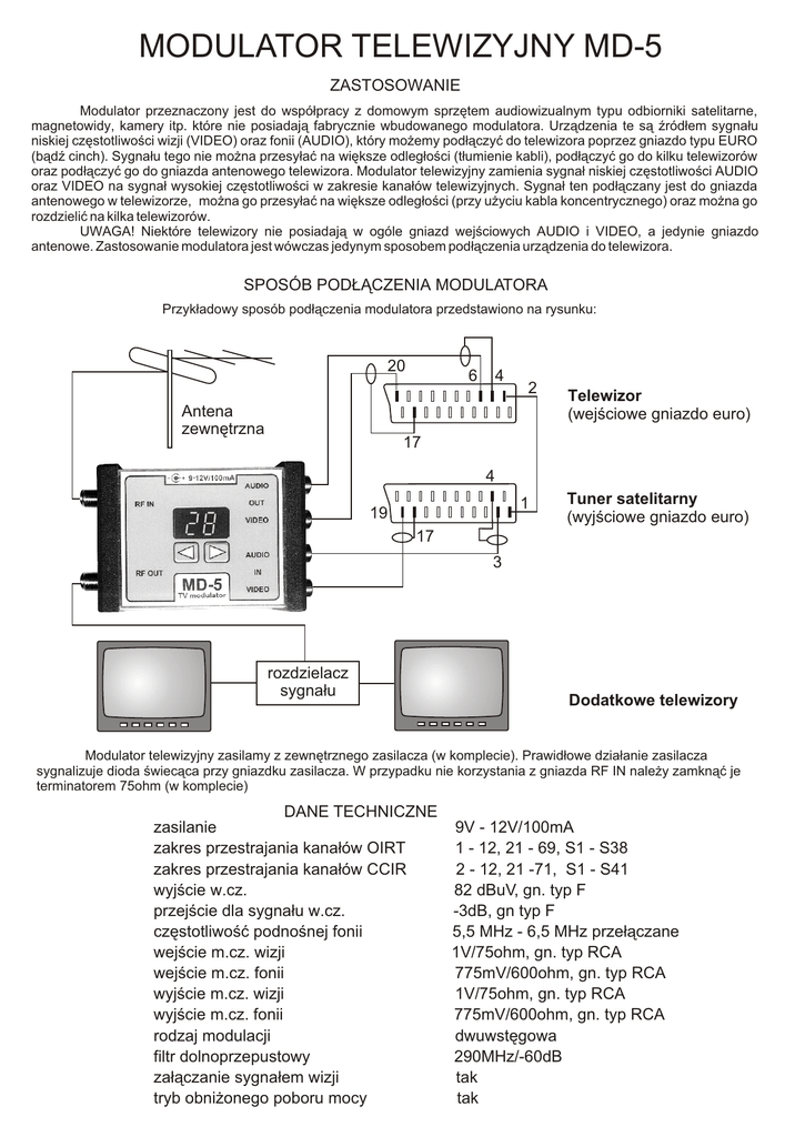 MODULATOR TELEWIZYJNY MD-5 ZASTOSOWANIE Modulator przeznaczony jest do wspó³pracy z domowym sprzêtem audiowizualnym typu odbiorniki satelitarne, magnetowidy, kamery itp. które nie posiadaj¹ fabrycznie wbudowanego modulatora. Urz¹dzenia te s¹ Ÿród³em sygna³u niskiej czêstotliwoœci wizji (VIDEO) oraz fonii (AUDIO), który mo¿emy pod³¹czyæ do telewizora poprzez gniazdo typu EURO (b¹dŸ cinch). Sygna³u tego nie mo¿na przesy³aæ na wiêksze odleg³oœci (t³umienie kabli), pod³¹czyæ go do kilku telewizorów oraz pod³¹czyæ go do gniazda antenowego telewizora. Modulator telewizyjny zamienia sygna³ niskiej czêstotliwoœci AUDIO oraz VIDEO na sygna³ wysokiej czêstotliwoœci w zakresie kana³ów telewizyjnych. Sygna³ ten pod³¹czany jest do gniazda antenowego w telewizorze, mo¿na go przesy³aæ na wiêksze odleg³oœci (przy u¿yciu kabla koncentrycznego) oraz mo¿na go rozdzieliæ na kilka telewizorów. UWAGA! Niektóre telewizory nie posiadaj¹ w ogóle gniazd wejœciowych AUDIO i VIDEO, a jedynie gniazdo antenowe. Zastosowanie modulatora jest wówczas jedynym sposobem pod³¹czenia urz¹dzenia do telewizora. SPOSÓB POD£¥CZENIA MODULATORA Przyk³adowy sposób pod³¹czenia modulatora przedstawiono na rysunku: 20 Antena zewnêtrzna 6 4 2 Telewizor (wejœciowe gniazdo euro) 17 4 1 19 Tuner satelitarny (wyjœciowe gniazdo euro) 17 3 rozdzielacz sygna³u Dodatkowe telewizory Modulator telewizyjny zasilamy z zewnêtrznego zasilacza (w komplecie). Prawid³owe dzia³anie zasilacza sygnalizuje dioda œwiec¹ca przy gniazdku zasilacza. W przypadku nie korzystania z gniazda RF IN nale¿y zamkn¹æ je terminatorem 75ohm (w komplecie) DANE TECHNICZNE zasilanie 9V - 12V/100mA zakres przestrajania kana³ów OIRT 1 - 12, 21 - 69, S1 - S38 zakres przestrajania kana³ów CCIR 2 - 12, 21 -71, S1 - S41 wyjœcie w.cz. 82 dBuV, gn. typ F przejœcie dla sygna³u w.cz. -3dB, gn typ F czêstotliwoœæ podnoœnej fonii 5,5 MHz - 6,5 MHz prze³¹czane wejœcie m.cz. wizji 1V/75ohm, gn. typ RCA wejœcie m.cz. fonii 775mV/600ohm, gn. typ RCA wyjœcie m.cz. wizji 1V/75ohm, gn. typ RCA wyjœcie m.cz. fonii 775mV/600ohm, gn. typ RCA rodzaj modulacji dwuwstêgowa filtr dolnoprzepustowy 290MHz/-60dB za³¹czanie sygna³em wizji tak tryb obni¿onego poboru mocy tak TRYBY PRACY MODULATORA TRYB NORMALNY Po pod³¹czeniu zasilania do modulatora na wyœwietlaczu pojawia siê numer kana³u telewizyjnego na którym pracuje modulator. Numer kana³u mo¿na zmieniaæ przyciskami < > . Numer ten zostaje zapamiêtany i nie zmienia siê je¿eli nast¹pi chwilowy brak zasilania. W przypadku zaniku sygna³u wizyjnego do modulatora wyœwietlacz bêdzie pulsowa³ i nast¹pi wy³¹czenie modulatora i zanik sygna³u na telewizorze. Pojawienie siê sygna³u wizyjnego ponownie za³¹czy modulator. ZMIANA SYSTEMU KANA£ÓW TELEWIZYJNYCH Modulator mo¿e pracowaæ w rastrze kana³ów telewizyjnych zgodnych z systemem OIRT (Polska), albo CCIR. W celu wybrania systemu nale¿y trzymaj¹c wciœniête przyciski < oraz > w³¹czyæ zasilanie. Wyœwietlacz poka¿e aktualny system "oi" (OIRT) albo "cc" (CCIR). Pos³uguj¹c siê przyciskami < > mo¿na wybraæ system, a nastêpnie wy³¹czyæ zasilanie modulatora. ZMIANA CZÊSTOTLIWOŒCI NOŒNEJ FONII Trzymaj¹c wciœniêty przycisk > w³¹czyæ zasilanie modulatora. Wyœwietlacz poka¿e wówczas czêstotliwoœæ noœn¹ fonii. Mo¿na wybraæ 5,5 MHz lub 6,5 MHz. SYGNA£ TESTU Trzymaj¹c wciœniêty przycisk < w³¹czyæ zasilanie modulatora. W trybie tym modulator generuje na ekranie telewizora obraz kontrolny bia³o-czarnych pasów pionowych oraz sygna³ akustyczny 1kHz. Na wyœwietlaczu pokazuje siê numer kana³u telewizyjnego na którym pracuje modulator. Numer kana³ mo¿na zmieniaæ przyciskami < > . Numer ten zostaje zapamiêtany po przejœciu do normalnego trybu pracy. OSZCZÊDNOŒÆ ENERGII Dotyczy tylko normalnego trybu pracy. Je¿eli przez czas ok. 1 min. nie naciskamy ¿adnego przycisku to modulator przechodzi w stan obni¿onego poboru mocy, wyœwietlacz jest wówczas wygaszony. Wyjœcie z tego trybu nastêpuje przez naciœniêcie dowolnego przycisku. WY£¥CZANIE NOŒNEJ Je¿eli zanika sygna³ wizji na wejœciu VIDEO modulatora to modulator przestaje generowaæ sygna³ telewizyjny (zanika obraz na telewizorze). Jest to sygnalizowane pulsowaniem wyœwietlacza w normalnym trybie pracy. W trybie oszczêdnoœci energii (wygaszony wyœwietlacz) nie jest to sygnalizowane. FILTR DOLNOPRZEPUSTOWY Podczas pracy na kana³ach o niskich czêstotliwoœciach (1-12, oraz poni¿ej S17) automatycznie za³¹cza siê filtr dolnoprzepustowy, który zapobiega przedostawaniu siê wy¿szych harmonicznych sygna³u u¿ytecznego na wyjœcie modulatora i chroni kana³y o wy¿szych czêstotliwoœciach (21-60, oraz powy¿ej S17) przed zak³óceniami. KARTA GWARANCYJNA Nr seryjny / data produkcji ........................................................ Data sprzeda¿y ........................................................ Podpis i pieczêæ sprzedawcy ........................................................ SAT-SERWIS s.c. Z.P.H.U. 91-403 £ÓD•, ul. Tamka 16 www.satserwis.pl WARUNKI GWARANCJI 1. Producent zobowi¹zuje siê do bezp³atnego usuwania wad i uszkodzeñ ujawnionych w okresie gwarancji tj. 12 miesiêcy od daty zakupu jednak nie d³u¿ej ni¿ 24 miesi¹ce od daty produkcji 2. Okres oczekiwania na naprawê nie mo¿e byæ ni¿ 14 dni roboczych od daty dostarczenia urz¹dzenia do naprawy 3 Warunkiem przyjêcia sprzêtu do naprawy jest dostarczenie przez klienta: - czytelnie i poprawnie wype³nionej karty gwarancyjnej - reklamowanego wyrobu - szczegó³owego opisu przyczyny oddania do naprawy 4. Gwarancja nie obejmuje: -uszkodzeñ powsta³ych z przyczyn zewnêtrznych, takich jak: zjawiska atmosferyczne, zanieczyszczenia, uszkodzenia mechaniczne, termiczne lub chemiczne, niew³aœciwe zasilanie oraz instalacjê i eksploatacjê niezgodn¹ z oryginaln¹ instrukcj¹ obs³ugi urz¹dzen