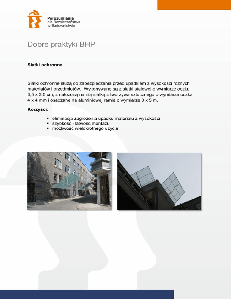 Dobre praktyki BHP Siatki ochronne Siatki ochronne służą do zabezpieczenia przed upadkiem z wysokości różnych materiałów i przedmiotów.. Wykonywane są z siatki stalowej o wymiarze oczka 3,5 x 3,5 cm, z nałożoną na nią siatką z tworzywa sztucznego o wymiarze oczka 4 x 4 mm i osadzane na aluminiowej ramie o wymiarze 3 x 5 m. Korzyści: eliminacja zagrożenia upadku materiału z wysokości szybkość i łatwość montażu możliwość wielokrotnego użycia