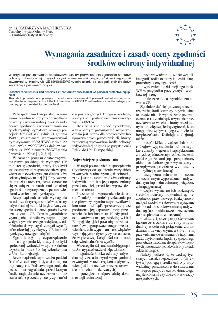 BEZPIECZEŃSTWO PRACY 3/2004 dr inż. KATARZYNA MAJCHRZYCKA Centralny Instytut Ochrony Pracy – Państwowy Instytut Badawczy Wymagania zasadnicze i zasady oceny zgodności środków ochrony indywidualnej W artykule przedstawiono podstawowe zasady potwierdzania zgodności środków ochrony indywidualnej z zasadniczymi wymaganiami bezpieczeństwa i ergonomii zawartymi w dyrektywie UE 89/686/EWG w odniesieniu do kategorii tych środków związanej z poziomem ryzyka. Essential requirements and principles of conformity assessment of personal protective equipment This article presents basic principles of conformity assessment of personal protective equipment with the basic requirements of the EU Directive 89/686/EEC with reference to the category of that equipment related to the risk level. W krajach Unii Europejskiej wymagania zasadnicze dotyczące środków ochrony indywidualnej oraz zasady oceny zgodności i wprowadzania na rynek reguluje dyrektywa nowego podejścia 89/686/EWG z dnia 21 grudnia 1989 r., ze zmianami wprowadzonymi dyrektywami: 93/68/EWG z dnia 22 lipca 1993 r., 95/93/EWG z dnia 29 października 1993 r. oraz 96/58/WE z dnia 3 września 1996 r. [1, 2, 3, 4]. W ramach procesu dostosowywania prawa polskiego do wymagań UE minister gospodarki, pracy i polityki społecznej wydał rozporządzenie w sprawie zasadniczych wymagań dla środków ochrony indywidualnej [5]. Przy tworzeniu projektu rozporządzenia kierowano się zasadą zachowania maksymalnej zgodności merytorycznej z postanowieniami wymienionej. dyrektywy. Rozporządzenie określa wymagania zasadnicze dotyczące środków ochrony indywidualnej, warunki i tryb dokonywania oceny zgodności oraz sposób i wzór oznakowania CE. Termin „zasadnicze wymagania” określa wymagania ujęte w dyrektywach nowego podejścia, w odróżnieniu od „wymagań szczegółowych”, które określają dyrektywy UE inne niż dyrektywy nowego podejścia. Zgodnie z § 44, rozporządzenie ministra gospodarki, pracy i polityki społecznej wchodzi w życie z dniem uzyskania przez Polskę członkostwa w Unii Europejskiej. Rozporządzenie wprowadza podział środków ochrony indywidualnej na trzy kategorie. Podstawą tego podziału jest stopień zagrożenia, przed którym środki mają chronić użytkownika oraz ustala różne procedury oceny zgodności dla poszczególnych kategorii środków, identyczne z postanowieniami dyrektywy 68/686/EWG. Dokładna znajomość dyrektywy, a tym samym postanowień rozporządzenia jest istotna dla producentów lub upoważnionych przedstawicieli, którzy zamierzają wprowadzać środki ochrony indywidualnej na rynek po przystąpieniu Polski do Unii Europejskiej. Najważniejsze postanowienia W myśl postanowień rozporządzenia (dyrektywy) do spełnienia wszystkich zawartych w nim wymagań zobowiązany jest producent środków ochrony indywidualnej lub jego upoważniony przedstawiciel, przed ich wprowadzeniem do obrotu. Przez termin „wprowadzenie do obrotu” należy rozumieć przekazanie po raz pierwszy wyrobu użytkownikowi, konsumentowi bądź sprzedawcy przez producenta, jego upoważnionego przedstawiciela lub importera. Każdy producent, zarówno mający siedzibę w Unii Europejskiej, jak i poza nią, może ustanowić swojego upoważnionego przedstawiciela w celu wypełniania obowiązków wynikających z dyrektywy, co oznacza, że w pierwszej kolejności on ponosi, odpowiedzialność za wyrób. W szczególności producent lub jego upoważniony przedstawiciel odpowiada za: – zgodność środka ochrony indywidualnej z zasadniczymi wymaganiami zawartymi w rozporządzeniu (dyrektywie), (jeśli to możliwe przez zastosowanie norm zharmonizowanych) – sporządzenie odpowiedniej dokumentacji technicznej – przeprowadzenie, właściwej dla kategorii środka ochrony indywidualnej, procedury oceny zgodności – wystawienie deklaracji zgodności WE w przypadku pozytywnych wyników tej oceny – umieszczenie na wyrobie oznakowania CE. Zgodnie z definicją zawartą w rozporządzeniu, środki ochrony indywidualnej to urządzenia lub wyposażenie przeznaczone do noszenia bądź trzymania przez użytkownika w celu ochrony przed jednym lub większą liczbą zagrożeń, które mogą mieć wpływ na jego zdrowie lub bezpieczeństwo. Definicja ta obejmuje także: – zespół kilku urządzeń lub kilku rodzajów wyposażenia ochronnego, które zostały połączone i zaprojektowane z myślą o jednoczesnym zabezpieczeniu przed zagrożeniami (np. sprzęt ochrony układu oddechowego z wymuszonym przepływem powietrza wyposażony w przyłbicę spawalniczą) – urządzenia ochronne połączone z nieochronnym wyposażeniem indywidualnym (np. hełm ochronny połączony z lampą górniczą) – części wymienne lub podzespoły środków ochrony indywidualnej, niezbędne do prawidłowego funkcjonowania tych środków i stosowane wyłącznie jako składniki środków ochrony indywidualnej (np. pochłaniacze przeznaczone do kompletowania z maskami) – układy (podzespoły) stosowane łącznie ze środkami ochrony indywidualnej w celu ich połączenia z urządzeniami zewnętrznymi, a które nie są przewidziane do noszenia lub trzymania przez użytkownika (np. filtry sprężonego powietrza stosowane do aparatów wężowych przeznaczonych do ochrony układu oddechowego). Należy podkreślić, że według tych samych zasad, rozporządzeniu (dyrektywie) podlegają środki ochrony indywidualnej przeznaczone do stosowania w miejscu pracy, do użytku domowego, majsterkowania czy do celów rekreacyjno-sportowych. 25 BEZPIECZEŃSTWO PRACY 3/2004 Fot. 1. Przyk³ad zastosowania środków ochrony indywidualnej III kategorii Mając na uwadze przedstawioną definicję środków ochrony indywidualnej, w rozporządzeniu jednoznacznie określono grupy wyrobów, do których nie stosuje się postanowień tego rozporządzenia. Są to środki ochrony indywidualnej: – objęte innymi dyrektywami nowego podejścia (np. dyrektywą 96/98/EWG w sprawie