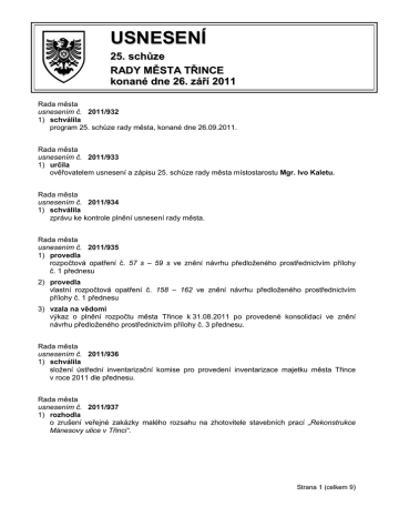 USNESENÍ 25. schůze RADY MĚSTA TŘINCE konané dne 26. září 2011 Rada města usnesením č. 2011/932 1) schválila program 25. schůze rady města, konané dne 26.09.2011. Rada města usnesením č. 2011/933 1) určila ověřovatelem usnesení a zápisu 25. schůze rady města místostarostu Mgr. Ivo Kaletu. Rada města usnesením č. 2011/934 1) schválila zprávu ke kontrole plnění usnesení rady města. Rada města usnesením č. 2011/935 1) provedla rozpočtová opatření č. 57 s – 59 s ve znění návrhu předloženého prostřednictvím přílohy č. 1 přednesu 2) provedla vlastní rozpočtová opatření č. 158 – 162 ve znění návrhu předloženého prostřednictvím přílohy č. 1 přednesu 3) vzala na vědomí výkaz o plnění rozpočtu města Třince k 31.08.2011 po provedené konsolidaci ve znění návrhu předloženého prostřednictvím přílohy č. 3 přednesu. Rada města usnesením č. 2011/936 1) schválila složení ústřední inventarizační komise pro provedení inventarizace majetku města Třince v roce 2011 dle přednesu. Rada města usnesením č. 2011/937 1) rozhodla o zrušení veřejné zakázky malého rozsahu na zhotovitele stavebních prací „Rekonstrukce Mánesovy ulice v Třinci“. Strana 1 (celkem 9) Rada města usnesením č. 2011/938 1) schválila zmařené investice města č. 1 přednesu ve znění návrhu předloženého prostřednictvím přílohy 2) schválila odpis výše uvedených zmařených investic z účtu 042 - nedokončený dlouhodobý majetek. Rada města usnesením č. 2011/939 1) schválila organizaci Dům dětí a mládeže Třinec, příspěvková organizace, se sídlem v Třinci, ulice Bezručova, č. p. 66, PSČ 739 61, IČ 750 89 424, předložení žádosti o finanční příspěvek z programu Prazdroj lidem pro Moravskoslezský region pro rok 2012 na projekt „Tudy z nudy“. Rada města usnesením č. 2011/940 1) schválila navýšení nejvyššího povoleného počtu žáků ve školní družině, jejíž činnost vykonává právnická osoba Základní škola Třinec, Slezská 773, příspěvková organizace, se sídlem v Třinci, ul. Slezská, č. p. 773, PSČ 739 61, IČ 008 47 119, a to do 179 žáků. Rada města usnesením č. 2011/941 1) rozhodla a) zřídit věcné břemeno ve prospěch města Třince spočívající v právu zřízení a provozování veřejného osvětlení na pozemku parc. č. 1339/2 v k. ú. Lyžbice a obci Třinec, ve vlastnictví paní J. W., bytem Třinec, v rámci stavby „Silnice I/11 Oldřichovice-Bystřice“ jako její stavební objekt označený v projektové dokumentaci „SO 441 – přeložka venkovního vedení VO v km 11,300 – 11,400“ v rozsahu vymezeném v GP č. 1851242302/2010 ze dne 18.01.2011. Právo odpovídající věcnému břemeni se zřizuje za jednorázovou finanční náhradu ve výši 10 000 Kč dle znaleckého posudku č. 2011/VB/Ly-004/S.I-11/IN ze dne 10.02.2011, zpracovaného Ing. Pavlem Krämerem, kterou investor stavby, tj. Ředitelství silnic a dálnic ČR, zastoupené společností INKOSOSTRAVA, a. s., se sídlem Ostrava-Moravská Ostrava, Havlíčkovo nábřeží 696/22, PSČ 701 52, IČ 483 94 637, uhradí paní J. W. b) uzavřít smlouvu o zřízení věcného břemena č. 2011/05/455/Př ve znění návrhu předloženého prostřednictvím přílohy č. 2 přednesu. Rada města usnesením č. 2011/942 1) rozhodla a) zřídit věcné břemeno ve prospěch společnosti ČEZ Distribuce, a. s., se sídlem Děčín, Děčín IV-Podmokly, Teplická 874/8, PSČ 405 02, IČ 247 29 035, spočívající v právu zřízení a provozování zemního kabelového vedení nízkého napětí na části pozemku parc. č. 1442 v k. ú. Lyžbice a obci Třinec, ve vlastnictví města Třince, za jednorázovou finanční úhradu dle „Ceníku“ ve výši 60 Kč/m², min. 600 Kč včetně DPH b) uzavřít smlouvu o zřízení věcného břemena č. 2011/05/454/Sk ve znění návrhu předloženého prostřednictvím přílohy č. 2 přednesu Strana 2 (celkem 9) 2) rozhodla a) zřídit věcné břemeno ve prospěch společnosti ČEZ Distribuce, a. s., se sídlem Děčín, Děčín IV-Podmokly, Teplická 874/8, PSČ 405 02, IČ 247 29 035, spočívající v právu zřízení a provozování zemního kabelového vedení nízkého napětí na části pozemku parc. č. 1338/3 v k. ú. Lyžbice a obci Třinec, ve vlastnictví města Třince, za jednorázovou finanční úhradu dle „Ceníku“ ve výši 60 Kč/m², min. 600 Kč včetně DPH b) uzavřít smlouvu o zřízení věcného břemena č. 2011/05/453/Sk ve znění návrhu předloženého prostřednictvím přílohy č. 2 přednesu 3) rozhodla a) zřídit věcné břemeno ve prospěch manželů J. J. a E. J., bytem Třinec, a pana R. J., bytem Třinec, spočívající v právu uložení a provozování stavby kanalizace na části pozemku parc. č. 1442 v k. ú. Lyžbice a obci Třinec, ve vlastnictví města Třince, za jednorázovou finanční úhradu dle „Ceníku“ ve výši 24 Kč/m², min. 360 Kč včetně DPH b) uzavřít smlouvu o zřízení věcného břemena č. 2011/05/246/Sk ve znění návrhu předloženého prostřednictvím přílohy č. 2 přednesu 4) rozhodla a) zřídit věcné břemeno ve prospěch společnosti ČEZ Distribuce, a. s., se sídlem Děčín, Děčín IV-Podmokly, Teplická 874/8, PSČ 405 02, IČ 247 29 035, spočívající v právu zřízení a provozování zemního kabelového vedení nízkého napětí na části pozemku parc. č. 2353 v k. ú. Horní Líštná a obci Třinec, ve vlastnictví města Třince, za jednorázovou finanční úhradu dle „Ceníku“ ve výši 60 Kč/m², min. 600 Kč včetně DPH b) uzavřít smlouvu o zřízení věcného břemena č. 2011/05/456/Sk ve znění návrhu předloženého prostřednictvím přílohy č. 2 přednesu. Rada města usnesením č. 2011/943 1) rozhodla a) zřídit věcné břemeno ve prospěch společnost
