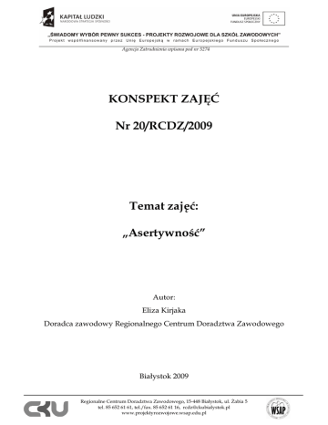 Agencja Zatrudnienia wpisana pod nr 5274 KONSPEKT ZAJĘĆ Nr 20/RCDZ/2009 Temat zajęć: „Asertywność” Autor: Eliza Kirjaka Doradca zawodowy Regionalnego Centrum Doradztwa Zawodowego Białystok 2009 Regionalne Centrum Doradztwa Zawodowego, 15-448 Białystok, ul. śabia 5 tel. 85 652 61 61, tel./fax. 85 652 61 16, [email protected] www.projektyrozwojowe.wsap.edu.pl Agencja Zatrudnienia wpisana pod nr 5274 Cele zajęć: 1. Przekazanie istoty zachowania asertywnego, agresywnego i uległego. 2. Uświadomienie znaczenie trzech typów zachowań dla procesu komunikacji interpersonalnej. 3. Przekazanie wiedzy dotyczącej strategii komunikacji asertywnej. Korzyści (efekty zajęć): W wyniku zajęć uczestnicy: 1. rozumieją znaczenie słowa: asertywność, 2. wyjaśniają pojęcia: zachowanie uległe (pasywne), agresywne, asertywne, 3. potrafią wymienić przejawy kaŜdego z tego typu zachowań, 4. dostrzegają róŜnicę pomiędzy zachowaniem asertywnym a zachowaniem agresywnym i uległym (pasywnym), 5. omawiają podstawowe techniki komunikacji asertywnej: zacięta płyta, z treści na proces, chwila na oddech, odkładania na później, 6. potrafią rozróŜnić powyŜsze techniki w sytuacjach codziennych, 7. doskonalą umiejętność otwartego, stanowczego i równocześnie uprzejmego wyraŜania własnych myśli, poglądów i Ŝyczeń, egzekwowania swoich praw oraz podejmowania decyzji. Metody pracy: Zajęcia prowadzone będą metodami aktywizującymi uczestników, z wykorzystaniem róŜnorodnych form i metod. W większości zajęcia składać się będą z pracy w grupach, pracy indywidualnej, dyskusji kierowanej, burzy mózgów z nastawieniem na aktywność uczestników podczas ćwiczeń. Ponadto kaŜdy z uczestników będzie miał szansę zaprezentować swoje zdanie na forum grupy. Sposób prowadzenia zajęć zakłada maksymalny i aktywny udział wszystkich uczestników, przy zminimalizowaniu tradycyjnych sposobów przekazywania wiedzy. Materiały: Podczas zajęć wykorzystuje się karty pracy oraz autorskie scenariusze przygotowane przez doradców zawodowych na podstawie podręczników dla doradców zawodowych. Ponadto Regionalne Centrum Doradztwa Zawodowego, 15-448 Białystok, ul. śabia 5 tel. 85 652 61 61, tel./fax. 85 652 61 16, [email protected] www.projektyrozwojowe.wsap.edu.pl Agencja Zatrudnienia wpisana pod nr 5274 moŜe być wykorzystany laptop, projektor multimedialny oraz filmy szkoleniowe. W trakcie zajęć z młodzieŜą w dyspozycji będą takŜe inne pomoce typu: tablica lub flipchart, papier do flipchartu lub duŜe arkusze papieru, przypory do pisania itp. Czas trwania zajęć: 90 minut Zagadnienia: 1. Asertywność – umiejętność otwartego wyraŜania własnego zdania. 2. Rodzaje zachowań w sytuacji konfliktu. 3. Asertywność w Ŝyciu codziennym. Literatura: 1. Albert R., Emmons M., Asertywność, Gdańskie Wydawnictwo Psychologiczne, Gdańsk 2005 2. Davidson J., Asertywność dla śółtodziobów czyli wszystko, co powinieneś wiedzieć o…, Dom Wydawniczy REBIS, Poznań 2003 3. Liwosz E., Pankiewicz K., Staroń A., Kostecka A., Klub Pracy. Program szkolenia, Wydanie II, Ministerstwo Gospodarki Pracy i Polityki Społecznej, Warszawa 2003 4. Zaplanuj swoją przyszłość. Zestaw scenariuszy lekcji z zakresu planowania kariery zawodowej. Instytut Rozwoju Kariery, Warszawa 2004 Regionalne Centrum Doradztwa Zawodowego, 15-448 Białystok, ul. śabia 5 tel. 85 652 61 61, tel./fax. 85 652 61 16, [email protected] www.projektyrozwojowe.wsap.edu.pl