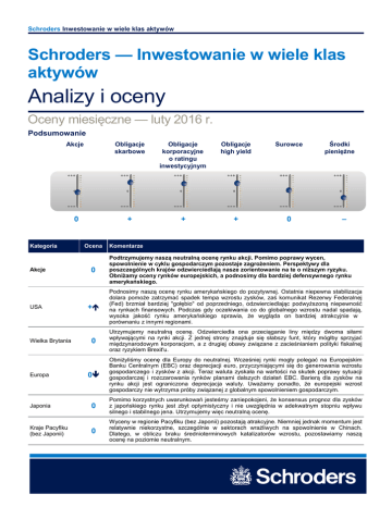 Schroders Inwestowanie w wiele klas aktywów Schroders — Inwestowanie w wiele klas aktywów Analizy i oceny Oceny miesięczne — luty 2016 r. Podsumowanie Akcje Obligacje skarbowe Obligacje korporacyjne o ratingu inwestycyjnym Obligacje high yield Surowce 0 + + + 0 Kategoria Akcje Ocena 0 Środki pieniężne – Komentarze Podtrzymujemy naszą neutralną ocenę rynku akcji. Pomimo poprawy wycen, spowolnienie w cyklu gospodarczym pozostaje zagrożeniem. Perspektywy dla poszczególnych krajów odzwierciedlają nasze zorientowanie na te o niższym ryzyku. Obniżamy oceny rynków europejskich, a podnosimy dla bardziej defensywnego rynku amerykańskiego. + Podnosimy naszą ocenę rynku amerykańskiego do pozytywnej. Ostatnia niepewna stabilizacja dolara pomoże zatrzymać spadek tempa wzrostu zysków, zaś komunikat Rezerwy Federalnej (Fed) brzmiał bardziej "gołębio" od poprzedniego, odzwierciedlając podwyższoną niepewność na rynkach finansowych. Podczas gdy oczekiwania co do globalnego wzrostu nadal spadają, wysoka jakość rynku amerykańskiego sprawia, że wygląda on bardziej atrakcyjnie w porównaniu z innymi regionami. 0 Utrzymujemy neutralną ocenę. Odzwierciedla ona przeciąganie liny między dwoma siłami wpływającymi na rynki akcji. Z jednej strony znajduje się słabszy funt, który mógłby sprzyjać międzynarodowym korporacjom, a z drugiej obawy związane z zacieśnianiem polityki fiskalnej oraz ryzykiem Brexit'u. Europa 0 Obniżyliśmy ocenę dla Europy do neutralnej. Wcześniej rynki mogły polegać na Europejskim Banku Centralnym (EBC) oraz deprecjacji euro, przyczyniającymi się do generowania wzrostu gospodarczego i zysków z akcji. Teraz waluta zyskała na wartości na skutek poprawy sytuacji gospodarczej i rozczarowania rynków planami dalszych działań EBC. Barierą dla zysków na rynku akcji jest ograniczona deprecjacja waluty. Uważamy ponadto, że europejski wzrost gospodarczy nie wytrzyma próby związanej z globalnym spowolnieniem gospodarczym. Japonia 0 Pomimo korzystnych uwarunkowań jesteśmy zaniepokojeni, że konsensus prognoz dla zysków z japońskiego rynku jest zbyt optymistyczny i nie uwzględnia w adekwatnym stopniu wpływu silnego i stabilnego jena. Utrzymujemy więc neutralną ocenę. 0 Wyceny w regionie Pacyfiku (bez Japonii) pozostają atrakcyjne. Niemniej jednak momentum jest relatywnie niekorzystne, szczególnie w sektorach wrażliwych na spowolnienie w Chinach. Dlatego, w obliczu braku średnioterminowych katalizatorów wzrostu, pozostawiamy naszą ocenę na poziomie neutralnym. USA Wielka Brytania Kraje Pacyfiku (bez Japonii) Schroders Inwestowanie w wiele klas aktywów Rynki wschodzące Kategoria – Ocena Nasza ocena rynków wschodzących pozostaje negatywna. Wyceny wyglądają atrakcyjnie. Jednak jakkolwiek wiele z negatywnych informacji znalazło już swoje odzwierciedlenie w cenach, nie jesteśmy przekonani, że spowolnienie cyklu, zwiększona niepewność wokół perspektyw dla chińskiej gospodarki i ryzyko fiskalne gospodarek wschodzących zostały w pełni zdyskontowane przez rynek. Wyższa ocena nie byłaby zasłużona. Komentarze + W warunkach niskiej inflacji i słabego wzrostu gospodarczego pozostajemy pozytywnie nastawieni do obligacji skarbowych, rekomendując zwiększanie ryzyka stopy procentowej portfela. Strategię z pozytywnym carry wykorzystujemy na rynkach z ekspozycją na surowce, takich jak Kanada. Wciąż dostrzegamy podwyższoną zmienność rynków wywołaną niepewnością związaną z dywergencją polityk monetarnych banków centralnych. 0 Podtrzymujemy nasze neutralne nastawienie do amerykańskich obligacji rządowych, jako że słabsze dane napływające z gospodarki USA nie zaszkodziły jeszcze wzrostowemu trendowi ważonego wymianą handlową kursu dolara. Podczas gdy opowiadamy się za dalszym wypłaszczaniem krzywej w krótkim okresie, to dla horyzontu 12-18 miesięcy prognozy są mniej jednoznaczne. + Brytyjskie obligacje rządowe pozostają jednym z głównych beneficjentów niskich stóp procentowych w strefie euro. Uporczywie niska inflacja i spadające ceny energii mogą zmusić EBC do zwiększenia skali programu luzowania ilościowego (QE), które powinno korzystnie odbić się na rynku brytyjskich obligacji, w czasie gdy rentowności niemieckich Bundów ponownie zbliżą się do 0%. Niemcy 0 Biorąc pod uwagę nasze zeszłoroczne zyski, osiągnięte dzięki zajęciu pozycji zakładającej wypłaszczenie krzywej rentowności, podtrzymujemy neutralną ocenę obligacji niemieckich. Dokonując oceny relatywnej preferujemy wyższe carry w przypadku wysokich jakościowo instrumentów, takich jak brytyjskie obligacje rządowe. Dalsze luzowanie ilościowe EBC może być wyprzedzane przez decyzje inwestorów, a zatem prawdopodobna jest dalsza kompresja wzdłuż całej długości krzywej. Japonia 0 Pomimo nieatrakcyjnie niskich/ujemnych rentowności, podtrzymujemy sugestie utrzymywania pozycji na średnim i długim końcu krzywej, z racji wsparcia udzielanego przez agresywną politykę Banku Japonii (BoJ). 0 Podtrzymujemy neutralną ocenę amerykańskich obligacji rządowych powiązanych z inflacją. Po ostatnich gorszych wynikach w efekcie wysokiego prawdopodobieństwa dalszego umacniania się dolara, nasza perspektywa stała się jednak bardziej wyważona wszelkimi słabościami amerykańskiej gospodarki, skutkującymi spadkiem realnych rentowności. – W dalszym ciągu unikamy długiego końca krzywej w przypadku obligacji gospodarek wschodzących w lokalnych walutach, pozostając niedoważonymi w obligacjach denominowanych w dolarze. Czekamy bowiem na pewną stabilizację kursu walut w tych krajach oraz dalszą poprawę fundamentów ich gospodarek. Wyceny długu zewnętrznego poprawiły się. Uznając transakcje carry za istotny element kształtujący stopę zwrotu, pozostajemy negatywni, zważywszy że spready pozostają wrażliwe na pogorszenie fundamentów, wynikające ze słabości walut i ni