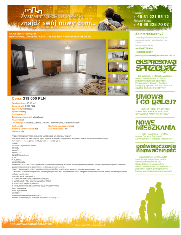 Zainteresowany? NR. OFERTY: 109000301 Zielona Góra, Lubuskie / Cena: 319 000 PLN / Mieszkanie: 98.00 m2 Żeby obejrzeć zadzwoń lub wyślij do nas swoje namiary skontaktujemy sie z Tobą. Rymaszewski Jacek +48501778914 +48683257007 [email protected] Są sytuacje, w których właściciel nieruchomości musi z różnych przyczyn szybko ją sprzedać. Proponujemy Swoim Klientom specjalny system, który pozwoli na szybkie znalezienie nabywcy. Cena: 319 000 PLN Powierzchnia: 98.00 m2 Cena za m2: 3 255 PLN Typ oferty: Sprzedaż Rynek: Wtórny Ilość pieter: 3 Typ nieruchomości: Mieszkanie Nr. piętra: 2 Lokalizacja: Lubuskie, Zielona Góra m., Zielona Góra, Osiedle Wazów Balkon: nie Kuchnia umeblowana: nie Piwnica: nie KUPNO KROK PO KROKU WYNAJEM KROK PO KROKU SPRZEDAŻ KROK PO KROKU Kuchnia wyposażona: nie Kuchnia widna: nie PRZESTRONNE CZTEROPOKOJOWE MIESZKANIE NA OSIEDLU WAZÓW Mieszkanie o pow. 98 mkw znajduje się na II piętrze w budynku trzypiętrowym. Budynek z cegły w dobrym stanie technicznym. Jest możliwość kupna garażu pod budynkiem w cenie 22 tyś. zł. UKŁAD: 1.SALON z wyjściem na balkon 2.POKÓJ 1 3.POKÓJ 2 4.POKÓJ 3 5.ŁAZIENKA z oknem 6. WC 7. KUCHNIA 8.PRZEDPOKÓJ STANDARD WYKOŃCZENIA: w pokojach na podłodze wykładzina, w salonie, kuchni i przedpokoju terakota. Ściany częściowo w tapecie, częściowo gładzone i szpachlowane. Łazienka i wc w glazurze, okna drewniane. OPŁATY ZWIĄZANE Z UTRZYMANIEM NIERUCHOMOŚCI: ok 600 zł ( do wspólnoty mieszkaniowej) + prąd + gaz LOKALIZACJA: mieszkanie położone w bliskiej odległości od lasu, również bardzo bliska odległość Uniwersytetu sprawia, że nieruchomość jest idealna pod cele inwestycyjne. WALORY NIERUCHOMOŚCI: 1. FUNKCJONALNY UKŁAD NIERUCHOMOŚCI 2. MIESZKANIE PRZY SAMYM UNIWERSYTECIE. 3. WSPÓLNOTA MIESZKANIOWA 4. NIERUCHOMOŚĆ IDEALNA POD CELE INWESTYCYJNE Agent prowadzący: Jacek Rymaszewski 501 778 914 [email protected] Zlecenie realizowane pod nadzorem pośrednika nr licencji 1717 http://www.apartament.net.pl Piąta Pora Roku > GUMAR Marek Guner > Bachalski Development > Osiedle Mazurskie > AGENCJA APARTAMENT funkcjonuje na polskim rynku nieruchomości od 15 lat! Sprzedaliśmy i wynajęliśmy nieruchomości setkom Klientów, a podobnej liczbie pomogliśmy w kupnie wymarzonej nieruchomości.