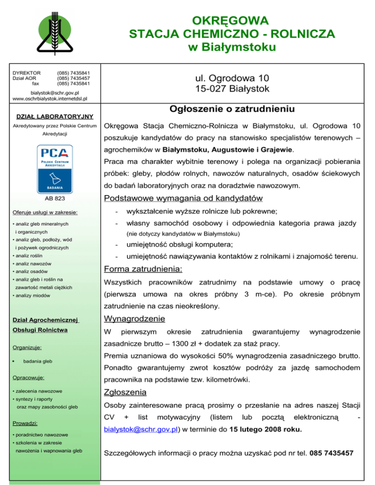 OKRĘGOWA STACJA CHEMICZNO - ROLNICZA w Białymstoku DYREKTOR Dział AOR fax (085) 7435841 (085) 7435457 (085) 7435841 ul. Ogrodowa 10 15-027 Białystok [email protected] www.oschrbialystok.internetdsl.pl Ogłoszenie o zatrudnieniu DZIAŁ LABORATORYJNY Akredytowany przez Polskie Centrum Akredytacji Okręgowa Stacja Chemiczno-Rolnicza w Białymstoku, ul. Ogrodowa 10 poszukuje kandydatów do pracy na stanowisko specjalistów terenowych – agrochemików w Białymstoku, Augustowie i Grajewie. Praca ma charakter wybitnie terenowy i polega na organizacji pobierania próbek: gleby, płodów rolnych, nawozów naturalnych, osadów ściekowych do badań laboratoryjnych oraz na doradztwie nawozowym. Podstawowe wymagania od kandydatów Oferuje usługi w zakresie: - wykształcenie wyższe rolnicze lub pokrewne; • analiz gleb mineralnych - własny samochód osobowy i odpowiednia kategoria prawa jazdy i organicznych (nie dotyczy kandydatów w Białymstoku) • analiz gleb, podłoży, wód i pożywek ogrodniczych • analiz roślin • analiz nawozów • analiz osadów • analiz gleb i roślin na zawartość metali ciężkich • analizy miodów - umiejętność obsługi komputera; - umiejętność nawiązywania kontaktów z rolnikami i znajomość terenu. Forma zatrudnienia: Wszystkich pracowników zatrudnimy na podstawie umowy o pracę (pierwsza umowa na okres próbny 3 m-ce). Po okresie próbnym zatrudnienie na czas nieokreślony. Dział Agrochemicznej Wynagrodzenie Obsługi Rolnictwa W Organizuje: badania gleb pierwszym okresie zatrudnienia Premia uznaniowa do wysokości 50% wynagrodzenia zasadniczego brutto. Ponadto gwarantujemy zwrot kosztów podróży za jazdę samochodem pracownika na podstawie tzw. kilometrówki. • zalecenia nawozowe Zgłoszenia oraz mapy zasobności gleb Prowadzi: • poradnictwo nawozowe wynagrodzenie zasadnicze brutto – 1300 zł + dodatek za staż pracy. Opracowuje: • syntezy i raporty gwarantujemy Osoby zainteresowane pracą prosimy o przesłanie na adres naszej Stacji CV + list motywacyjny (listem lub pocztą elektroniczną [email protected]) w terminie do 15 lutego 2008 roku. • szkolenia w zakresie nawożenia i wapnowania gleb Szczegółowych informacji o pracy można uzyskać pod nr tel. 085 7435457 -