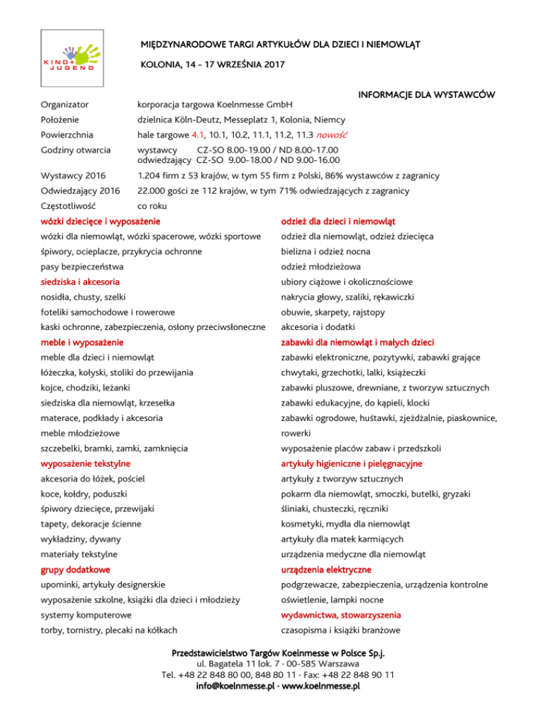 MIĘDZYNARODOWE TARGI ARTYKUŁÓW DLA DZIECI I NIEMOWLĄT KOLONIA, 14 14 - 17 WRZEŚNIA 2017 2017 INFORMACJE DLA WYSTAWCÓW Organizator korporacja targowa Koelnmesse GmbH Położenie dzielnica Köln-Deutz, Messeplatz 1, Kolonia, Niemcy Powierzchnia hale targowe 4.1, 10.1, 10.2, 11.1, 11.2, 11.3 nowość Godziny otwarcia wystawcy CZ-SO 8.00-19.00 / ND 8.00-17.00 odwiedzający CZ-SO 9.00-18.00 / ND 9.00-16.00 Wystawcy 2016 1.204 firm z 53 krajów, w tym 55 firm z Polski, 86% wystawców z zagranicy Odwiedzający 2016 22.000 gości ze 112 krajów, w tym 71% odwiedzających z zagranicy Częstotliwość co roku wózki dziecięce i wyposażenie odzież dla dzieci i niemowląt wózki dla niemowląt, wózki spacerowe, wózki sportowe odzież dla niemowląt, odzież dziecięca śpiwory, ocieplacze, przykrycia ochronne bielizna i odzież nocna pasy bezpieczeństwa odzież młodzieżowa siedziska i akcesoria ubiory ciążowe i okolicznościowe nosidła, chusty, szelki nakrycia głowy, szaliki, rękawiczki foteliki samochodowe i rowerowe obuwie, skarpety, rajstopy kaski ochronne, zabezpieczenia, osłony przeciwsłoneczne akcesoria i dodatki meble i wyposażenie zabawki dla niemowląt i małych dzieci meble dla dzieci i niemowląt zabawki elektroniczne, pozytywki, zabawki grające łóżeczka, kołyski, stoliki do przewijania chwytaki, grzechotki, lalki, książeczki kojce, chodziki, leżanki zabawki pluszowe, drewniane, z tworzyw sztucznych siedziska dla niemowląt, krzesełka zabawki edukacyjne, do kąpieli, klocki materace, podkłady i akcesoria zabawki ogrodowe, huśtawki, zjeżdżalnie, piaskownice, meble młodzieżowe rowerki szczebelki, bramki, zamki, zamknięcia wyposażenie placów zabaw i przedszkoli wyposażenie tekstylne artykuły higieniczne i pielęgnacyjne akcesoria do łóżek, pościel artykuły z tworzyw sztucznych koce, kołdry, poduszki pokarm dla niemowląt, smoczki, butelki, gryzaki śpiwory dziecięce, przewijaki śliniaki, chusteczki, ręczniki tapety, dekoracje ścienne kosmetyki, mydła dla niemowląt wykładziny, dywany artykuły dla matek karmiących materiały tekstylne urządzenia medyczne dla niemowląt grupy dodatkowe urządzenia elektryczne upominki, artykuły designerskie podgrzewacze, zabezpieczenia, urządzenia kontrolne wyposażenie szkolne, książki dla dzieci i młodzieży oświetlenie, lampki nocne systemy komputerowe wydawnictwa, stowarzyszenia stowarzyszenia torby, tornistry, plecaki na kółkach czasopisma i książki branżowe Przedstawicielstwo Targów Targów Koelnmesse w Polsce Sp.j. ul. Bagatela 11 lok. 7 · 00-585 Warszawa Tel. +48 22 848 80 00, 848 80 11 · Fax: +48 22 848 90 11 [email protected] · www.koelnmesse.pl MIĘDZYNARODOWE TARGI ARTYKUŁÓW DLA DZIECI I NIEMOWLĄT KOLONIA, 14 14 - 17 WRZEŚNIA 2017 2017 Koszty obowiązkowe wszystkie podane wartości są cenami netto Stoisko powierzchnia targowa za m2 bez zabudowy stoisko szeregowe jedna strona otwarta stoisko narożne stoisko czołowe stoisko wyspowe dwie strony otwarte trzy strony otwarte cztery strony otwarte stoisko szeregowe stoisko narożne stoisko czołowe stoisko wyspowe jedna strona otwarta dwie strony otwarte trzy strony otwarte cztery strony otwarte stoisko szeregowe stoisko narożne stoisko czołowe stoisko wyspowe jedna strona otwarta dwie strony otwarte trzy strony otwarte cztery strony otwarte włącznie do 125 każdy kolejny m2 125 m2 Zgłoszenie do 31.10.2016 31.10.2016 2 145,00 EURO/ m 119,00 EURO/ m2 154,00 EURO/ m2 119,00 EURO/ m2 157,00 EURO/ m2 119,00 EURO/ m2 163,00 EURO/ m2 119,00 EURO/ m2 Zgłoszenie do 31.12.2016 31.12.2016 2 155,00 EURO/ m 129,00 EURO/ m2 164,00 EURO/ m2 129,00 EURO/ m2 167,00 EURO/ m2 129,00 EURO/ m2 173,00 EURO/ m2 129,00 EURO/ m2 Zgłoszenie od 01.01.2017 01.01.2017 2 165,00 EURO/ m 139,00 EURO/ m2 174,00 EURO/ m2 139,00 EURO/ m2 177,00 EURO/ m2 139,00 EURO/ m2 183,00 EURO/ m2 139,00 EURO/ m2 Ryczałt za energię ogólne zużycie prądu, wody itp. 9,00 EURO/ m2 AUMA opłata na rzecz federacji targowej 0,60 EURO/ m2 Ryczałt na poczet usług serwisowych NKA dla firm biorących udział w targach po raz pierwszy dla firm biorących udział w targach kolejny raz Rozliczany po targach w zależności od zużycia 16,50 EURO/ m2 ryczałt naliczany jest na poziomie poniesionych kosztów podczas poprzedniej edycji targów Pakiet medialny Katalog drukowany/online/mobil 349,00 EURO obowiązkowy Zgłoszenie W celu dokonania zgłoszenia firmy do udziału w targach niezbędne jest wypełnienie dokumentów zgłoszeniowych. Procedurę rozpoczynają nadesłane formularze 1.10 i 1.30. Datą dokonania zgłoszenia jest dzień wpłynięcia dokumentów na adres z formularzy. Wynajem powierzchni min. wielkość stoiska 9,00 m2 max. wysokość stoiska 4,00 m Montaż stoiska od 09.09.2017 od godz. 8.00 do 13.09.2017 do godz.18.00 Demontaż stoiska od 17.09.2017 od godz.16.00 do 19.09.2017 do godz. 22.00 Zabudowa Koelnmesse Service http://stand.koelnmesse.de Koszty rezygnacji regulamin w dokumentach zgłoszeniowych zawarty w warunkach uczestnictwa: skrót punkt 10, część ogólna punkt II 8, cześć szczegółowa punkt 3.9. Niniejsze informacje ważne są wyłącznie z warunkami uczestnictwa w targach znajdującymi się w dokumentach zgłoszeniowych i nie stanowią oferty handlowej w rozumieniu art. 66 § 1 Kodeksu Cywilnego. www.kindundjugend.de // www.kindundjugend.com Przedstawicielstwo Targów Targów Koelnmesse w Polsce Sp.j. ul. Bagatela 11 lok. 7 · 00-585 Warszawa Tel. +48 22 848 80 00, 848 80 11 · Fax: +48 22 848 90 11 [email protected] · www.koelnmesse.pl