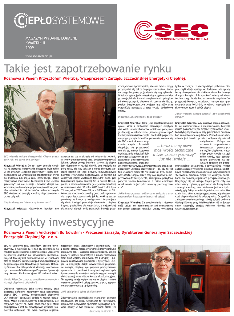 MAGAZYN WYDANIE LOKALNE KWARTAŁ II 2009 www.sec.szczecin.pl Takie jest zapotrzebowanie rynku Rozmowa z Panem Krzysztofem Wierzbą, Wiceprezesem Zarządu Szczecińskiej Energetyki Cieplnej. czyną chorób i przeziębień, ale nie tylko – mogą przyczyniać się także do pogarszania stanu technicznego budynku, pojawiania się zagrzybienia. W takich sytuacjach mieszkańcy często sami dogrzewają lokale innymi urządzeniami – piecykami elektrycznymi, olejowymi, często obniżając poziom bezpieczeństwa swojego i sąsiadów oraz oczywiście ponosząc z tego tytułu dodatkowe opłaty. Dlaczego SEC uruchomił taką usługę? SEC oferuje usługę dostępności Ciepła przez oznacza to, że w okresie od wiosny do jesieni, w tym w pełni gorącego lata, będziemy ogrzewać cały rok, na czym ona polega? lokale. Usługa polega bowiem na tym, że ciepło Krzysztof Wierzba: Do tej pory energia ciepl- jest dostępne w każdej chwili, bez względu na na na potrzeby ogrzewania dostępna była tylko porę roku, ale czy lokator z niego skorzysta zaw tak zwanym „sezonie grzewczym”, który roz- leżeć będzie od jego decyzji, indywidualnych poczynał się we wrześniu lub październiku i trwał potrzeb i warunków pogodowych. W okresie od do kwietnia lub maja roku następnego. Teraz wiosny do jesieni występują takie dni i noce, gdy mamy nowe możliwości techniczne i tzw. „sezon temperatura spada poniżej 12, a nawet 10 stogrzewczy” już nie istnieje – bowiem dzięki no- pni C, a zimno odczuwalne jest jeszcze bardziej woczesnej automatyce pogodowej możliwe jest, w deszczowe dni. W roku 2006 takich dni było aby niezależnie od terminów kalendarzowych 39, ale już w 2007 roku 78, a w 2008 roku aż 91. SEC dostarczał energię cieplną nieprzerwanie - Wówczas mocno odczuwalny jest brak ogrzewania, a pomieszczenia takie jak łazienki są szczeprzez cały rok. gólnie wyziębione, czy zawilgocone. Utrzymujący się chłód i wilgoć powodują dyskomfort cieplny Ciepło dostępne latem, czy to ma sens? i bywają uciążliwe dla wszystkich, a najczęściej Krzysztof Wierzba: Oczywiście, bowiem nie dla małych dzieci i osób starszych. Bywają przy- tylko w związku z rzeczywistym poborem ciepła, czyli kiedy wystąpi ochłodzenie, ale opłaty te są niewspółmiernie niskie w stosunku do uzyskanych korzyści. Ich wysokość zależy od stanu technicznego budynku, ustawienia regulatorów przygrzejnikowych, ustalonych temperatur granicznych oraz ilości dni, w których wystąpią niskie temperatury i pobór ciepła. Jakie warunki trzeba spełnić, aby uruchomić usługę? Krzysztof Wierzba: Takie jest zapotrzebowanie Krzysztof Wierzba: Aby dostawa ciepła odbywarynku. Wraz z nastaniem pierwszych ciepłych ła się automatycznie i nieprzerwanie, budynki dni wielu administratorów obiektów podejmu- muszą posiadać węzły cieplne wyposażone w auje decyzję o zakończeniu „sezonu grzewczego” tomatykę pogodową, a przy grzejnikach powinny i wstrzymaniu dostaw ciepła. Na skutek pogorsze- być zamontowane regulatory. Procedura uruchonia pogody część klientów ponownie zwraca się mienia jest bardzo prosta i odbywa się niemal natychmiast. Polega na do SEC z wnioskiem o włąustawieniu odpowiednich czenie ciepła. Pozostali … teraz mamy nowe temperatur granicznych decydują się przeczekać ten okres, nawet kosztem możliwości techniczne, na węźle cieplnym. Natopobór ciepła nastąpi wychłodzenia mieszkań lub a tzw. „sezon grzewczy” miast tylko wtedy, gdy tempeponoszenia kosztów za dojuż nie istnieje … ratura powietrza na zegrzewanie alternatywnymi wnątrz spadnie do poziopodgrzewaczami. Podobne dylematy towarzyszą administratorom przed roz- mu wcześniej ustalonego, a gdy wzrośnie - węzeł poczęciem „sezonu grzewczego” – tj. czy to już automatycznie wstrzyma dostawę ciepła. Dodatten właściwy moment? Nie musi tak być, ponie- kowo mieszkaniec ma możliwość indywidualnego waż oferta Ciepło przez cały rok zapewnia nie- sterowania poborem ciepła we własnym mieszprzerwaną dostawę ciepła, szczególnie pożądaną kaniu za pomocą regulatora przygrzejnikowego. podczas wahań temperatur, a także eliminuje Decydując się na usługę Ciepło przez cały rok oczekiwanie na już tylko umowny „sezon grzew- mieszkańcy zgłaszają gotowość do korzystania z energii cieplnej, ale pobierana jest ona tylko czy”. wtedy, gdy faktycznie istnieje taka potrzeba. NaJakie koszty ponosi odbiorca w związku z uru- sza infrastruktura jest przygotowana, aby dostarczać ciepło niezależnie od pory roku. Oczywiście chomieniem i korzystaniem z tej usługi? zainteresowanie tą usługą należy zgłosić do Biura Krzysztof Wierzba: Za uruchomienie i dostęp- Obsługi Klienta przy Wielkopolskiej 45 w Szczeność usługi ani administrator ani mieszkaniec cinie, szczegóły znajdą Państwo również na nie ponosi żadnych kosztów. Opłaty występują www.sec.szczecin.pl Projekty inwestycyjne Rozmowa z Panem Andrzejem Burkowskim - Prezesem Zarządu, Dyrektorem Generalnym Szczecińskiej Energetyki Cieplnej Sp. z o.o. Natomiast efekt techniczny i ekonomiczny – to z jednej strony niższa awaryjność pracy zarówno ciepłowni jak i systemu ciepłowniczego, dzięki pracy w pełnej automatyce i zmodernizowaniu sieci oraz węzłów cieplnych, zaś z drugiej - poprawa rentowności produkcji i dystrybucji ciepła, a osiągnięte dzięki nowoczesnej gospodarce energią cieplną, np. poprzez podwyższenie sprawności i żywotności urządzeń wytwórczych i przesyłowych, mniejsze zużycie węgla i energii elektrycznej oraz niższe koszty eksploatacyjne. Co dla klientów oznacza zrealizowanie moder- Te aspekty mają wpływ na cenę ciepła i mimo wzrostu cen paliw i usług zewnętrznych, zapewnizacji ciepłowni „Dąbska”? ne znacząco obniżą tą dynamikę. Odbiorca rozumiany jako strona umowy oraz odbiorca końcowy, rozumiany jako konsument Jaki osiągnięto efekt ekologic