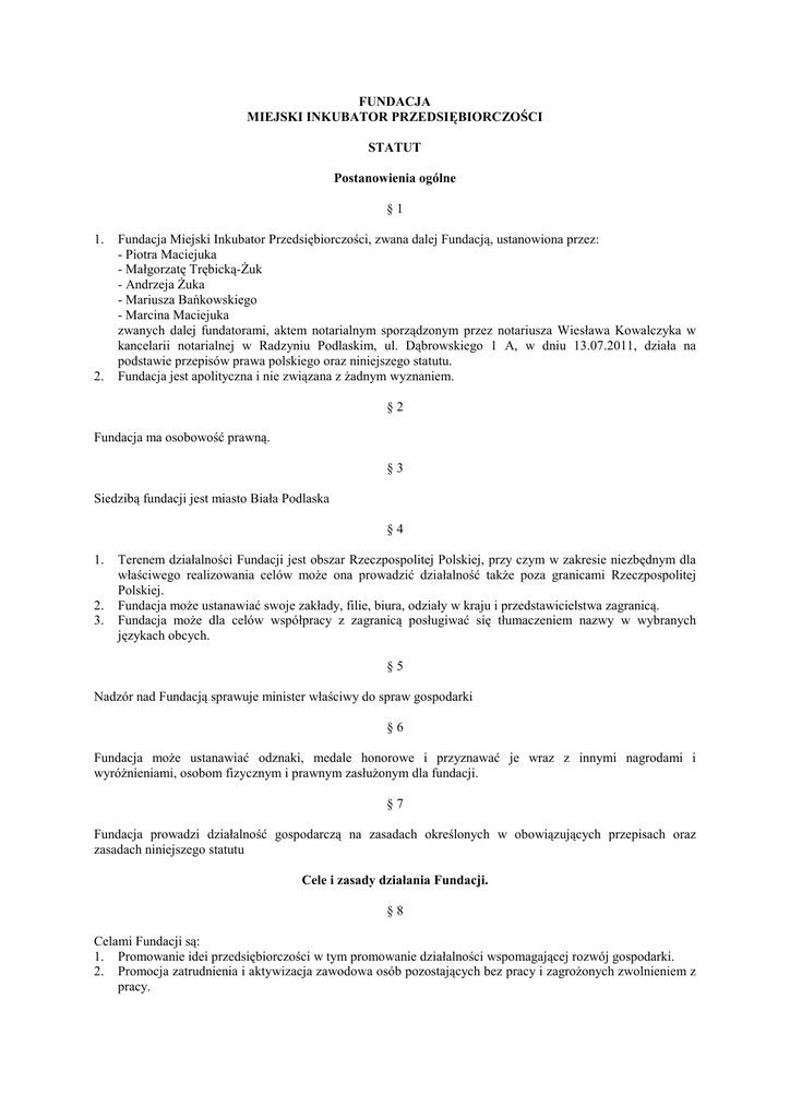 FUNDACJA MIEJSKI INKUBATOR PRZEDSIĘBIORCZOŚCI STATUT Postanowienia ogólne §1 1. 2. Fundacja Miejski Inkubator Przedsiębiorczości, zwana dalej Fundacją, ustanowiona przez: - Piotra Maciejuka - Małgorzatę Trębicką-śuk - Andrzeja śuka - Mariusza Bańkowskiego - Marcina Maciejuka zwanych dalej fundatorami, aktem notarialnym sporządzonym przez notariusza Wiesława Kowalczyka w kancelarii notarialnej w Radzyniu Podlaskim, ul. Dąbrowskiego 1 A, w dniu 13.07.2011, działa na podstawie przepisów prawa polskiego oraz niniejszego statutu. Fundacja jest apolityczna i nie związana z Ŝadnym wyznaniem. §2 Fundacja ma osobowość prawną. §3 Siedzibą fundacji jest miasto Biała Podlaska §4 1. 2. 3. Terenem działalności Fundacji jest obszar Rzeczpospolitej Polskiej, przy czym w zakresie niezbędnym dla właściwego realizowania celów moŜe ona prowadzić działalność takŜe poza granicami Rzeczpospolitej Polskiej. Fundacja moŜe ustanawiać swoje zakłady, filie, biura, odziały w kraju i przedstawicielstwa zagranicą. Fundacja moŜe dla celów współpracy z zagranicą posługiwać się tłumaczeniem nazwy w wybranych językach obcych. §5 Nadzór nad Fundacją sprawuje minister właściwy do spraw gospodarki §6 Fundacja moŜe ustanawiać odznaki, medale honorowe i przyznawać je wraz z innymi nagrodami i wyróŜnieniami, osobom fizycznym i prawnym zasłuŜonym dla fundacji. §7 Fundacja prowadzi działalność gospodarczą na zasadach określonych w obowiązujących przepisach oraz zasadach niniejszego statutu Cele i zasady działania Fundacji. §8 Celami Fundacji są: 1. Promowanie idei przedsiębiorczości w tym promowanie działalności wspomagającej rozwój gospodarki. 2. Promocja zatrudnienia i aktywizacja zawodowa osób pozostających bez pracy i zagroŜonych zwolnieniem z pracy. 3. 4. 5. 6. 7. 8. 9. Upowszechnianie nauki, edukacji, oświaty i wychowania w tym wspieranie inicjatyw na rzecz rozwoju nauki i sztuki. Upowszechnianie i ochrona wolności i praw człowieka oraz swobód obywatelskich w tym takŜe działań wspomagających rozwój demokracji. Szerzenie informacji dotyczącej rynków pracy, studiów, stypendiów oraz praktyk studenckich w kraju i za granicą. Propagowanie i wdraŜanie działań proekologicznych oraz działań w zakresie edukacji ekologicznej. Poszukiwanie i szkolenie młodych liderów. Tworzenie warunków wykorzystania potencjału intelektualnego młodzieŜy akademickiej, a w szczególności współorganizowanie studenckiego ruchu naukowego, organizowanie działalności kulturalnej oraz popieranie i rozwijanie twórczości artystycznej. Podejmowanie inicjatyw na rzecz aktywności zawodowej i społecznej młodzieŜy. §9 Fundacja realizuje swoje cele poprzez: 1. Udzielanie pomocy osobom fizycznym w tworzeniu nowych przedsiębiorstw oraz udzielanie pomocy wszelkim podmiotom prawa w realizacji przedsięwzięć gospodarczych, poprzez prowadzenie inkubatora przedsiębiorczości na zasadach określonych w regulaminie inkubatora i w obowiązujących przepisach. 2. Prowadzenie poradnictwa obywatelskiego, w postaci niezaleŜnych usług wspierających samodzielność obywateli. 3. Działalność edukacyjną, wydawniczą i badawczą. 4. Współpracę z instytucjami państwowymi, szkołami wyŜszymi, samorządami studenckimi oraz innymi organizacjami i instytucjami krajowymi i zagranicznymi w zakresie objętym celami Fundacji oraz z osobami fizycznymi wykazującymi zainteresowanie celami Fundacji. 5. Akcje mające na celu propagowanie kreatywności, inicjatyw młodzieŜowych i aktywności zawodowej, działalności charytatywnej i prospołecznej. § 10 Dla osiągnięcia swych celów Fundacja moŜe wspierać działalność innych osób i instytucji zbieŜną z jej celami. Majątek i dochody Fundacji. § 11 Majątek Fundacji stanowi jej fundusz załoŜycielski w kwocie 2.000 ( dwa tysiące ) złotych oraz inne mienie nabyte przez Fundację w toku działania, w tym 1.000 ( jeden tysiąc ) złotych z przeznaczeniem na działalność gospodarczą. § 12 Dochody Fundacji pochodzić mogą w szczególności z: 1. darowizn, spadków, zapisów, 2. dotacji i subwencji oraz grantów, 3. dochodów ze zbiórek i imprez publicznych, 4. dochodów z majątku Fundacji. 5. świadczeń fundatora. 6. dochodów z działalności gospodarczej Fundacji. § 13 1. 2. 3. Dochody pochodzące z dotacji, subwencji, darowizn, spadków i zapisów mogą być uŜyte na realizację celów Fundacji tylko z poszanowaniem woli spadkobierców lub fundatorów. W sprawach przyjęcia darowizn i dziedziczenia oświadczenia wymagane przepisami prawa składa Zarząd Fundacji. W przypadku powołania fundacji do dziedziczenia jej zarząd składa oświadczenie o przyjęciu spadku z dobrodziejstwem inwentarza. Władze Fundacji. § 14 1. 2. 3. Władzami fundacji są: a) Rada Fundacji, b) Zarząd Fundacji. Członkowie Rady Fundacji nie pobierają wynagrodzenia z tytułu udziału w pracach tego organu, z wyjątkiem zwrotu udokumentowanych wydatków związanych z uczestnictwem w pracach tych organów, w tym kosztów podróŜy. Fundatorzy mogą wejść w skład Fundacji. Rada Fundacji. § 15 1. 2. 3. 4. 5. 6. 7. 8. 9. Rada Fundacji jest organem kontrolnym, uchwałodawczym i opiniującym Fundacji. Rada Fundacji składa się z dwóch do sześciu członków. Pierwszy skład Rady Fundacji powołują Fundatorzy. Następnych członków Rady na miejsce osób, które przestały pełnić tę funkcję lub dla rozszerzenia składu Rady, powołuje swą decyzją Rada. W szczególnie uzasadnionych przypadkach odwołanie członka Rady i przez to pozbawienie go członkostwa w Radzie, moŜe nastąpić w wyniku uchwały podjętej jednogłośnie przez pozostałych członków Rady Fundacji. Fundatorzy nie mogą być w ten sposób pozbawieni członkostwa w Radzie Fundacji. Członkostwo w Radzie Fundacji ustaje w przypadku pisemnej rezygnacji z członkostwa, śmierci członka Rady oraz w sytuacji przewidzianej w ust. 5. Nie moŜna 