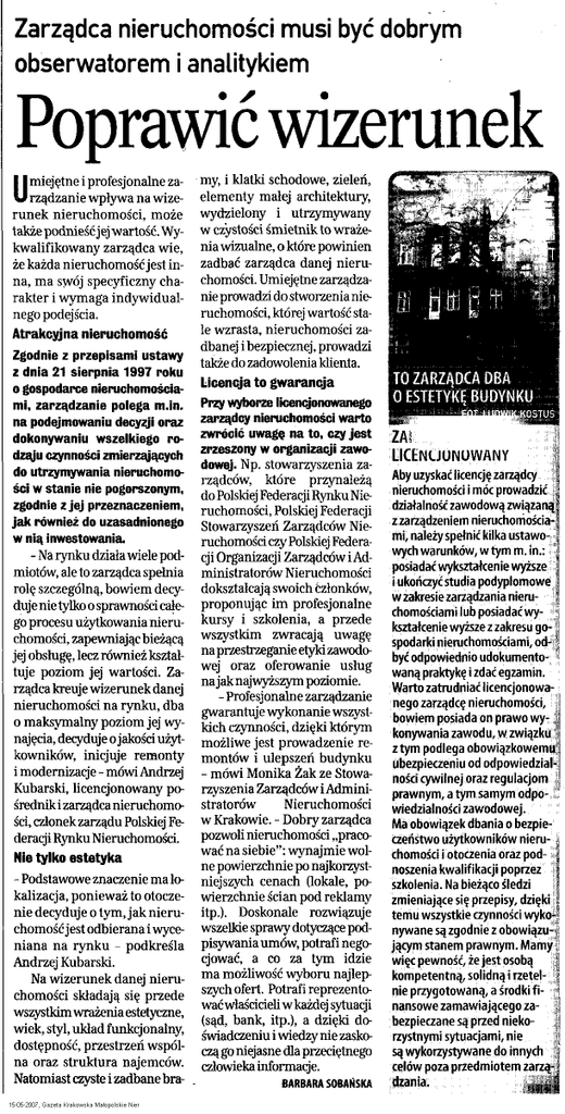 Zarządca nieruchomości musi być dobrym obserwatorem i analitykiem Poprawić wizerunek miejętne i profesjonalne zarządzanie wpływa na wizerunek nieruchomości, może także podnieść jej wartość. Wykwalifikowany zarządca wie, że każda nieruchomość jest inna, ma swój specyficzny charakter i wymaga indywidualnego podejścia. Atrakcyjna nieruchomość U Zgodnie z przepisami ustawy z dnia 21 sierpnia 1997 roku o gospodarce nieruchomościami, zarządzanie polega m.in. na podejmowaniu decyzji oraz dokonywaniu wszelkiego rodzaju czynności zmierzających do utrzymywania nieruchomości w stanie nie pogorszonym, zgodnie z jej przeznaczeniem, jak również do uzasadnionego w nią inwestowania. - Na rynku działa wiele podmiotów, ale to zarządca spełnia rolę szczególną, bowiem decyduje nie tylko o sprawności całego procesu użytkowania nieruchomości, zapewniając bieżącą jej obsługę, lecz również kształtuje poziom jej wartości. Zarządca kreuje wizerunek danej nieruchomości na rynku, dba 0 maksymalny poziom jej wynajęcia, decyduje o jakości użytkowników, inicjuje remonty 1 modernizacje - mówi Andrzej Kubarski, licencjonowany pośrednikizarządca nieruchomości, członek zarządu Polskiej Federacji Rynku Nieruchomości. Nie tylko estetyka - Podstawowe znaczenie ma lokalizacja, ponieważ to otoczenie decyduje o tym, jak nieruchomość jest odbierana i wyceniana na rynku - podkreśla Andrzej Kubarski. Na wizerunek danej nieruchomości składają się przede wszystkim wrażenia estetyczne, wiek, styl, układ funkcjonalny, dostępność, przestrzeń wspólna oraz struktura najemców. Natomiast czyste i zadbane bra- my, i klatki schodowe, zieleń, elementy małej architektury, wydzielony i utrzymywany w czystości śmietnik to wrażenia wizualne, o które powinien zadbać zarządca danej nieruchomości. Umiejętne zarządzanie prowadzi do stworzenia nieruchomości, której wartość stale wzrasta, nieruchomości zadbanej i bezpiecznej, prowadzi także do zadowolenia klienta. Licencja to gwarancja Przy wyborze licencjonowanego zarządcy nieruchomości warto zwrócić uwagę na to, czy jest zrzeszony w organizacji zawodowej. Np. stowarzyszenia zarządców, które przynależą do Polskiej Federacji Rynku Nieruchomości, Polskiej Federacji Stowarzyszeń Zarządców Nieruchomości czy Polskiej Federacji Organizacji Zarządców i Administratorów Nieruchomości dokształcają swoich członków, proponując im profesjonalne kursy i szkolenia, a przede wszystkim zwracają uwagę na przestrzeganie etyki zawodowej oraz oferowanie usług na jaknajwyższym poziomie. - Profesjonalne zarządzanie gwarantuje wykonanie wszystkich czynności, dzięki którym możliwe jest prowadzenie remontów i ulepszeń budynku - mówi Monika Żak ze Stowarzyszenia Zarządców i Administratorów Nieruchomości w Krakowie. - Dobry zarządca pozwoli nieruchomości „pracować na siebie": wynajmie wolne powierzchnie po najkorzystniejszych cenach (lokale, powierzchnie ścian pod reklamy itp.). Doskonale rozwiązuje wszelkie sprawy dotyczące podpisywaniaumów, potrafi negocjować, a co za tym idzie ma możliwość wyboru najlepszych ofert. Potrafi reprezentowaćwłaścicieliwkażdej sytuacji (sąd, bank, itp.), a dzięki doświadczeniu i wiedzy nie zaskoczą go niejasne dla przeciętnego człowieka informacje. BARBARASOBAŃSKA ZA! LICENCJONOWANY ! Aby uzyskać licencjęzarządcy j nieruchomości i móc prowadzić ; działalność zawodową związaną z za rządzeniem nieruchomościami, należy spełnić kilka ustawowych warunków, w tym m. in.: posiadać wykształcenie wyższe i ukończyć studia podyplomowe wzakresiezarządzanianieru- " chomościami lub posiadać wy- 1 kształcenie wyższe z zakresu gospodarki nieruchomościami, od- * być odpowiednio udokumentowaną praktykę i zdać egzamin. Warto zatrudniać licencjonowanego zarządcę nieruchomości, j bowiem posiada on prawo wykonywania zawodu, w związku z tym podlega obowiązkowemu ubezpieczeniu od odpowiedzialności cywilnej oraz regulacjom prawnym, a tym samym odpowiedzialności zawodowej. Ma obowiązek dbania o bezpieczeństwo użytkowników nieru-, chomości i otoczenia oraz pod- ] noszenia kwalifikacji poprzez ; szkolenia. Na bieżąco śledzi i zmieniające się przepisy, dzięki : temu wszystkie czynności wyko*1 nywane są zgodnie z obowiązującym stanem prawnym. Mamy więc pewność, że jest osobą j kompetentną, solidną i rzetel- \ nie przygotowaną, a środki f i- H nansowe zamawiającego zabezpieczane są przed nieko- |j rzystnymi sytuacjami, nie są wykorzystywane do innych « celów poza przedmiotem zarządzania.