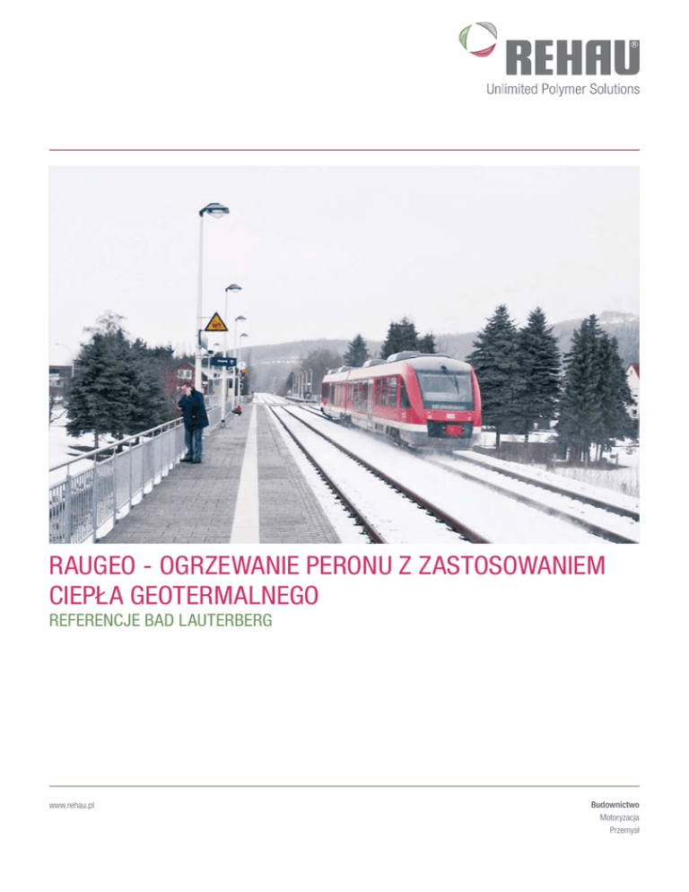 Raugeo - ogrzewanie peronu z zastosowaniem ciepła geotermalnego Referencje Bad Lauterberg www.rehau.pl Budownictwo Motoryzacja Przemysł Obiekt: Ogrzewanie peronu z zastosowaniem ciepła geotermalnego w Bad Lauterberg Zastosowane systemy: Sonda RAUGEO PE 100 Kolektor RAUGEO PE-Xa Preizolowane rury do sieci ciepłowniczych RAUTHERMEX Inwestor: DB Station & Service Projektant: Biuro Inżynieryjne Vössing Gmbh, D-30173 Hannover Wykonawca: Frenzel-Bau GmbH, D-08502 Plauen Projekt ogrzewania ciepłem geotermalnym: Arcadis Consult GmbH, D-64293 Darmstadt Wykonawca odwiertów: Terrasond GmbH & Co. KG, D-89312 Günzburg Cel projektu: Dzięki zastosowaniu energii odnawialnych w powierzchniowym ogrzewaniu zapewnia się całoroczne utrzymanie peronu w Bad Lauterberg w stanie wolnym od śniegu i oblodzenia. Dzięki takiemu rozwiązaniu oszczędza się na kosztach odśnieżania oraz wzrasta bezpieczeństwo pasażerów. Następuje też wyraźna redukcja zabrudzenia wagonów. Sposób funkcjonowania: W połączeniu z wykorzystaniem energii geotermalnej i słonecznej wolne powierzchnie dworca kolejowego służą w okresie letnim jako kolektory słoneczne. Zainstalowane pod powierzchnią peronu kolektory rurowe przejmują energię słoneczną i przekazują ją poprzez 9 sond geotermalnych w głąb ziemi, gdzie zostaje zakumulowane ciepło. W zimie proces ten przebiega odwrotnie: zakumulowane ciepło zostaje odebrane z gruntu poprzez sondy geotermalne i doprowadzone rurami kolektora na powierzchnię peronu. Dzięki temu peron pozostaje przez cały rok wolny od śniegu i oblodzenia. Ze względu na wysokie temperatury pracy w miesiącach letnich rury kolektora RAUGEO PE-Xa doskonale nadają się do zastosowania. Obok odporności na wysokie temperatury do +95º rury te odznaczają się również szczególnie wysoką odpornością na udarność, powstawanie rys oraz obciążenia punktowe. Kolejną zaletą jest oszczędność miejsca związana z dużym promieniem gięcia. Jako sondy zostało wybranych 9 sond RAUGEO z PE 100. Fabrycznie przyspawana głowica sondy i kontrola produkcji przez zewnętrzne instytucje zapewniają odpowiednią jakość. Dzięki małej średnicy głowicy sondy (84mm) możliwa jest szczególnie mała średnica odwiertu. Podłączenie peronu do rozdzielacza wykonane jest przy zastosowaniu rur preizolowanch RAUTHERMEX, które nadają się idealnie dzięki odporności na wysokie temperatury rury medialnej z PE-Xa i znakomitym właściwościom izolującym. ©REHAU 827401 PL POL 09.2007