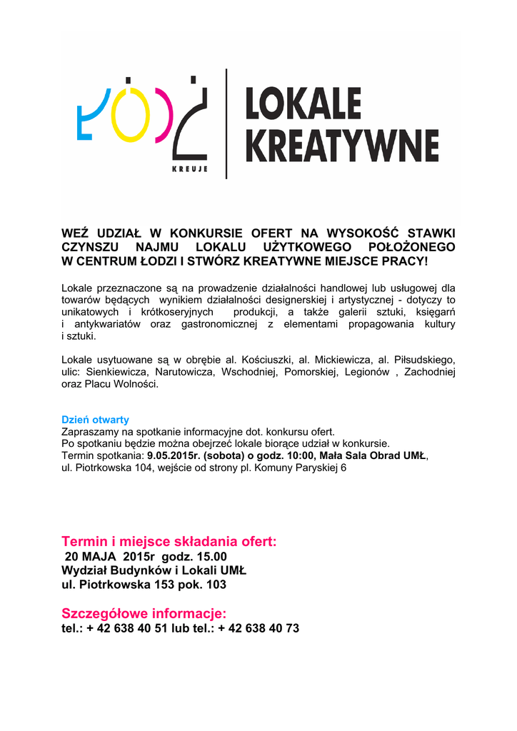 WEŹ UDZIAŁ W KONKURSIE OFERT NA WYSOKOŚĆ STAWKI CZYNSZU NAJMU LOKALU UŻYTKOWEGO POŁOŻONEGO W CENTRUM ŁODZI I STWÓRZ KREATYWNE MIEJSCE PRACY! Lokale przeznaczone są na prowadzenie działalności handlowej lub usługowej dla towarów będących wynikiem działalności designerskiej i artystycznej - dotyczy to unikatowych i krótkoseryjnych produkcji, a także galerii sztuki, księgarń i antykwariatów oraz gastronomicznej z elementami propagowania kultury i sztuki. Lokale usytuowane są w obrębie al. Kościuszki, al. Mickiewicza, al. Piłsudskiego, ulic: Sienkiewicza, Narutowicza, Wschodniej, Pomorskiej, Legionów , Zachodniej oraz Placu Wolności. Dzień otwarty Zapraszamy na spotkanie informacyjne dot. konkursu ofert. Po spotkaniu będzie można obejrzeć lokale biorące udział w konkursie. Termin spotkania: 9.05.2015r. (sobota) o godz. 10:00, Mała Sala Obrad UMŁ, ul. Piotrkowska 104, wejście od strony pl. Komuny Paryskiej 6 Termin i miejsce składania ofert: 20 MAJA 2015r godz. 15.00 Wydział Budynków i Lokali UMŁ ul. Piotrkowska 153 pok. 103 Szczegółowe informacje: tel.: + 42 638 40 51 lub tel.: + 42 638 40 73