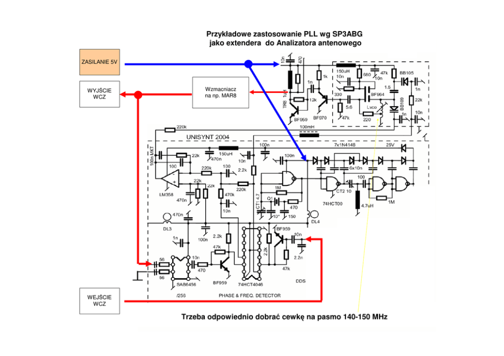 Przykładowe zastosowanie PLL wg SP3ABG jako extendera do Analizatora antenowego ZASILANIE 5V WYJ CIE WCZ Wzmacniacz na np. MAR8 WEJ CIE WCZ Trzeba odpowiednio dobra cewk na pasmo 140-150 MHz