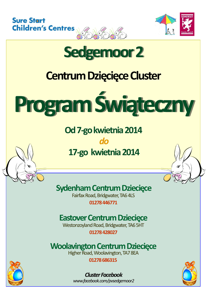 Sedgemoor 2 Centrum Dzięcięce Cluster Program Świąteczny Od 7-go kwietnia 2014 do 17-go kwietnia 2014 Sydenham Centrum Dziecięce Fairfax Road, Bridgwater, TA6 4LS 01278 446771 Eastover Centrum Dziecięce Westonzoyland Road, Bridgwater, TA6 5HT 01278 428027 Woolavington Centrum Dziecięce Higher Road, Woolavington, TA7 8EA 01278 686315 Cluster Facebook www.facebook.com/pvsedgemoor2 WTOREK 15 KWIECIEŃ Eastover Centrum Dziecięce Nastolatki i maluchy 1.30 - 3.00 Woolavington Centrum Dziecięce Wiosenne robótki ręczne 10.00 - 12.00 Puriton Village Hall Zabawy prowadzone przez wolontariuszy 1.45 - 3.00 ŚRODA 16 KWIECIEŃ Eastover Centrum Dziecięce Wielkanocna Ekstravaganza 10.00 - 12.00 (Malowanie twarzy, szukanie jajek, muzyczne warsztaty i inne dodatkowe zajęcia) Sydenham Centrum Dziecięce Poranek przy kawie i ciastku dla wolonatariuszy 10.00 - 12.00 CZWARTEK 17 KWIECIEŃ Sydenham Centrum Dziecięce Klinika zdrowego Dziecka 1.00 - 2.30 Spotkanie dla rodziców 9.00 - 10.00 Westonzoyland Young Farmers Hall Zabawy prowadzone przez wolontariuszy 10.30 - 11.45 : PONIEDZIAŁEK 7 KWIECIEŃ Sydenham Centrum Dziecięce Klinika Niemowlęca 10.00 - 12.00 Wielkanocne robótki ręczne 1.00 - 3.00 WTOREK 8 KWIECIEŃ Eastover Centrum Dziecięce Nastolatki i maluchy 1.30 - 3.00 Woolavington Centrum Dziecięce Wielkanocne robótki ręczne 10.00 - 12.00 Puriton Village Hall Zabawy w Puriton (prowadzone przez wolontariuszy 1.45 - 3.00 ŚRODA 9 KWIECIEŃ Eastover Centrum Dziecięce Wielkanocne warsztaty gotowania 10.00 - 12.00 CZWARTEK 10 KWIECIEŃ Eastover Centrum Dziecięce Wielkanocne robótki ręczne 10.00 - 12.00 Sydenham Centrum Dziecięce Klinika zdrowego dziecka 1.00 - 2.30 Westonzoyland Young Farmers Hall Zabawy w Westonzoyland (wolontariusze) 10.30 - 11.45 PIĄTEK 11 KWIECIEŃ Sydenham Centrum Dziecięce Wielkanocne warsztaty gotowania 1.00 - 3.00 Woolavington Pavilion Wielkanocna Ekstrawaganza 10.00 - 12.00 (malowanie twarzy, szukanie jajek i inne wspaniałe zabawy) Program o wolności 1.00 - 2.30 (wstęp wolny) Zapewniona opieka dla małych dzieci.Jeśli masz pyania możesz skontaktowac się z dowolnym centrum . PONIEDZIAŁEK 14 KWIECIEŃ Sydenham Centrum Dziecięce Wielkanocna Ekstravaganza 10.00 - 12.00 (malowanie twarzy, szukanie jajek oraz inne wielkanocne zabawy) :