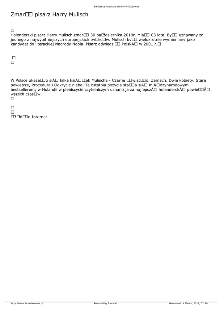 Biblioteka Publiczna Gminy WiÄ…zowna ZmarÅ‚ pisarz Harry Mulisch Holenderski pisarz Harry Mulisch zmarÅ‚ 30 paÅździernika 2010r. MiaÅ‚ 83 lata. ByÅ‚ uznawany za jednego z najwybitniejszych europejskich twÃłrcÃłw. Mulisch byÅ‚ wielokrotnie wymieniany jako kandydat do literackiej Nagrody Nobla. Pisarz odwiedziÅ‚ PolskÄ™ w 2001 r. W Polsce ukazaÅ‚o siÄ™ kilka ksiÄ…Åźek Mulischa - Czarne Å›wiatÅ‚o, Zamach, Dwie kobiety. Stare powietrze, Procedura i Odkrycie nieba. Ta ostatnia pozycja staÅ‚a siÄ™ miÄ™dzynarodowym bestsellerem; w Holandii w plebiscycie czytelniczym uznano ja za najlepszÄ… holenderskÄ… powieść wszech czasÃłw. ŹrÃłdÅ‚o Internet http://www.bp-wiazowna.pl Powered by Joomla! Generated: 4 March, 2017, 02:49