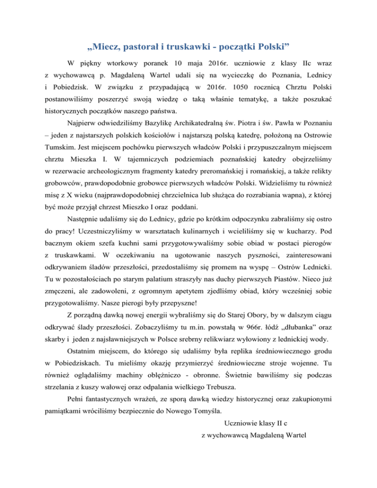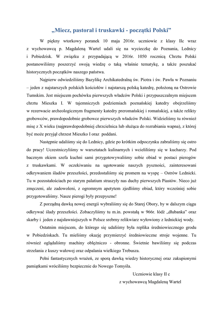 „Miecz, pastorał i truskawki - początki Polski” W piękny wtorkowy poranek 10 maja 2016r. uczniowie z klasy IIc wraz z wychowawcą p. Magdaleną Wartel udali się na wycieczkę do Poznania, Lednicy i Pobiedzisk. W związku z przypadającą w 2016r. 1050 rocznicą Chrztu Polski postanowiliśmy poszerzyć swoją wiedzę o taką właśnie tematykę, a także poszukać historycznych początków naszego państwa. Najpierw odwiedziliśmy Bazylikę Archikatedralną św. Piotra i św. Pawła w Poznaniu – jeden z najstarszych polskich kościołów i najstarszą polską katedrę, położoną na Ostrowie Tumskim. Jest miejscem pochówku pierwszych władców Polski i przypuszczalnym miejscem chrztu Mieszka I. W tajemniczych podziemiach poznańskiej katedry obejrzeliśmy w rezerwacie archeologicznym fragmenty katedry preromańskiej i romańskiej, a także relikty grobowców, prawdopodobnie grobowce pierwszych władców Polski. Widzieliśmy tu również misę z X wieku (najprawdopodobniej chrzcielnica lub służąca do rozrabiania wapna), z której być może przyjął chrzest Mieszko I oraz poddani. Następnie udaliśmy się do Lednicy, gdzie po krótkim odpoczynku zabraliśmy się ostro do pracy! Uczestniczyliśmy w warsztatach kulinarnych i wcieliliśmy się w kucharzy. Pod bacznym okiem szefa kuchni sami przygotowywaliśmy sobie obiad w postaci pierogów z truskawkami. W oczekiwaniu na ugotowanie naszych pyszności, zainteresowani odkrywaniem śladów przeszłości, przedostaliśmy się promem na wyspę – Ostrów Lednicki. Tu w pozostałościach po starym palatium straszyły nas duchy pierwszych Piastów. Nieco już zmęczeni, ale zadowoleni, z ogromnym apetytem zjedliśmy obiad, który wcześniej sobie przygotowaliśmy. Nasze pierogi były przepyszne! Z porządną dawką nowej energii wybraliśmy się do Starej Obory, by w dalszym ciągu odkrywać ślady przeszłości. Zobaczyliśmy tu m.in. powstałą w 966r. łódź „dłubanka” oraz skarby i jeden z najsławniejszych w Polsce srebrny relikwiarz wyłowiony z lednickiej wody. Ostatnim miejscem, do którego się udaliśmy była replika średniowiecznego grodu w Pobiedziskach. Tu mieliśmy okazję przymierzyć średniowieczne stroje wojenne. Tu również oglądaliśmy machiny oblężniczo - obronne. Świetnie bawiliśmy się podczas strzelania z kuszy wałowej oraz odpalania wielkiego Trebusza. Pełni fantastycznych wrażeń, ze sporą dawką wiedzy historycznej oraz zakupionymi pamiątkami wróciliśmy bezpiecznie do Nowego Tomyśla. Uczniowie klasy II c z wychowawcą Magdaleną Wartel