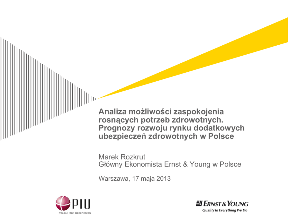 Analiza możliwości zaspokojenia rosnących potrzeb zdrowotnych. Prognozy rozwoju rynku dodatkowych ubezpieczeń zdrowotnych w Polsce Marek Rozkrut Główny Ekonomista Ernst & Young w Polsce Warszawa, 17 maja 2013 Plan prezentacji I. Rosnące zapotrzebowanie na świadczenia zdrowotne II. Ograniczone możliwości finansowania dodatkowych świadczeń ze środków publicznych III. Perspektywy rozwoju rynku dodatkowych ubezpieczeń zdrowotnych IV. Podsumowanie Strona 2 Czynniki wywierające presję na wzrost wydatków na ochronę zdrowia ► Można wyróżnić trzy kluczowe czynniki wpływające na rosnący popyt na usługi zdrowotne: demograficzny, dochodowy oraz technologiczny. (czynnik demograficzny) 2. Wzrost zamożności społeczeństwa (czynnik dochodowy) 3. Rozwój technologii i wiedzy medycznej (czynnik technologiczny) Strona 3 Wzrost wydatków na ochronę zdrowia 1. Proces starzenia się ludności W nadchodzących dekadach odsetek osób starszych w populacji Polski istotnie wzrośnie ► ► Liczba osób w wieku 65+ wzrośnie z 5,1 mln w 2010 r. (13% ludności) do 11,3 mln w 2060 r. (ponad 34% populacji). Odsetek osób w wieku produkcyjnym (20-64 lata) spadnie z 65% w 2010 do 49% w 2060 r. Piramidy płci i wieku dla Polski w latach 1990-2060 1990 mężczyźni 2010 mężczyźni kobiety 2030 kobiety 85+ 80-84 10% 75-79 70-74 65-69 60-64 55-59 50-54 45-49 57% 40-44 35-39 30-34 25-29 20-24 15-19 33% 10-14 5-9 0-4 85+ 80-84 75-79 70-74 65-69 60-64 55-59 50-54 45-49 40-44 35-39 30-34 25-29 20-24 15-19 10-14 5-9 0-4 5 4 3 2 1 0 1 2 3 4 5 Źródło: Eurostat. Strona 4 mężczyźni 85+ 80-84 13% 75-79 70-74 65-69 60-64 55-59 50-54 45-49 65% 40-44 35-39 30-34 25-29 20-24 15-19 22% 10-14 5-9 0-4 5 4 3 2 1 0 1 2 3 4 5 Osoby w wieku produkcyjnym (20-64) kobiety 2060 mężczyźni 85+ 80-84 23% 75-79 70-74 65-69 60-64 55-59 50-54 45-49 58% 40-44 35-39 30-34 25-29 20-24 15-19 19% 10-14 5-9 0-4 5 4 3 2 1 0 1 2 3 4 5 Osoby w wieku nieprodukcyjnym kobiety 5 4 3 2 1 0 1 2 3 4 5 34% 49% 17% Starzenie się populacji Polski jest wyjątkowo szybkie na tle pozostałych krajów UE ► ► W 2010 r. w Polsce na jedną osobę w wieku 65+ przypadało około pięć osób w wieku produkcyjnym. Do 2060 r. relacja osób w wieku 65+ do osób w wieku 20-64 lata zwiększy się istotnie we wszystkich krajach UE, jednak w Polsce zmiana ta będzie wyjątkowo silna – na jedną osobę w wieku 65+ będzie przypadać zaledwie 1,4 osoby w wieku 20-64 lata. Relacja liczby osób w wieku 65+ do liczby osób w wieku 20-64 lata w krajach Unii Europejskiej 2010 80% 2060 80% 71% UE-27: 58% 40% 60% 21% UE-27: 28% 40% 20% 0% 0% Irlandia Słowacja Cypr Polska Luksemburg Rumunia Malta Czechy Holandia Słowenia Litwa Węgry Hiszpania Wielka Brytania Dania Bułgaria Estonia Łotwa Finlandia Francja Belgia Austria Portugalia Grecja Szwecja Włochy Niemcy 20% Źródło: Eurostat. Strona 5 Irlandia Wielka Brytania Dania Belgia Luksemburg Szwecja Francja Cypr Holandia Finlandia Austria Czechy Malta Estonia Hiszpania Włochy Portugalia Grecja Litwa Węgry Słowenia Niemcy Bułgaria Słowacja Rumunia Polska Łotwa 60% Wydatki na ochronę zdrowia rosną wraz z wiekiem ► Oznacza to, że przy braku istotnych zmian w strukturze zachorowalności według wieku, starzenie się populacji będzie prowadzić do wzrostu zapotrzebowania oraz zmiany struktury popytu na świadczenia zdrowotne. To z kolei będzie rodzić konsekwencje dla systemu finansowania oraz dla podaży usług medycznych. Profil wydatków NFZ na świadczenia opieki zdrowotnej w Polsce na mieszkańca w zależności od wieku w 2011 roku (tys. PLN) 4.0 65+ 3.5 Średnia: 3,4 tys. PLN 3.0 2.5 2.0 1.5 Średnia: 1,2 tys. PLN 1.0 0.5 0 2 4 6 8 10 12 14 16 18 20 22 24 26 28 30 32 34 36 38 40 42 44 46 48 50 52 54 56 58 60 62 64 66 68 70 72 74 76 78 80 82 84 86 88 90 92 94 96 98 100 0.0 Źródło: Narodowy Fundusz Zdrowia. Strona 6 Wydatki na ochronę zdrowia rosną szybciej niż dochód Istnieje istotna zależność pomiędzy poziomem rozwoju gospodarczego a wielkością wydatków na opiekę zdrowotną danego kraju. Co więcej, wydatki na zdrowie rosną szybciej niż dochody. Wraz ze wzrostem zamożności, ludzie są skłonni przeznaczać na ten cel coraz większą część swojego dochodu. W Polsce relacja wydatków na zdrowie do PKB wzrosła w latach 1990-2010 z 4,8% do 7,0%. ► ► Relacja pomiędzy poziomem PKB per capita a wydatkami na zdrowie per capita w krajach OECD* w 2010 r. Wydatki na zdrowie w relacji do PKB w Polsce oraz pozostałych krajach OECD w latach 1990-2010 PKB per capita w tys. USD (PPP) % PKB 60 10 9 50 US 8 40 7 30 6 20 5 PL 4 10 0 2 4 6 8 10 1990 Wydatki na ochronę zdrowia w tys. USD per capita (PPP) Źródło: Opracowanie własne na podstawie danych OECD. * Bez Luksemburga. Strona 7 1995 Polska 2000 2005 2010 Średnia wartość dla pozostałych krajów OECD Wpływ rozwoju technologii i wiedzy medycznej ► ► Z przeglądu badań wynika, iż rozwój technologii medycznej może odpowiadać za znaczną część wzrostu wydatków na opiekę zdrowotną w krajach rozwiniętych. Jednakże z prognoz Komisji Europejskiej wynika, iż w Polsce czynnik technologiczny odegra w najbliższych latach we wzroście wydatków na ochronę zdrowia znacznie mniej istotną rolę niż czynnik demograficzny. Kluczowe mechanizmy oddziaływania efektu technologicznego na wzrost wydatków na ochronę zdrowia Obniżenie jednostkowych kosztów leczenia znanych chorób • Teoretycznie działa w kierunku ograniczania wydatków. • W praktyce, oszczędności uzyskane z obniżenia kosztów jednostkowych są przeznaczane na zwiększenie dostępności poszczególnych terapii. Poszerzenie zakresu leczonych schorzeń • Prowadzi do generowania popytu w nowych, nieistniejących wcześniej obszarach. • W efekcie wpływ netto postępu technologicznego na wydatki na ochronę zdrowia jest dodatni. Źródła: European Commission,The 2012 Ageing Report; K. Dybczak, B. Przywara, The role of technology in
