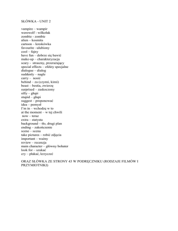 SŁÓWKA - UNIT 2 vampire – wampir werewolf - wilkołak zombie - zombie alien – kosmita cartoon – kreskówka favourite –ulubiony cool – fajny have fun – dobrze się bawić make-up – charakteryzacja scary - straszny, przerażający special effects – efekty specjalne dialogue – dialog suddenly – nagle carry – nosić behind – za (czymś, kimś) beast – bestia, zwierzę surprised – zaskoczony silly – głupi stupid – głupi suggest – proponować idea – pomysł I’m in – wchodzę w to at the moment – w tej chwili now – teraz extra – statysta background – tło, drugi plan ending – zakończenie scene – scena take pictures – robić zdjęcia important – ważny review – recenzja main character – główny bohater look for – szukać cry – płakać, krzyczeć ORAZ SŁÓWKA ZE STRONY 43 W PODRĘCZNIKU (RODZAJE FILMÓW I PRZYMIOTNIKI)