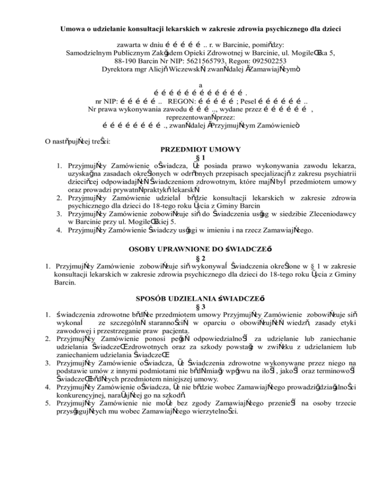 Umowa o udzielanie konsultacji lekarskich w zakresie zdrowia psychicznego dla dzieci zawarta w dniu …………….. r. w Barcinie, pomiędzy: Samodzielnym Publicznym Zakładem Opieki Zdrowotnej w Barcinie, ul. Mogileńska 5, 88-190 Barcin Nr NIP: 5621565793, Regon: 092502253 Dyrektora mgr Alicję Wiczewską, zwaną dalej „Zamawiającym” a ………………………………. nr NIP: …………….. REGON: ……………; Pesel ……………….. Nr prawa wykonywania zawodu ……….., wydane przez ……………… , reprezentowaną przez: ……………………., zwaną dalej „Przyjmującym Zamówienie” O następującej treści: 1. 2. 3. 4. PRZEDMIOT UMOWY §1 Przyjmujący Zamówienie oświadcza, że posiada prawo wykonywania zawodu lekarza, uzyskał na zasadach określonych w odrębnych przepisach specjalizację z zakresu psychiatrii dziecięcej odpowiadającą świadczeniom zdrowotnym, które mają być przedmiotem umowy oraz prowadzi prywatną praktykę lekarską. Przyjmujący Zamówienie udzielać będzie konsultacji lekarskich w zakresie zdrowia psychicznego dla dzieci do 18-tego roku życia z Gminy Barcin Przyjmujący Zamówienie zobowiązuje się do świadczenia usług w siedzibie Zleceniodawcy w Barcinie przy ul. Mogileńskiej 5. Przyjmujący Zamówienie świadczy usługi w imieniu i na rzecz Zamawiającego. OSOBY UPRAWNIONE DO ŚWIADCZEŃ §2 1. Przyjmujący Zamówienie zobowiązuje się wykonywać świadczenia określone w § 1 w zakresie konsultacji lekarskich w zakresie zdrowia psychicznego dla dzieci do 18-tego roku życia z Gminy Barcin. 1. 2. 3. 4. 5. SPOSÓB UDZIELANIA ŚWIADCZEŃ §3 Świadczenia zdrowotne będące przedmiotem umowy Przyjmujący Zamówienie zobowiązuje się wykonać ze szczególną starannością, w oparciu o obowiązującą wiedzę, zasady etyki zawodowej i przestrzeganie praw pacjenta. Przyjmujący Zamówienie ponosi pełną odpowiedzialność za udzielanie lub zaniechanie udzielania świadczeń zdrowotnych oraz za szkody powstałe w związku z udzielaniem lub zaniechaniem udzielania świadczeń. Przyjmujący Zamówienie oświadcza, że świadczenia zdrowotne wykonywane przez niego na podstawie umów z innymi podmiotami nie będą miały wpływu na ilość, jakość oraz terminowość świadczeń będących przedmiotem niniejszej umowy. Przyjmujący Zamówienie oświadcza, że nie będzie wobec Zamawiającego prowadził działalności konkurencyjnej, narażającej go na szkodę. Przyjmujący Zamówienie nie może bez zgody Zamawiającego przenieść na osoby trzecie przysługujących mu wobec Zamawiającego wierzytelności. §4 1. Przyjmujący Zamówienie współpracuje z innymi podmiotami i pracownikami zatrudnionymi u Zamawiającego w celu prawidłowej diagnozy, leczenia i pielęgnacji chorych. 2. Przyjmujący Zamówienie zobowiązuje się do przestrzegania zasad udzielania świadczeń zdrowotnych zgodnie ze standardami ustalonymi przez Zamawiającego oraz Narodowy Fundusz Zdrowia a także zgodnie z zasadami wynikającymi z ustawy o zawodzie lekarza, Kodeksu Etyki Lekarskiej i Praw Pacjenta. §5 1. Przyjmujący Zamówienie oświadcza, że znane są mu zasady wystawiania recept i w związku z tym zobowiązuje się do ich wystawiania zgodnie z tymi zasadami. 2. W przypadku wystawienia przez Przyjmującego Zamówienie recept niezgodnie z zasadami i obciążeniem w związku z tym Zamawiającego przez Narodowy Fundusz Zdrowia kosztami refundacji tych recept, Zamawiający obciąży Przyjmującego zamówienie tymi kosztami, potrącając należność z tego tytułu z najbliższego wynagrodzenia należnego Przyjmującemu Zamówienie. W przypadku wcześniejszego rozwiązania umowy, Zamawiający dochodzić będzie zapłaty wyżej wskazanej należności przez Przyjmującego zamówienie na zasadach ogólnych. §6 1. Przyjmujący zamówienie zobowiązuje się do przestrzegania zasad określających organizację i porządek procesu udzielania świadczeń zdrowotnych u Zamawiającego, wynikających z przepisów powszechnie obowiązujących oraz zawartych przez niego umów, a także z regulaminów, zarządzeń i instrukcji obowiązujących u Zamawiającego. 2. Przyjmujący zamówienie zobowiązuje się do przestrzegania przepisów bhp i ppoż. obowiązujących w miejscu udzielania świadczenia. 1. 2. 3. 4. UBEZPIECZENIE OD ODPOWIEDZIALNOŚCI CYWILNEJ §7 Przyjmujący zamówienie zobowiązany jest do posiadania ubezpieczenia od odpowiedzialności cywilnej w zakresie, o którym mowa w § 1, na zasadach określonych w rozporządzeniu Ministra Finansów z dnia 22 grudnia 2011 r. w sprawie obowiązkowego ubezpieczenia odpowiedzialności cywilnej podmiotu wykonującego działalność leczniczą (DZ. U. Nr 293, poz. 1729 ze zm.) lub innego aktu prawnego, który obowiązywać będzie w jego miejsce, z okresem ubezpieczenia od dnia wejścia w życie umowy do końca okresu jej obowiązywania. Zawierając niniejszą umowę Przyjmujący zamówienie załącza do umowy uwierzytelnioną kopię polisy ubezpieczeniowej. Przyjmujący Zamówienie solidarnie z Zamawiającym ponosi odpowiedzialność wobec roszczeń pacjentów i ich rodzin. Przyjmujący zamówienie oświadcza, że spełnia wymagania zdrowotne, przewidziane dla osób udzielających świadczeń zdrowotnych, które określone są w odrębnych przepisach, że posiada i dostarczy Zamawiającemu kopię orzeczenia lekarskiego stwierdzające brak przeciwwskazań zdrowotnych do udzielania świadczeń zdrowotnych określonych w umowie. DOKUMENTACJA MEDYCZNA §8 1. W zakresie wykonywania umowy Przyjmujący Zamówienie zobowiązuje się w szczególności do: a) prowadzenia dokumentacji medycznej i statystycznej obowiązującej u Zamawiającego oraz dokumentacji określonej w odrębnych przepisach, b) rejestrowania i przetwarzania danych osobowych zgodnie z powszechnie obowiązującymi przepisami, c) sporządzania innych sprawozdań. 2. Zmiany sposobu prowadzenia sprawozdawczości, zestawień, dokumentacji nie p