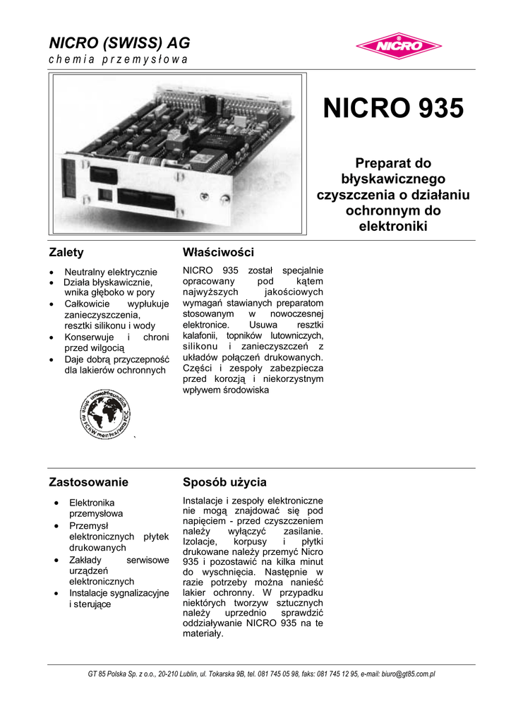 NICRO (SWISS) AG chemia przemysłowa NICRO 935 Preparat do błyskawicznego czyszczenia o działaniu ochronnym do elektroniki Zalety Właściwości • • NICRO 935 został specjalnie opracowany pod kątem najwyższych jakościowych wymagań stawianych preparatom stosowanym w nowoczesnej elektronice. Usuwa resztki kalafonii, topników lutowniczych, silikonu i zanieczyszczeń z układów połączeń drukowanych. Części i zespoły zabezpiecza przed korozją i niekorzystnym wpływem środowiska Neutralny elektrycznie Działa błyskawicznie, wnika głęboko w pory Całkowicie wypłukuje zanieczyszczenia, resztki silikonu i wody Konserwuje i chroni przed wilgocią Daje dobrą przyczepność dla lakierów ochronnych • • • ` Zastosowanie • • • • Elektronika przemysłowa Przemysł elektronicznych płytek drukowanych Zakłady serwisowe urządzeń elektronicznych Instalacje sygnalizacyjne i sterujące Sposób użycia Instalacje i zespoły elektroniczne nie mogą znajdować się pod napięciem - przed czyszczeniem należy wyłączyć zasilanie. Izolacje, korpusy i płytki drukowane należy przemyć Nicro 935 i pozostawić na kilka minut do wyschnięcia. Następnie w razie potrzeby można nanieść lakier ochronny. W przypadku niektórych tworzyw sztucznych należy uprzednio sprawdzić oddziaływanie NICRO 935 na te materiały. GT 85 Polska Sp. z o.o., 20-210 Lublin, ul. Tokarska 9B, tel. 081 745 05 98, faks: 081 745 12 95, e-mail: [email protected] Dane techniczne Nicro 935 Preparat do czyszczenia elektroniki Własności fizykochemiczne Postać Kolor: Zapach: Lepkość w temp. 200 C Gęstość w temp. 200 C Temperatura zapłonu Przewodność elektryczna: Rozpuszczalność w wodzie: ciecz, aerozol bezbarwny - przezroczysty cytrynowy 10 s (kubek Forda 100 ml, 4 mm) 0,75 g/cm3 - 56 0C nie przewodzi częściowo rozpuszczalny Informacje dotyczące uregulowań prawnych Określenie rodzaju zagrożenia: F, N R11 - 52/53 – 66 - 67 Informacje ekologiczne Usuwanie odpadów: Kod odpadu produktu 14 06 03* Kod opakowania 16 05 04* Sposób likwidacji zebranych odpadów uzgodnić z Wydziałem Ochrony Środowiska Urzędu Wojewódzkiego. Usuwać zgodnie z Ustawą o odpadach Dz. U. Nr 62, poz. 628 z 27.04.2001 r. wraz z późniejszymi zmianami lub powierzyć usuwanie specjalistycznej firmie utylizacyjnej. Opakowania: Aerozol 400 ml Producent: NICRO (SWISS) AG CH.9469 Haag SG Tel.: 081 / 750 36 80 Faks: 081 / 750 36 90 Importer: GT 85 Polska Sp. z o.o. 20-210 Lublin, ul. Tokarska 9B Tel.: 081 / 745 05 98 Faks: 081 / 745 12 95 Dane zawarte w tym arkuszu mają charakter informacyjny i zostały zebrane według najlepszej wiedzy i dotychczasowego doświadczenia. Nie możemy przejmować żadnej odpowiedzialność za rezultaty u osób trzecich, gdyż warunki i stosowane metody znajdują się poza naszą kontrolą.